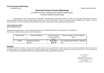 Starosta Powiatu Mieleckiego GD.6620.67.2015 Mielec, dnia 2015-08-18 Informacja Starosty Powiatu Mieleckiego w sprawie czynności ustalenia granic działek ewidencyjnych z wniosku Geodety Uprawnionego Na podstawie art. 7d i 22 ustawy z dnia 17 maja 1989 r. Prawo geodezyjne i kartograficzne (Dz.U. tj. z 2015 r. poz. 520 z późn. zmianami) oraz § 38 ust.2 pkt.4 Rozporządzenia Ministra Rozwoju Regionalnego i Budownictwa z dnia 29 marca 2001 r. w sprawie ewidencji gruntów i budynków (Dz.U. z 2001 r. Nr 38, poz. 454 oraz z 2013 r. poz.1551), informuję o przeprowadzeniu czynności ustalenia granic działek ewidencyjnych położonych w: obręb ewidencyjny: Izbiska gmina: Wadowice Górne Wykonawca prac geodezyjnych: Usługi Geodezyjne Krzysztof Baca 39-308 Wadowice Górne, Wampierzów 45, tel. 606307443 Kierownik prac: Geodeta Uprawniony mgr inż. Krzysztof Baca Numery działek 1195/2 Właściciel/władający Bronisława Wrzesień Zgórsko Termin rozpoczęcia czynności ustalenia granic Miejsce rozpoczęcia czynności ustalenia granic 16.09.2015 r. godz. 930 Przy zabudowaniach Izbiska nr adresowy 29A Pouczenie: W interesie Pana (Pani) jest udział w tych czynnościach, osobiście lub przez swojego przedstawiciela. Osoby biorące udział w czynnościach ustalenia granic powinny posiadać dokument tożsamości, a w przypadku występowania w charakterze przedstawiciela – pełnomocnictwo na piśmie. Dokument świadczący o pełnomocnictwie zostanie dołączony do akt. Nieusprawiedliwione niestawiennictwo stron nie wstrzymuje czynności ustalenia granic działek ewidencyjnych. Z up. STAROSTY Jan Wilk DYREKTOR WYDZIAŁU GEODEZJI, KARTOGRAFII I KATASTRU GEODETA POWIATOWY