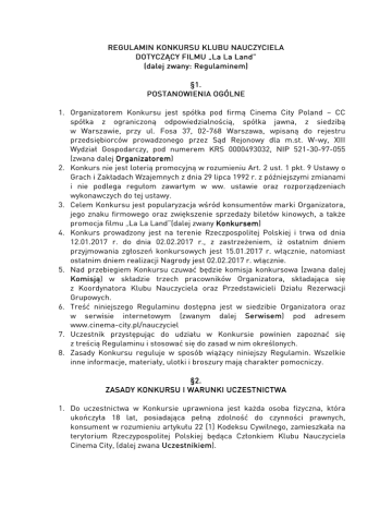 REGULAMIN KONKURSU KLUBU NAUCZYCIELA DOTYCZĄCY DO TYCZĄCY FILMU „La „La La Land” Land” (dalej zwany: Regulaminem) §1. POSTANOWIENIA OGÓLNE 1. Organizatorem Konkursu jest spółka pod firmą Cinema City Poland – CC spółka z ograniczoną odpowiedzialnością, spółka jawna, z siedzibą w Warszawie, przy ul. Fosa 37, 02-768 Warszawa, wpisaną do rejestru przedsiębiorców prowadzonego przez Sąd Rejonowy dla m.st. W-wy, XIII Wydział Gospodarczy, pod numerem KRS 0000493032, NIP 521-30-97-055 (zwana dalej Organizatorem) Organizatorem 2. Konkurs nie jest loterią promocyjną w rozumieniu Art. 2 ust. 1 pkt. 9 Ustawy o Grach i Zakładach Wzajemnych z dnia 29 lipca 1992 r. z późniejszymi zmianami i nie podlega regułom zawartym w ww. ustawie oraz rozporządzeniach wykonawczych do tej ustawy. 3. Celem Konkursu jest popularyzacja wśród konsumentów marki Organizatora, jego znaku firmowego oraz zwiększenie sprzedaży biletów kinowych, a także promocja filmu „La La Land”(dalej zwany Konkursem Konkursem) sem 4. Konkurs prowadzony jest na terenie Rzeczpospolitej Polskiej i trwa od dnia 12.01.2017 r. do dnia 02.02.2017 r., z zastrzeżeniem, iż ostatnim dniem przyjmowania zgłoszeń konkursowych jest 15.01.2017 r. włącznie, natomiast ostatnim dniem realizacji Nagrody jest 02.02.2017 r. włącznie. 5. Nad przebiegiem Konkursu czuwać będzie komisja konkursowa (zwana dalej Komisją) Komisją w składzie trzech pracowników Organizatora, składająca się z Koordynatora Klubu Nauczyciela oraz Przedstawicieli Działu Rezerwacji Grupowych. 6. Treść niniejszego Regulaminu dostępna jest w siedzibie Organizatora oraz w serwisie internetowym (zwanym dalej Serwisem) Serwisem pod adresem www.cinema-city.pl/nauczyciel 7. Uczestnik przystępując do udziału w Konkursie powinien zapoznać się z treścią Regulaminu i stosować się do zasad w nim określonych. 8. Zasady Konkursu reguluje w sposób wiążący niniejszy Regulamin. Wszelkie inne informacje, materiały, ulotki i broszury mają charakter pomocniczy. §2. ZASADY KONKURSU I WARUNKI WARUNKI UCZESTNICTWA 1. Do uczestnictwa w Konkursie uprawniona jest każda osoba fizyczna, która ukończyła 18 lat, posiadająca pełną zdolność do czynności prawnych, konsument w rozumieniu artykułu 22 [1] Kodeksu Cywilnego, zamieszkała na terytorium Rzeczypospolitej Polskiej będąca Członkiem Klubu Nauczyciela Cinema City, (dalej zwana Uczestnikiem). Uczestnikiem 2. Z możliwości uczestniczenia w Konkursie wykluczeni są pracownicy i członkowie organów Spółki Cinema City Poland - CC Sp. z o.o. Spółka jawna z siedzibą w Warszawie przy ul. Fosa 37, 00-678 Warszawa, Spółki ALL JOB POLAND CC SP Z O. O. Spółka Komandytowo Akcyjna, z siedzibą w Warszawie, ul. Wołoska 12, 02-675 Warszawa oraz członkowie ich najbliższej rodziny. Przez „członków najbliższej rodziny” należy rozumieć wstępnych, zstępnych, rodzeństwo, małżonka oraz osoby pozostające w stosunku przysposobienia. Przez „pracowników” rozumie się także osoby wykonujące usługi na rzecz ww. podmiotów na podstawie umów cywilnoprawnych. 3. Organizator ma prawo opublikowania w Serwisie i w mediach danych Uczestników w dowolnym momencie Konkursu i po jego zakończeniu. §3. ORGANIZACJA KONKURSU 1. Aby wziąć udział w Konkursie Uczestnik powinien: 1.1. W terminie od 12.01.2017 r. do 15.01.2017 r. do godziny 23.59 wysłać na adres e-mail: [email protected] odpowiedź na pytanie konkursowe: Niezapomniane pary filmowe.. Podziel się z nami opinią opinią o najbardziej charyzmatycznym ekranowym duecie miłosnym według Ciebie., Ciebie., (dalej zwaną Odpowiedzią konkursową). konkursową 1.2. W tytule bądź w treści maila, o którym mowa w ppkt. 1.1.1 należy wpisać hasło „La La Land” oraz nazwę jednego z 20 miast, w których znajduje się kino Cinema City (dalej zwane Kinem), Kinem w którym będzie zrealizowana Nagroda. 1.3. Odpowiedź na pytanie konkursowe nie powinno przekroczyć ilości 2000 znaków łącznie ze spacjami. 1.4. Pod uwagę będą brane tylko te Odpowiedzi konkursowe, które spełniają wymogi określone w Regulaminie, zostaną zgłoszone we wskazanym terminie oraz na wskazany w punkcie 1.1.1 adres mailowy. 1.5. Lista miast, o których mowa w pkt. 1.1.2: Warszawa Łódź Lublin Kraków Katowice Gliwice Sosnowiec Rybnik Poznań Częstochowa Ruda Śląska Gdańsk Toruń Wrocław Bydgoszcz Zielona Góra Bielsko-Biała Bytom Wałbrzych Starogard Gdański 2. Uczestnik może dokonać tylko jednego zgłoszenia w Konkursie, które jest równe szansie na jedną Nagrodę przewidzianą w Konkursie. §4. ZASADY PRZYZNAWANIA NAGRÓD 1. Zwycięzcami konkursu zostaną autorzy 20 najciekawszych odpowiedzi. Nagrodę otrzyma jedna osoba w każdym z 20 miast, której odpowiedź zostanie wybrana przez komisję składającą się z Koordynatora Klubu Nauczyciela oraz Przedstawicieli Działu Rezerwacji Grupowych. 2. Do celów Konkursu Organizator ufundował 20 podwójnych zaproszeń (jedno podwójne zaproszenie w każdym z 20 miast, których lista znajduje się w §3 ppkt.1.1.5, dalej zwana Nagrodą) Nagrodą na repertuarowe seanse filmu „La La Land” w Kinach Cinema City. Repertuar znajduje się na stronie www.cinema-city.pl. Termin realizacji Nagrody: od 23.01.2017 r. do dnia 02.02.2017 r. włącznie, zaproszenia mogą być zrealizowane podczas seansów kinowych realizowanych od poniedziałku do czwartku. 3. Lista zwycięzców zostanie ogłoszona do dnia 20.01.2017 r. włącznie. Uczestnicy, którzy zwyciężyli zgodnie z § 4 ust. 1 Regulaminu zwani są dalej Laureatami. 4. Nagrody nie podlegają wymianie na ekwiwalent pieniężny, ani żadną inną formę gratyfikacji. Laureaci nie mają prawa zastrzeżenia szczególnych właściwości Nagród. 5. Uczestnik nie może przenieść prawa do Nagród na osobę trzecią. 6. O dalszym przeznaczeniu nagród nieprzyznanych i / lub nieodebranych decyduje Organizator. 7. Organizator może ufun