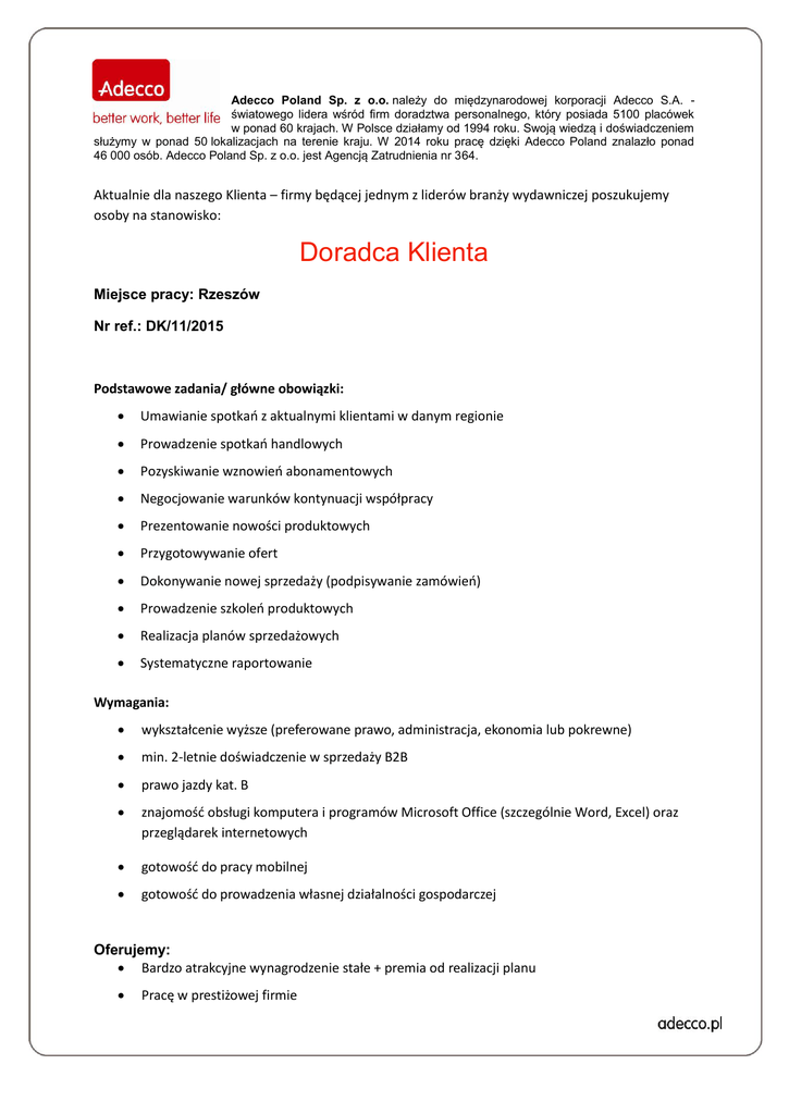 Adecco Poland Sp. z o.o. należy do międzynarodowej korporacji Adecco S.A. światowego lidera wśród firm doradztwa personalnego, który posiada 5100 placówek w ponad 60 krajach. W Polsce działamy od 1994 roku. Swoją wiedzą i doświadczeniem służymy w ponad 50 lokalizacjach na terenie kraju. W 2014 roku pracę dzięki Adecco Poland znalazło ponad 46 000 osób. Adecco Poland Sp. z o.o. jest Agencją Zatrudnienia nr 364. Aktualnie dla naszego Klienta – firmy będącej jednym z liderów branży wydawniczej poszukujemy osoby na stanowisko: Doradca Klienta Miejsce pracy: Rzeszów Nr ref.: DK/11/2015 Podstawowe zadania/ główne obowiązki: Umawianie spotkań z aktualnymi klientami w danym regionie Prowadzenie spotkań handlowych Pozyskiwanie wznowień abonamentowych Negocjowanie warunków kontynuacji współpracy Prezentowanie nowości produktowych Przygotowywanie ofert Dokonywanie nowej sprzedaży (podpisywanie zamówień) Prowadzenie szkoleń produktowych Realizacja planów sprzedażowych Systematyczne raportowanie Wymagania: wykształcenie wyższe (preferowane prawo, administracja, ekonomia lub pokrewne) min. 2-letnie doświadczenie w sprzedaży B2B prawo jazdy kat. B znajomość obsługi komputera i programów Microsoft Office (szczególnie Word, Excel) oraz przeglądarek internetowych gotowość do pracy mobilnej gotowość do prowadzenia własnej działalności gospodarczej Oferujemy: Bardzo atrakcyjne wynagrodzenie stałe + premia od realizacji planu Pracę w prestiżowej firmie Możliwość poszerzania umiejętności Pracę z profesjonalistami w przyjaznej atmosferze samochód służbowy (również do celów prywatnych) karta paliwowa na laptop telefon zdalny internet prywatna opieka medyczna karta Multisport Zainteresowane osoby prosimy o przesłanie swojej aplikacji zawierającej CV (w tytule maila proszę wpisać nazwę stanowiska) na adres: [email protected] Jednocześnie informujemy, iż skontaktujemy się wyłącznie z wybranymi kandydatami. Prosimy o dopisanie następującej klauzuli: Wyrażam zgodę na przetwarzanie moich danych osobowych zawartych w mojej ofercie pracy dla potrzeb niezbędnych do realizacji procesu rekrutacji (zgodnie z ustawą z dn. 29.08.97 roku o Ochronie Danych Osobowych Dz. Ust Nr 133 poz. 883).