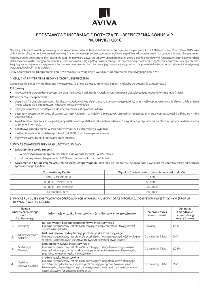 PODSTAWOWE INFORMACJE DOTYCZĄCE UBEZPIECZENIA BONUS VIP PI/BONVIP/1/2016 Niniejszy dokument został opracowany przez Aviva Towarzystwo Ubezpieczeń na Życie SA, zgodnie z wymogiem Art. 22 Ustawy z dnia 11 września 2015 roku o działalności ubezpieczeniowej i reasekuracyjnej. Stanowi materiał pomocniczy, opisujący główne zagadnienia dotyczące zasad funkcjonowania tego ubezpieczenia. Prosimy o zwrócenie szczególnej uwagi na fakt, że decyzja o zawarciu umowy ubezpieczenia na życie z ubezpieczeniowymi funduszami kapitałowymi (dalej UFK) powinna zostać podjęta po wcześniejszym zapoznaniu się z pełną dokumentacją ubezpieczeniową (zwłaszcza z ogólnymi warunkami ubezpieczenia). Znajdują się w niej m.in. szczegółowe informacje o przedmiocie ubezpieczenia, jego zakresie i wyłączeniach odpowiedzialności, a także o strategii inwestycyjnej poszczególnych UFK oraz opłatach. Pełny opis warunków Ubezpieczenia Bonus VIP znajduje się w ogólnych warunkach Ubezpieczenia Inwestycyjnego Bonus VIP. 1. CELE, CHARAKTER ORAZ GŁÓWNE CECHY UBEZPIECZENIA Ubezpieczenie Bonus VIP ma charakter inwestycyjny. To oferta dla osób, które mają kapitał i chciałyby go skutecznie zainwestować. Cel główny: • inwestowanie zgromadzonego kapitału oraz możliwość przekazania kapitału wybranym przez Ubezpieczonego osobom, w razie jego śmierci. Główne cechy ubezpieczenia: • dostęp do 11 ubezpieczeniowych funduszy kapitałowych (na dzień zawarcia umowy ubezpieczenia) oraz możliwość podejmowania decyzji o ich zmianie (może wiązać się z dodatkowymi kosztami, wskazanymi dalej), • jedynym warunkiem przystąpienia do ubezpieczenia jest opłacenie składki, • bezpłatny dostęp do 10 proc. aktualnej wartości kapitału – w każdym z pierwszych czterech lat ubezpieczenia oraz wypłaty całości środków po 4 roku ubezpieczenia, • świadczenie w razie śmierci nie podlega opodatkowaniu podatkiem od spadków i darowizn – zgodnie z przepisami prawa obowiązującymi na dzień wejścia w życie tej informacji, • dodatkowe zabezpieczenie w razie śmierci wskutek nieszczęśliwego wypadku, • możliwość wpłacania dodatkowych kwot (od 1000 zł) w dowolnym momencie, • możliwość zarządzania funduszami przez Internet. 2. WYKAZ ŚWIADCZEŃ PRZYSŁUGUJĄCYCH Z UMOWY • świadczenie z tytułu śmierci: – w pierwszym roku ubezpieczenia: 100 zł oraz wartość rachunku w dniu śmierci, – od drugiego roku ubezpieczenia: 103% wartości rachunku na dzień śmierci. • świadczenie z tytułu śmierci wskutek nieszczęśliwego wypadku (ochrona do ukończenia 70. roku życia): wysokość świadczenia zależy od wartości zgromadzonego kapitału. Zgromadzony Kapitał Wysokość świadczenia z tytułu śmierci wskutek NW 5 000 zł - 49 999,99 zł 10 000 zł 50 000 zł - 99 999,99 zł 50 000 zł 100 000 zł - 499 999,99 zł 100 000 zł od 500 000,00 zł 150 000 zł 3. WYKAZ FUNDUSZY KAPITAŁOWYCH OFEROWANYCH W RAMACH UMOWY ORAZ INFORMACJA O RYZYKU INWESTYCYJNYM (PROFILU RYZYKA INWESTYCYJNEGO) Nazwa ubezpieczeniowego funduszu kapitałowego 1. Pieniężny 2. Dłużny Aktywnej Selekcji 3. Stabilnego Wzrostu 4. Stabilny Aktywnej Selekcji Informacja o ryzyku inwestycyjnym (profilu ryzyka inwestycyjnego) Bardzo wysoki poziom bezpieczeństwa inwestycyjnego Fundusz przeznaczony jest dla osób ceniących bezpieczeństwo i trwały wzrost swoich oszczędności. Niski (okresowo podwyższony) poziom ryzyka inwestycyjnego Fundusz przeznaczony jest dla osób oczekujących wzrostu oszczędności w długim terminie i akceptujących okresowo podwyższone ryzyko inwestycyjne. Niski poziom ryzyka inwestycyjnego Fundusz przeznaczony jest dla osób oczekujących długoterminowego wzrostu oszczędności na poziomie przekraczającym oprocentowanie lokat bankowych, przy nieco wyższym ryzyku inwestycyjnym. Średnie ryzyko inwestycyjne Fundusz przeznaczony jest dla osób oczekujących długoterminowo stabilnego wzrostu oszczędności na poziomie przekraczającym oprocentowanie lokat bankowych, przy wyższym ryzyku inwestycyjnym, związanym z inwestowaniem części aktywów funduszu na rynku akcji. Zalecany okres inwestowania Opłata za zarządzanie i administrację (w skali roku) Dowolny 1,5% Co najmniej 2 lata 0%1 Co najmniej 2 lata 2,25% Co najmniej 3 lata 0%1 1 Nazwa ubezpieczeniowego funduszu kapitałowego 5. Zrównoważony 6. Zrównoważony Aktywnej Selekcji 7. Międzynarodowy 8. Spółek Dywidendowych 9. 10. 11. 1 Akcji Dynamiczny Dynamiczny Aktywnej Selekcji Opłata za zarządzanie i administrację (w skali roku) Zalecany okres inwestowania Informacja o ryzyku inwestycyjnym (profilu ryzyka inwestycyjnego) Podwyższone ryzyko inwestycyjne Fundusz przeznaczony jest dla osób akceptujących podwyższone ryzyko inwestycyjne, oczekujących długoterminowego wzrostu wartości inwestycji. Podwyższone ryzyko inwestycyjne Fundusz przeznaczony jest dla osób akceptujących wysokie ryzyko inwestycyjne i oczekujących wysokich dochodów z inwestycji. Wysokie ryzyko inwestycyjne Fundusz przeznaczony jest dla osób oczekujących w długim terminie wzrostu oszczędności głównie z inwestycji na rynkach zagranicznych Wysokie ryzyko inwestycyjne Fundusz przeznaczony jest dla osób akceptujących wysokie ryzyko inwestycyjne i oczekujących maksymalizacji dochodów z inwestycji w długim terminie. Wysokie ryzyko inwestycyjne Fundusz przeznaczony jest dla osób akceptujących wysokie ryzyko inwestycyjne, których celem jest maksymalizacja dochodów z inwestycji w długim horyzoncie inwestycyjnym. Co najmniej 4 lata 2,75% Co najmniej 3 lata 0%1 Co najmniej 5 lat 2,5% Co najmniej 5 lat 3% Co najmniej 5 lat Co najmniej 5 lat 3,25% 3,25% Co najmniej 5 lat 0%1 w związku z inwestowaniem pośrednim w certyfikaty inwestycyjne lub jednostki uczestnictwa w funduszach inwestycyjnych mających siedzibę na obszarze Polski albo tytuły uczestnictwa emitowane przez instytucje wspólnego inwestowania mające siedzibę za