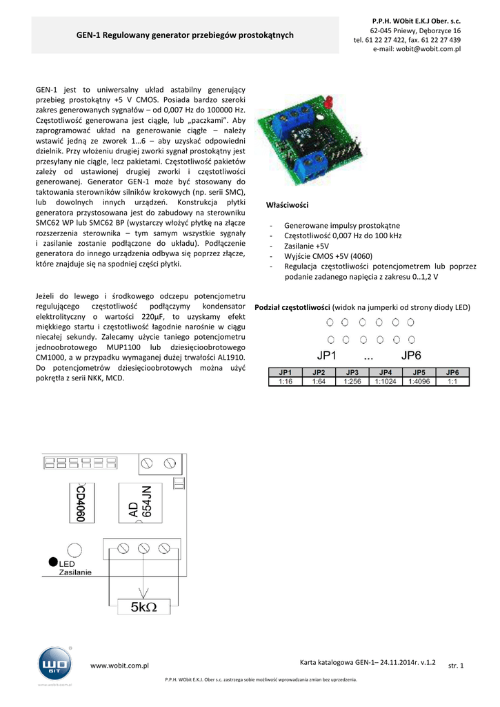 P.P.H. WObit E.K.J Ober. s.c. 62-045 Pniewy, Dęborzyce 16 tel. 61 22 27 422, fax. 61 22 27 439 e-mail: [email protected] GEN-1 Regulowany generator przebiegów prostokątnych GEN-1 jest to uniwersalny układ astabilny generujący przebieg prostokątny +5 V CMOS. Posiada bardzo szeroki zakres generowanych sygnałów – od 0,007 Hz do 100000 Hz. Częstotliwość generowana jest ciągle, lub „paczkami”. Aby zaprogramować układ na generowanie ciągłe – należy wstawić jedną ze zworek 1…6 – aby uzyskać odpowiedni dzielnik. Przy włożeniu drugiej zworki sygnał prostokątny jest przesyłany nie ciągle, lecz pakietami. Częstotliwość pakietów zależy od ustawionej drugiej zworki i częstotliwości generowanej. Generator GEN-1 może być stosowany do taktowania sterowników silników krokowych (np. serii SMC), lub dowolnych innych urządzeń. Konstrukcja płytki generatora przystosowana jest do zabudowy na sterowniku SMC62 WP lub SMC62 BP (wystarczy włożyć płytkę na złącze rozszerzenia sterownika – tym samym wszystkie sygnały i zasilanie zostanie podłączone do układu). Podłączenie generatora do innego urządzenia odbywa się poprzez złącze, które znajduje się na spodniej części płytki. Jeżeli do lewego i środkowego odczepu potencjometru regulującego częstotliwość podłączymy kondensator elektrolityczny o wartości 220µF, to uzyskamy efekt miękkiego startu i częstotliwość łagodnie narośnie w ciągu niecałej sekundy. Zalecamy użycie taniego potencjometru jednoobrotowego MUP1100 lub dziesięcioobrotowego CM1000, a w przypadku wymaganej dużej trwałości AL1910. Do potencjometrów dziesięcioobrotowych można użyć pokrętła z serii NKK, MCD. www.wobit.com.pl Właściwości - Generowane impulsy prostokątne Częstotliwość 0,007 Hz do 100 kHz Zasilanie +5V Wyjście CMOS +5V (4060) Regulacja częstotliwości potencjometrem lub poprzez podanie zadanego napięcia z zakresu 0..1,2 V Podział częstotliwości (widok na jumperki od strony diody LED) Karta katalogowa GEN-1– 24.11.2014r. v.1.2 P.P.H. WObit E.K.J. Ober s.c. zastrzega sobie możliwość wprowadzania zmian bez uprzedzenia. str. 1