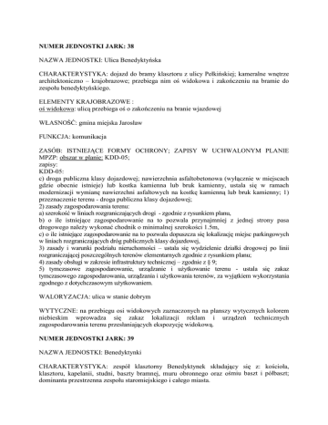NUMER JEDNOSTKI JARK: 38 NAZWA JEDNOSTKI: Ulica Benedyktyńska CHARAKTERYSTYKA: dojazd do bramy klasztoru z ulicy Pełkińskiej; kameralne wnętrze architektoniczno – krajobrazowe; przebiega nim oś widokowa i zakończeniu na bramie do zespołu benedyktyńskiego. ELEMENTY KRAJOBRAZOWE : oś widokowa: ulicą przebiega oś o zakończeniu na branie wjazdowej WŁASNOŚĆ: gmina miejska Jarosław FUNKCJA: komunikacja ZASÓB: ISTNIEJĄCE FORMY OCHRONY; ZAPISY W UCHWALONYM PLANIE MPZP: obszar w planie: KDD-05; zapisy: KDD-05: c) droga publiczna klasy dojazdowej; nawierzchnia asfaltobetonowa (wyłącznie w miejscach gdzie obecnie istnieje) lub kostka kamienna lub bruk kamienny, ustala się w ramach modernizacji wymianę nawierzchni asfaltowych na kostkę kamienną lub bruk kamienny; 1) przeznaczenie terenu - droga publiczna klasy dojazdowej; 2) zasady zagospodarowania terenu: a) szerokość w liniach rozgraniczających drogi - zgodnie z rysunkiem planu, b) o ile istniejące zagospodarowanie na to pozwala przynajmniej z jednej strony pasa drogowego naleŜy wykonać chodnik o minimalnej szerokości 1.5m, c) o ile istniejące zagospodarowanie na to pozwala dopuszcza się lokalizację miejsc parkingowych w liniach rozgraniczających dróg publicznych klasy dojazdowej, 3) zasady i warunki podziału nieruchomości – ustala się wydzielenie działki drogowej po linii rozgraniczającej poszczególnych terenów elementarnych zgodnie z rysunkiem planu; 4) zasady obsługi w zakresie infrastruktury technicznej – zgodnie z § 9; 5) tymczasowe zagospodarowanie, urządzanie i uŜytkowanie terenu - ustala się zakaz tymczasowego zagospodarowania, urządzania i uŜytkowania terenów, za wyjątkiem wykorzystania zgodnego z dotychczasowym uŜytkowaniem. WALORYZACJA: ulica w stanie dobrym WYTYCZNE: na przebiegu osi widokowych zaznaczonych na planszy wytycznych kolorem niebieskim wprowadza się zakaz lokalizacji reklam i urządzeń technicznych zagospodarowania terenu przesłaniających ekspozycję widokową. NUMER JEDNOSTKI JARK: 39 NAZWA JEDNOSTKI: Benedyktynki CHARAKTERYSTYKA: zespół klasztorny Benedyktynek składający się z: kościoła, klasztoru, kapelanii, studni, baszty bramnej, muru obronnego oraz ośmiu baszt i półbaszt; dominanta przestrzenna zespołu staromiejskiego i całego miasta. ELEMENTY KRAJOBRAZOWE : dominanty: w skali całego miasta: kościół p.w. św. Mikołaja; w skali wnętrza: brama do zespołu benedyktyńskiego; baszta (nr 7) fortyfikacji zespołu benedyktyńskiego WŁASNOŚĆ: związki wyznaniowe FUNKCJA: kult religijny ; ew. gospodarcza (na potrzeby klasztoru) ZASÓB: ISTNIEJĄCE FORMY OCHRONY; ZAPISY W UCHWALONYM PLANIE MPZP: obiekty w rejestrze zabytków: kościół p.w. śś. Mikołaja i Stanisława, klasztor, baszta bramna, mur, baszty i półbaszty - A - 7/35; obiekty w ewidencji: studnia, kapelania; stanowiska AZP nr: 1 – wzgórze Św. Mikołaja – ślad osadnictwa – neolit; ślad osadnictwa – kultura przeworska; grodzisko; ślad osadnictwa z cmentarzem średniowiecznym – okres średniowiecza (XI-XIII w.); klasztor SS Benedyktynek z cmentarzem – XV-XVIII w. Stanowisko wpisane do rej. zabytków pod nr A-716/452 z 28.12.1968 r.; obszar w planie: A-Uk-8; zapisy: A-Uk-8: przeznaczenie terenu a) podstawowe – usługi sakralne (dawne Opactwo Sióstr Benedyktynek z kościołem śś. Mikołaja i Stanisława), b) dopuszczalna: – zabudowa mieszkaniowa na potrzeby klasztoru, – usługi nieuciąŜliwe towarzyszące funkcji podstawowej; 2) zasady kształtowania zabudowy i zagospodarowania terenu: a) ustala się zachowanie historycznego rozplanowania zespołu klasztornego SS Benedyktynek, b) zabrania się wszelkiej przebudowy, rozbudowy lub modernizacji budynku kościoła stanowiącego dominantę architektoniczną zmieniających gabaryty budynku, kształt dachu, wystrój architektoniczny, c) zabrania się wszelkiej rozbudowy murów i baszt zespołu klasztornego zmieniającej gabaryty murów i baszt, kształt dachu na basztach, wystrój architektoniczny, d) wszelkie prace budowlane na zewnątrz budynku kościoła oraz murów i baszt klasztornych mogą dotyczyć wyłącznie prac mających na celu utrzymanie dobrego stanu obiektów budowlanych, oraz utrzymania i lokalizowania obiektów infrastruktury telekomunikacyjnej w sposób niekolidujący z wizualnym odbiorem zabytków, e) zabrania się nakładania tynków na mury obronne i baszty zespołu klasztornego, f) minimalna powierzchnia biologicznie czynna w liniach rozgraniczających terenu elementarnego – 70% powierzchni terenu elementarnego, g) maksymalny wskaźnik intensywności zabudowy – 0.3, h) maksymalna wysokość zabudowy mieszkalnej i usług nieuciąŜliwych do głównej kalenicy dachu – 12 m, i) ilość kondygnacji zabudowy mieszkalnej i usług nieuciąŜliwych nie większa niŜ 3 kondygnacje nadziemne w tym jedna w poddaszu uŜytkowym, j) maksymalna wysokość zabudowy gospodarczej i garaŜowej do głównej kalenicy dachu – 5 m, k) ustala się zachowanie pokrycia dachu na budynku kościoła dachówką ceramiczną lub blachą miedzianą zgodnie ze stanem istniejącym, l) dachy na budynkach mieszkalnych i usług nieuciąŜliwych – dwuspadowe lub wielospadowe o kącie nachylenia połaci od 30 º do 45 º, przy czym główne połacie dachu muszą mieć jednakowy spadek lub dachy polskie łamane, m) pokrycie dachu na budynkach mieszkalnych i usług nieuciąŜliwych – dachówka ceramiczna, n) elewacje zewnętrzne – tynki w kolorach pastelowych dopuszcza się elewacje z cegły ceramicznej nietynkowane zgodnie ze stanem istniejącym, o) budynki gospodarcze i garaŜowe w zakresie kształtu i pokrycia dachu oraz koloru elewacji zewnętrznej dostosowane do zabudowy mieszkalnej i usługowej, p) powierzchnie biologicznie czynną naleŜy zagospodarować zielenią urządzoną , q) zachować jednorzędową aleję drzew wzdłuŜ głównej drogi załoŜenia klasztornego, r) zabrania się grodzenia terenu ogrodzeniami