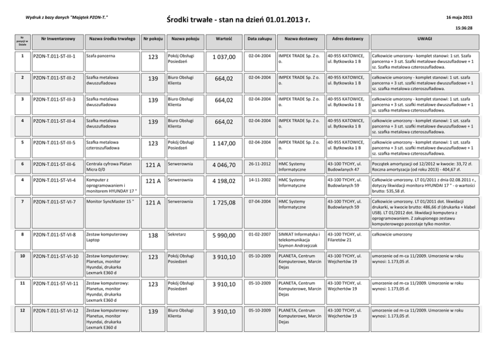 Wydruk z bazy danych "Majątek PZON-T." 16 maja 2013 Środki trwałe - stan na dzień 01.01.2013 r. 15:36:28 Nr pozycji w Dziale Nr Inwentarzowy Nazwa środka trwałego Nr pokoju Nazwa pokoju Wartość Data zakupu Nazwa dostawcy Adres dostawcy UWAGI 1 PZON-T.011-ST-III-1 Szafa pancerna 123 Pokój Obsługi Posiedzeń 1 037,00 02-04-2004 IMPEX TRADE Sp. Z o. o. 40-955 KATOWICE, ul. Bytkowska 1 B Całkowicie umorzony - komplet stanowi: 1 szt. Szafa pancerna + 3 szt. Szafki metalowe dwuszufladowe + 1 sz. Szafka metalowa czteroszufladowa. 2 PZON-T.011-ST-III-2 Szafka metalowa dwuszufladowa 139 Biuro Obsługi Klienta 664,02 02-04-2004 IMPEX TRADE Sp. Z o. o. 40-955 KATOWICE, ul. Bytkowska 1 B całkowicie umorzony - komplet stanowi: 1 szt. szafa pancerna + 3 szt. szafki metalowe dwuszufladowe + 1 sz. szafka metalowa czteroszufladowa. 3 PZON-T.011-ST-III-3 Szafka metalowa dwuszufladowa 139 Biuro Obsługi Klienta 664,02 02-04-2004 IMPEX TRADE Sp. Z o. o. 40-955 KATOWICE, ul. Bytkowska 1 B całkowicie umorzony - komplet stanowi: 1 szt. szafa pancerna + 3 szt. szafki metalowe dwuszufladowe + 1 sz. szafka metalowa czteroszufladowa. 4 PZON-T.011-ST-III-4 Szafka metalowa dwuszufladowa 139 Biuro Obsługi Klienta 664,02 02-04-2004 IMPEX TRADE Sp. Z o. o. 40-955 KATOWICE, ul. Bytkowska 1 B całkowicie umorzony - komplet stanowi: 1 szt. szafa pancerna + 3 szt. szafki metalowe dwuszufladowe + 1 sz. szafka metalowa czteroszufladowa. 5 PZON-T.011-ST-III-5 Szafka metalowa czteroszufladowa 123 Pokój Obsługi Posiedzeń 1 147,00 02-04-2004 IMPEX TRADE Sp. Z o. o. 40-955 KATOWICE, ul. Bytkowska 1 B całkowicie umorzony - komplet stanowi: 1 szt. szafa pancerna + 3 szt. szafki metalowe dwuszufladowe + 1 sz. szafka metalowa czteroszufladowa. 6 PZON-T.011-ST-III-6 Centrala cyfrowa Platan Micra 0/0 121 A Serwerownia 4 046,70 26-11-2012 HMC Systemy Informatyczne 43-100 TYCHY, ul. Budowlanych 47 Początek amortyzacji od 12/2012 w kwocie: 33,72 zł. Roczna amortyzacja (od roku 2013) - 404,67 zł. 4 PZON-T.011-ST-VI-4 Komputer z oprogramowaniem i monitorem HYUNDAY 17 " 121 A Serwerownia 4 198,02 14-11-2002 HMC Systemy Informatyczne 43-100 TYCHY, ul. Budowlanych 59 Całkowicie umorzony. LT 01/2011 z dnia 02.08.2011 r., dotyczy likwidacji monitora HYUNDAI 17 " - o wartości brutto: 535,58 zł. 7 PZON-T.011-ST-VI-7 Monitor SyncMaster 15 " 121 A Serwerownia 1 725,08 07-04-2004 HMC Systemy Informatyczne 43-100 TYCHY, ul. Budowlanych 59 Całkowicie umorzony. LT 01/2011 dot. likwidacji drukarki, w kwocie brutto: 486,66 zł (drukarka + klabel USB). LT 01/2012 dot. likwidacji komputera z oprogramowaniem. Z zakupionego zestawu komputerowego pozostaje tylko monitor. 8 PZON-T.011-ST-VI-8 Zestaw komputerowy Laptop 138 Sekretarz 5 990,00 01-02-2007 SIMKAT Informatyka i telekomunikacja Szymon Andrzejczak 43-100 TYCHY, ul. Filaretów 21 całkowicie umorzony 10 PZON-T.011-ST-VI-10 Zestaw komputerowy: Planetux, monitor Hyundai, drukarka Lexmark E360 d 123 Pokój Obsługi Posiedzeń 3 910,10 05-10-2009 PLANETA, Centrum Komputerowe, Marcin Dejas 43-100 TYCHY, ul. Wejchertów 19 umorzenie od m-ca 11/2009. Umorzenie w roku wynosi: 1.173,05 zł. 11 PZON-T.011-ST-VI-11 Zestaw komputerowy: Planetux, monitor Hyundai, drukarka Lexmark E360 d 123 Pokój Obsługi Posiedzeń 3 910,10 05-10-2009 PLANETA, Centrum Komputerowe, Marcin Dejas 43-100 TYCHY, ul. Wejchertów 19 umorzenie od m-ca 11/2009. Umorzenie w roku wynosi: 1.173,05 zł. 12 PZON-T.011-ST-VI-12 Zestaw komputerowy: Planetux, monitor Hyundai, drukarka Lexmark E360 d 139 Biuro Obsługi Klienta 3 910,10 05-10-2009 PLANETA, Centrum Komputerowe, Marcin Dejas 43-100 TYCHY, ul. Wejchertów 19 umorzenie od m-ca 11/2009. Umorzenie w roku wynosi: 1.173,05 zł. Nr pozycji w Dziale Nr Inwentarzowy Nazwa środka trwałego Nr pokoju Nazwa pokoju Wartość Data zakupu Nazwa dostawcy Adres dostawcy UWAGI 13 PZON-T.011-ST-VI-13 Kserokopiarka DEVELOP ineo 222, z dupleksem i podstawką 123 Pokój Obsługi Posiedzeń 9 760,00 07-10-2009 BEN Zbigniew Dziczkowski 43-100 TYCHY, ul. Runowa 21 umorzenie od m-ca 11/2009. Umorzenie w roku wynosi: 1.366,40 zł 14 PZON-T.011-ST-VI-14 Zestaw komputerowy z oprogramowaniem Laptop DELL 121 Przewodniczący 3 845,59 04-12-2009 HMC Systemy Informatyczne, Helena Czempisz 43-100 TYCHY, ul. Budowlanych 47 umorzenie od m-ca 01/2010. Umorzenie w roku wynosi: 1.153,68 zł. 15 PZON-T.011-ST-VI-15 Serwer z oprogramowaniem 121 A Serwerownia 9 943,00 19-12-2007 LOGON SA 85-098 BYDGOSZCZ, umorzenie od m-ca 01/2008. Umorzenie w roku ul. Piotrowskiego 7-9 wynosi: 2.982,90 zł. Całkowicie umorzony w roku 2012. 16 PZON-T.011-ST-VI-16 Sieć systemu teleinformatycznego 121 A Serwerownia 7 819,50 13-04-2006 SIMKAT Informatyka i telekomunikacja Szymon Andrzejczak 43-100 TYCHY, Al. Piłsudskiego 30/61 całkowicie umorzony 20 PZON-T.011-ST-VI-20 Urządzenie popdnoszące poziom bezpieczeństwa sieci informatycznej 121 A Serwerownia 3 687,01 11-09-2012 ARSO Komputery Paweł Jeliński 43-100 TYCHY, ul. Bacha 3 a. Umorzenie od X/2012, w kwocie: 276,50 zł. Od roku 2013 umorzenie w kwocie: 1106 zł. 21 PZON-T.011-ST-VI-21 Notebook HP 474s + office 2010 123 Pokój Obsługi Posiedzeń 4 047,00 25-10-2012 ARSO Komputery Paweł Jeliński 43-100 TYCHY, ul. Bacha 3 a. Umorzenie od XI/2012, w kwocie: 203,50 zł. Od roku 2013 umorzenie w kwocie: 1221 zł. 18 PZON-T.011-ST-VI-18 Laptop z oprogramowaniem 138 Sekretarz 4 848,00 13-12-2011 ARSO Komputery Paweł Jeliński 43-100 TYCHY, ul. Bacha 3a V3750 SILVER 17,3" WLED HD i3-2330M 2GB 320 GB BT3.0 Win 7 pro. OEM Office 2010 Professional PL PKC 269-14850. Umorzenie od 01/2012. Amortyzacja roczna w kwocie: 1.454,40 zł 19 PZON-T.011-ST-VI-19 Laptop z oprogramowaniem 123 Pokój Obsługi Posiedzeń 4 049,00 13-12-2011 ARSO Komputery Paweł Jeliński 43-100 TYCHY, ul. Bacha 3a V3750 SILVER 17,3" WLED HD i3-2330M 2GB 320 GB BT3.0 Win 7 pro. OEM Office 2010 Home&Business PKC. Umorzenie od 01/2012. Amortyzacja roczna w kwocie: 1.214,70 zł 17 PZON-T.011-ST-VI-17 Urz