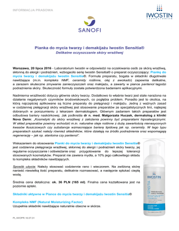 INFORMACJA PRASOWA Pianka do mycia twarzy i demakijażu Iwostin Sensitia® Delikatne oczyszczanie skóry wrażliwej Warszawa, 20 lipca 2016 - Laboratorium Iwostin w odpowiedzi na oczekiwania osób ze skórą wrażliwą, skłonną do alergii i podrażnień, wzbogaciło serię Iwostin Sensitia® o preparat oczyszczający: Piankę do mycia twarzy i demakijażu Iwostin Sensitia®. Formuła preparatu, bogata w składniki długotrwale nawilżające (m.in. kompleks NMF, ceramidy roślinne, olej z awokado) zapewnia delikatne, a zarazem skuteczne zmywanie zanieczyszczeń oraz makijażu, a zawarty w piance pantenol łagodzi podrażnienia skóry. Skuteczność formuły została potwierdzona badaniami aplikacyjnymi. Nadmierna wrażliwość dotyczy głównie skóry twarzy. Dodatkowo to właśnie twarz jest stale narażona na działanie negatywnych czynników środowiskowych, co pogłębia problem. Ponadto jest to okolica, na którą najczęściej aplikowane są liczne preparaty do pielęgnacji i makijażu. Jedną z ważnych zasad w codziennej pielęgnacji skóry wrażliwej jest stosowanie preparatów ze specjalistycznych linii, najlepiej dobranych w porozumieniu z lekarzem dermatologiem. Głównym zadaniem takich preparatów jest odbudowa bariery naskórkowej. Jak podkreśla dr n. med. Małgorzata Huczek, dermatolog z kliniki Nova Derm: „Kosmetyki do skóry wrażliwej z założenia powinny być preparatami hipoalergicznymi. W skład preparatów powinny wchodzić m.in. naturalne oleje roślinne z dużą zawartością nienasyconych kwasów tłuszczowych czy substancje wzmacniające barierę lipidową jak np. ceramidy. W tego typu preparatach szukać należy również składników, które działają na źródło podrażnienia oraz wspomagają regenerację – jak np. alantoina czy pantenol”. Wskazaniem do stosowania Pianki do mycia twarzy i demakijażu Iwostin Sensitia® jest codzienna pielęgnacja wrażliwej, skłonnej do alergii i podrażnień skóry twarzy, jej regularne oczyszczanie i odświeżanie oraz przygotowanie do lepszej tolerancji stosowanych kosmetyków. Preparat nie zawiera mydła, a 10% jego całkowitego składu to kompleks składników nawilżających. Sposób użycia: Należy stosować codziennie rano i wieczorem. Na zwilżoną skórę nanieść niewielką ilość preparatu, delikatnie rozmasować, a następnie spłukać ciepłą wodą. Średnia cena detaliczna: ok. 36 PLN (165 ml). Finalna cena kształtowana jest na poziomie apteki. Składniki aktywne w Piance do mycia twarzy i demakijażu Iwostin Sensitia® Kompleks NMF (Natural Moisturizing Factor) Uzupełnia składniki nawilżające naturalnie obecne w skórze. PL.IWOPR.16.07.01 INFORMACJA PRASOWA Pantenol Doskonale przenika przez naskórek i dociera do jego głębszych warstw. Łagodzi podrażnienia i poprawia skład lipidowy skóry, przez co nawilża i zapobiega szorstkości. Ceramidy roślinne Odbudowują strukturę lipidową warstwy rogowej naskórka, zapewniając jej prawidłowe nawilżenie i spoistość. Olej z awokado Natłuszcza skórę i dostarcza lipidy, przez co ogranicza utratę wody z naskórka i uelastycznia go. Informacje o Sanofi Firma Sanofi, działający na skalę globalną lider sektora farmaceutycznego, zajmuje się odkrywaniem, opracowywaniem i upowszechnianiem rozwiązań terapeutycznych, które zaspokajają potrzeby pacjentów. Sanofi jest zorganizowana w pięć globalnych Business Unitów: Diabetes & Cardiovascular, General Medicines & Emerging Markets, Sanofi Genzyme, Sanofi Pasteur i Merial. Firma Sanofi jest notowana na giełdach w Paryżu (EURONEXT: SAN) i Nowym Jorku (NYSE: SNY). Do Sanofi w Polsce należą: Sanofi-Aventis Sp. z o.o. – producent leków innowacyjnych i OTC (bez recepty), Sanofi Pasteur, największy na świecie producent szczepionek, Zentiva – lider produkcji leków generycznych w Europie Środkowo-Wschodniej, Nepentes Pharma, uznana spółka działająca w branży dermokosmetycznej, Genzyme, producent leków stosowanych w chorobach rzadkich oraz Merial, światowy lider w branży weterynaryjnej. Jedna z 112 fabryk Sanofi na świecie, jest zlokalizowana w Rzeszowie. Sanofi w Polsce zatrudnia ponad 1000 pracowników. Według danych IMS Health Polska, Sanofi zajmuje jedno z wiodących miejsc w krajowym rankingu największych firm farmaceutycznych. Więcej informacji na: www.sanofi.pl Sanofi Polska @SanofiPolska Dodatkowych informacji udziela: Alicja JABŁOŃSKA - KRZYWY PR Manager Dermocosmetics TEL.: +48 22 280 82 45 - CELL.: +48 724 247 245 e-mail: [email protected] ul. BONIFRATERSKA 17, 00-203 WARSZAWA, Poland PL.IWOPR.16.07.01