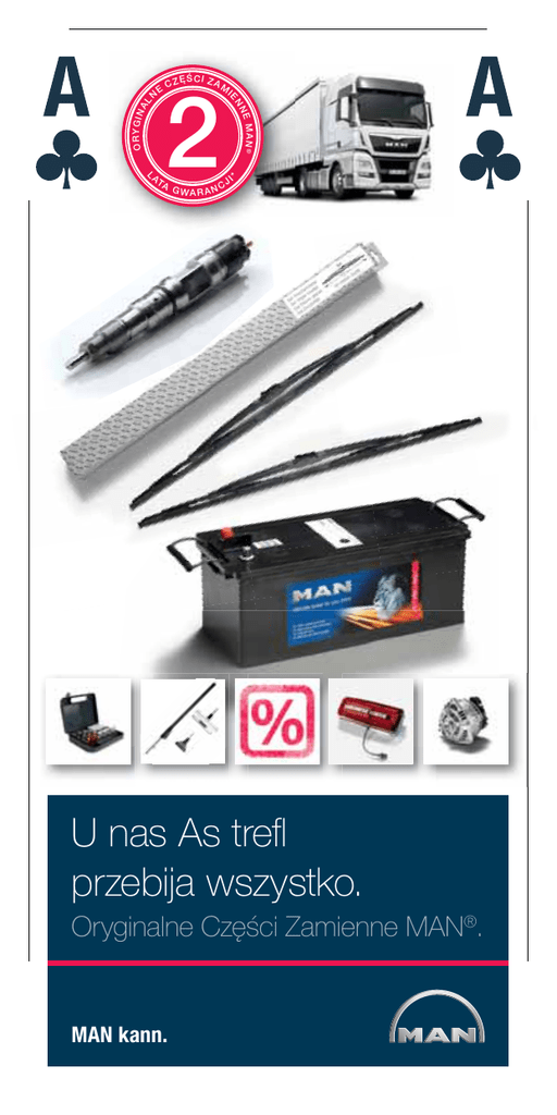 M 2 A GWARANC I JI * L Ę Ś CI Z A ® E MAN L AT CZ NN O RY GIN A E E N U nas As trefl przebija wszystko. Oryginalne Części Zamienne MAN®. MAN kann. Najlepsze karty dla Ciebie. e. Nasze Asy na rok 2016. Oryginalne Części Zamienne MAN®. Oferta promocyjna: już od Mocna karta na koniec roku. As trefl przebija wszystko. W ramach kampanii od 1 października do 31 grudnia 2016 r. proponujemu Państwu kolejny zestaw Oryginalnych Części Zamiennych MAN® w najatrakcyjniejszej ofercie. Zima Cię nie zaskoczy. Nasza doświadczona i wykwalifikowana kadra serwisowa oraz wysokiej jakości Oryginalne Części Zamienne MAN® zapewnią Tobie jeszcze większe bezpieczeństwo oraz niezawodność na drodze. Wykorzystaj okazję i odwiedź nas osobiście lub na stronie www.mantruckandbus.pl, aby uzyskać więcej informacji o ofertach promocyjnych usług serwisowych oraz wyjątkowej jakości Oryginalnych Części Zamiennych MAN®. 175,zł Zestaw żarówek już od 170,zł Teleskopowa skrobaczko -ściągaczka ąg już od 260,zł Od 1 października do 31 grudnia 2016 r. oferujemy usługi serwisowe i Oryginalne Części Zamienne MAN ® w obniżonych cenach. Światło tylne już od 1160,zł Wtryskiwacz już od 90,zł Komplet piór wycieraczek 700 mm już od 15,zł Środek odmrażający do szyb już od 1250,zł Światło tylne LED już od 1170,zł Alternator Wszystkie ceny netto. Zadbaj o układ wtryskowy z MAN. Ę Ś CI Z A M 2 A GWARANC I JI * L AT CZ ® E MAN O RY GIN A E NN N E L Maksymalna skuteczność w najniższych temperaturach. Teraz oryginalne akumulatory MAN w atrakcyjnych cenach. Zima to okres kiedy na szczególną uwagę zasługuje układ wtryskowy w silnikach Common Rail. Temperatury poniżej 0°C mogą powodować zamarzanie paliwa i w konsekwencji doprowadzić do uszkodzenia elementów układu wtryskowego paliwa. Jeżeli w swoim pojeździe zaobserwowałeś nadmierne dymienie lub znaczny spadek mocy to najczęstszą przyczyną problemu są uszkodzone wtryskiwacze. Tylko teraz! Sieć Serwisowa MAN Truck & Bus Polska oferuje swoim klientom ceny specjalne na wymianę wtryskiwaczy. W ramach dostępnych pakietów serwisowych oprócz wtryskiwaczy wymienimy w Twoim pojeździe także filtry paliwa oraz króćce ciśnieniowe. LATARK A I MULTITOOL GR ATIS!** Okres zimowy dla akumulatora to czas ekstremalnych warunków pracy i dużych obciążeń. Jeśli oczekujesz najwyższej wydajności, niezawodności i trwałości – oryginalne akumulatory MAN są najlepszym wyborem. Standardowa cena wymiany 6-ciu wtryskiwaczy w Autoryzowanych Stacjach Obsługi MAN to: 11415,PLN netto Przygotuj swoje pojazdy MAN na wszelkie ewentualności. Od 01.10.2016 do 31.12.2016 oferujemy Państwu atrakcyjne rabaty na oryginalne akumulatory MAN. Tylko do 31.12.2016 roku za wybrane pakiety serwisowe zapłacisz Tylko teraz! 8600,PLN netto Przy zakupie kompletu akumulatorów latarka i multitool gratis.** Akumulator 155 Ah 685,00 PLN netto Akumulator 175 Ah 765,00 PLN netto Akumulator 225 Ah 995,00 PLN netto Naprawa w Autoryzowanej Stacji Obsługi MAN to gwarancja najwyższej jakości oferowanych produktów i wysokiego standardu świadczonych usług. 2 lata gwarancji bez limitu przebiegu kilometrów Twoja Autoryzowana Stacja Obsługi MAN: +1 RÓB ZAKUPY, ZBIERAJ PUNKTY I ODBIERAJ NAGRODY W PROGRAMIE MAN TRUCKER’S WORLD. WWW.MAN-TRUCKERS-WORLD.PL Tekst i ilustracje nie są wiążące. Zastrzega się możliwość zmian podyktowanych postępem technicznym. Oferta ważna od 01.10. do 31.12.2016 r. lub do odwołania. W przypadku znaczacej zmiany kursu EUR/PLN cena detaliczna moze ulec zmianie. Wiecej informacji u doradców serwisowych Twojej Autoryzowanej Stacji Obsługi MAN. * Oferta obowiązuje w Autoryzowanych Stacjach Obsługi MAN Truck & Bus na terenie Polski biorących udział w akcji promocyjnej. Dotyczy sprzedaży części zamiennych wraz z wymianą, zrealizowanej na podstawie faktury VAT z dopiskiem „Sprzedaż i montaż objęte promocją 2 lata gwarancji zgodnie z Ogólnymi Warunkami Gwarancyjnymi”. ** Przy zakupie kompletu akumulatorów latarka i multitool z logo MAN gratis! Komplet oznacza zakup 2 akumulatorów o tej samej pojemności. MAN Truck & Bus Polska Sp. z o.o. al. Katowicka 9, Wolica 05-830 Nadarzyn www.mantruckandbus.pl Spółka Grupy MAN Truck & Bus