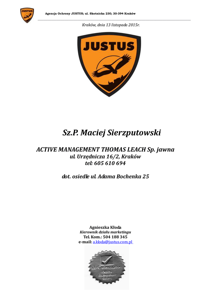 Agencja Ochrony JUSTUS; ul. Skotnicka 230; 30-394 Kraków ____________________________________________________________________________________________________________ Kraków, dnia 13 listopada 2015r. Sz.P. Maciej Sierzputowski ACTIVE MANAGEMENT THOMAS LEACH Sp. jawna ul. Urzędnicza 16/2, Kraków tel: 605 610 694 dot. osiedle ul. Adama Bochenka 25 Agnieszka Kłoda Kierownik działu marketingu Tel. Kom.: 504 188 345 e-mail: [email protected] Agencja Ochrony JUSTUS; ul. Skotnicka 230; 30-394 Kraków ____________________________________________________________________________________________________________ Agencja Ochrony JUSTUS; ul. Skotnicka 230; 30-394 Kraków ____________________________________________________________________________________________________________ O FIRMIE W imieniu AGENCJI OCHRONY JUSTUS mam przyjemność zaoferować Państwu nasze usługi w zakresie zabezpieczenia mienia. W treści niniejszej oferty znajdą Państwo szczegółowe informacje na temat Grupy JUSTUS, prowadzonej przez nas działalności, potencjału ludzkiego oraz wykorzystywanych środków technicznych. Firma JUSTUS posiada wieloletnie doświadczenie w dziedzinie ochrony osób i mienia, czego wyrazem jest współpraca z tysiącami Klientów na terenie całej Polski. Jesteśmy firmą wykorzystującą innowacyjne i nowoczesne rozwiązania w zakresie ochrony, należycie wykonującą powierzone zadania. Naszą wiarygodność oraz wysoki standard świadczonych usług potwierdzają posiadane certyfikaty w tym ISO 9001: 2008 oraz liczne referencje. Agencja Ochrony JUSTUS współpracuje z wiarygodnym Towarzystwem Ubezpieczeniowym Warta S.A. w zakresie odpowiedzialności cywilnej kontraktowo deliktowej. Głównym zakresem naszej działalności jest ochrona fizyczna stała lub doraźna, ochrona elektroniczna obiektów poprzez monitorowanie systemów alarmowych i telewizji przemysłowej CCTV oraz ich projektowanie i montaż. Systemy ochrony wspierane są usługą polegającą na interwencji Grup Szybkiego Reagowania. Świadczymy również wysokiej klasy usługi utrzymania czystości. Świadcząc usługi ochrony fizycznej stosujemy opracowaną przez nas metodę ochrony aktywnej, która w skrócie polega na połączeniu systemu komunikacji, kontroli, nadzoru i wsparcia udzielanego pracownikom ochrony stacjonarnej przez wyspecjalizowane patrole interwencyjne. Dzięki niej żaden z naszych pracowników nie jest pozostawiony sam wobec zagrożenia - w krótkim czasie otrzymuje specjalistyczne wsparcie. Wieloletnia obecność na rynku ochrony zaowocowała ścisłą współpracą z Policją i Strażą Miejską, co w znacznym stopniu przyczynia się do zwiększania bezpieczeństwa naszych Klientów. Pracownicy ochrony oraz utrzymania czystości przechodzą staranną procedurę selekcyjną, co pozwala na dobór osób dysponujących odpowiednim przygotowaniem, wiedzą, umiejętnościami oraz predyspozycjami. Jako jedna z nielicznych firm, świadczymy kompleksowe usługi na terenie całego kraju w zakresie: • Organizacji i prowadzenia stacjonarnej ochrony fizycznej; • Ochrony spotkań firmowych, • Ochrony imprez masowych; • Usługi recepcyjne, portierskie oraz obsługa parkingów; • Monitorowania lokalnych systemów alarmowych; • Usługi porządkowe (sprzątanie obiektów oraz utrzymanie terenów zewnętrznych); • Monitoring GPS pojazdów, maszyn i urządzeń; • Monitorowania wizyjnych systemów telewizji przemysłowej; Agencja Ochrony JUSTUS; ul. Skotnicka 230; 30-394 Kraków ____________________________________________________________________________________________________________ • Całodobowych serwisów gwarancyjnych i pogwarancyjnych oraz przeglądów konserwacyjnych elektronicznych systemów zabezpieczenia; • Projektowania i montażu elektronicznych systemów zabezpieczeń: telewizji przemysłowej i mobilnych systemów monitoringu wizyjnego, alarmowych, kontroli dostępu; • Interwencji Grup Szybkiego Reagowania; • Konwojowania wartości pieniężnych i przedmiotów wartościowych; • Doradztwa i projektowania systemów ochrony obiektów, w tym opracowywanie planów ochrony obiektów, zgodnie z wymogami Ustawy z dnia 22.08.1997 r. o ochronie osób i mienia (Dz. U. Nr 114 poz. 740); • Szkolenia pracowników ochrony do egzaminu na licencję I i II stopnia. Do realizacji tych usług posiadamy: • Dział Techniczny zajmujący się projektowaniem i instalacją systemów alarmowych i telewizji przemysłowej; • Dział Logistyki, którego głównym celem jest szybka realizacja zamówień; • Dział Ochrony Fizycznej realizujący całodobowo stałą i doraźną ochronę osób i mienia; • Dział Monitoringu (Całodobowe Komputerowe Alarmowe Centra Odbiorcze i Centrum Monitoringu Wizyjnego, wraz z Grupami Szybkiego Reagowania w dyżurze 24 godzinnym); • Dział Usług Utrzymania Czystości. Nasz profesjonalizm i skuteczność w działaniu potwierdzają Klienci, niektórzy chronieni przez nas od początku naszej działalności. Są wśród nich firmy duże i znane jak też małe przedsiębiorstwa rodzinne i osoby prywatne. Służymy naszą ochroną wszystkim, niezależnie od wielkości z taką samą starannością i gwarantowaną jakością usług. Agencja Ochrony JUSTUS; ul. Skotnicka 230; 30-394 Kraków ____________________________________________________________________________________________________________ OCHRONA FIZYCZNA – STAŁA, DORAŹNA Nasi pracownicy przechodzą staranną procedurę selekcyjną, sprawdzani są pod względem poprzednich miejsc pracy, karalności jak i predyspozycji do wykonywania zawodu agenta ochrony. Przed przystąpieniem do pracy przechodzą przeszkolenie zakończone sprawdzianem kwalifikacyjnym. Stosujemy wysokie kryteria doboru pracowników, co pozwala nam na wyselekcjonowanie osób dysponujących odpowiednimi kwalifikacjami. Ponadto zatrudnieni pracownicy są systematycznie szkoleni w celu podwyższania kwalifikacji zawodowych. KONTROLA ORAZ STRUKTURA ORGANI