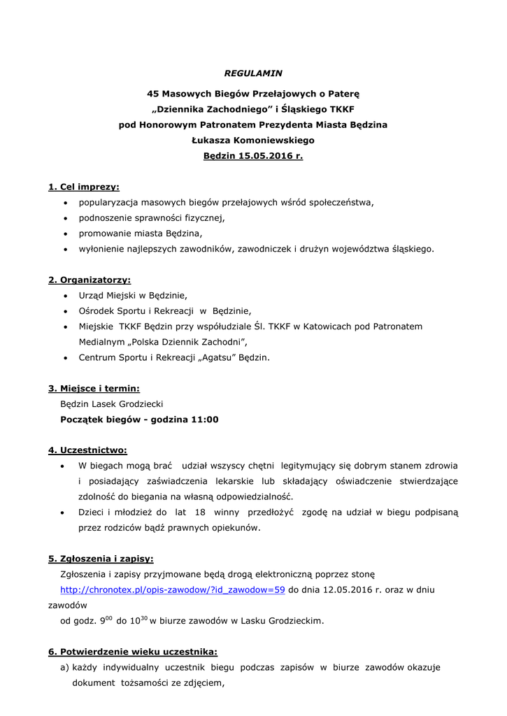 REGULAMIN 45 Masowych Biegów Przełajowych o Paterę „Dziennika Zachodniego” i Śląskiego TKKF pod Honorowym Patronatem Prezydenta Miasta Będzina Łukasza Komoniewskiego Będzin 15.05.2016 r. 1. Cel imprezy: popularyzacja masowych biegów przełajowych wśród społeczeństwa, podnoszenie sprawności fizycznej, promowanie miasta Będzina, wyłonienie najlepszych zawodników, zawodniczek i drużyn województwa śląskiego. 2. Organizatorzy: Urząd Miejski w Będzinie, Ośrodek Sportu i Rekreacji w Będzinie, Miejskie TKKF Będzin przy współudziale Śl. TKKF w Katowicach pod Patronatem Medialnym „Polska Dziennik Zachodni”, Centrum Sportu i Rekreacji „Agatsu” Będzin. 3. Miejsce i termin: Będzin Lasek Grodziecki Początek biegów - godzina 11:00 4. Uczestnictwo: W biegach mogą brać udział wszyscy chętni legitymujący się dobrym stanem zdrowia i posiadający zaświadczenia lekarskie lub składający oświadczenie stwierdzające zdolność do biegania na własną odpowiedzialność. Dzieci i młodzież do lat 18 winny przedłożyć zgodę na udział w biegu podpisaną przez rodziców bądź prawnych opiekunów. 5. Zgłoszenia i zapisy: Zgłoszenia i zapisy przyjmowane będą drogą elektroniczną poprzez stonę http://chronotex.pl/opis-zawodow/?id_zawodow=59 do dnia 12.05.2016 r. oraz w dniu zawodów od godz. 900 do 1030 w biurze zawodów w Lasku Grodzieckim. 6. Potwierdzenie wieku uczestnika: a) każdy indywidualny uczestnik biegu podczas zapisów w biurze zawodów okazuje dokument tożsamości ze zdjęciem, b) przy zapisach zbiorowych pisemnych zgłoszeń zawodników (do odpowiedniej kategorii wiekowej) dokonuje i podpisuje kierownik drużyny. Zgłoszenia winny zawierać następujące dane: Imię i nazwisko, data urodzenia, nazwa drużyny, miejscowość, pieczęć i podpis kierownika drużyny. c) każdy startujący ma prawo weryfikacji wieku osób z nim biegających do 10 minut po zakończeniu biegu 7. Wpisowe : udział w biegu jest bezpłatny. 8.Kategorie wiekowe (roczniki) i dystanse: Kategoria I dziewczęta 2003 i młodsze - (13 lat i młodsze) - 700 m. (1 pętla) Kategoria II chłopcy 2003 i młodsi - (13 lat i młodsi) - 700 m. (1 pętla) Kategoria III dziewczęta 2000 - 2002 - (14 - 16 lat) - 1.400 m. (2 pętle) Kategoria IV chłopcy 2000 - 2002 - (14 - 16 lat) - 1.400 m. (2 pętle) Kategoria V kobiety 1999 - 1977 - (17 - 39 lat) - 3.000 m. (1 pętla) Kategoria VI kobiety 1976 i starsze - (40 lat i starsze) - 3.000 m. (1 pętla) Kategoria VII mężczyźni 1999 - 1981 - (17 - 35 lat) - 6.000 m. (2 pętle) Kategoria VIII mężczyźni 1980 - 1967 - (36 - 49 lat) - 6.000 m. (2 pętle) Kategoria IX mężczyźni 1966 - 1957 - (50 - 59 lat) - 6.000 m. (2 pętle) Kategoria X mężczyźni 1956 i starsi - (60 lat i starsi) - 3.000 m. (1 pętla) DOPUSZCZALNA TOLERANCJA W KAŻDYM BIEGU +/- 100m. 9. Klasyfikacja: a) indywidualna: I m. - 50 pkt II m. - 43 pkt III m. - 37 pkt IV - 32 pkt m. - 29 pkt VI m. - 26 pkt VII m. - 24 pkt VIII m. - 23 pkt IX m. - 22 pkt V m. itd. malejąco w dół o 1 pkt aż do miejsca XXX – 1 pkt Każdy zawodnik zbiera punkty dla drużyny którą reprezentuje w dniu biegu b) drużynowa : sumuje się punkty indywidualne zawodników i zawodniczek danej drużyny z każdej kategorii wiekowej. 10.Wyróżnienia i nagrody 1. Każdy uczestnik biegu otrzymuje pamiątkowy medal. 2. W klasyfikacji indywidualnej, w każdej kategorii wiekowej: I - III m. medal, dyplom 3. W klasyfikacji drużynowej: I - VI m. puchar i dyplom 4. Statuetka i dyplom dla: - dla najmłodszej zawodniczki - najmłodszego zawodnika - najstarszej zawodniczki - najstarszego zawodnika. 11.Protesty: Protesty można składać do Zarządu Śląskiego TKKF w nieprzekraczalnym terminie o 3 dni po umieszczeniu komunikatu o wynikach biegu na stronie internetowej Śląskiego TKKF – www.slaskietkkf.tnb.pl 12. Postanowienia końcowe: organizator zapewnia profesjonalny pomiar czasu, trasa nie posiada atestu PZLA, uczestnicy biegów przyjeżdżają na własny koszt, organizator udostępnia namioty na szatnie dla uczestników biegu, za rzeczy pozostawione w namiotach organizator nie odpowiada, organizator zapewnia opiekę medyczną podczas biegu, organizator zapewnia wodę mineralną, gorącą herbatę i batoniki dla startujących zawodników, organizator zapewnia ubezpieczenie zawodników, bieg odbędzie się niezależnie od warunków atmosferycznych, uczestnik wyraża zgodę na opublikowanie na łamach strony internetowej i w informacjach medialnych przez Organizatora i Gminę Będzin wizerunku oraz imienia i nazwiska uczestnika, uczestnik wyraża zgodę na przetwarzanie danych osobowych podanych w oświadczeniu odnośnie stanu zdrowia/formularzu zgoda na udział dzieci i młodzieży do lat 18 w biegu podpisanym przez rodziców bądź opiekunów prawnych zgodnie z ustawą o ochronie danych osobowych z dnia 29 sierpnia 1997 r. (Dz.U. z 1997 r., Nr 133, poz.883), wzięcie udziału w biegu stanowi potwierdzenie zapoznania się z niniejszym regulaminem, we wszystkich sprawach nie objętych regulaminem głos decydujący ma bezpośredni organizator. PROGRAM ZAWODÓW: godz. 1055 otwarcie zawodów godz. 1100 start pierwszego biegu i co 10 minut start zawodników w kolejnych kategoriach wiekowych, godz. 1200 dekoracja kategorii szkolnych godz. 1300 dekoracja pozostałych kategorii i zakończenie zawodów Oficjalne podsumowanie i przedstawienie klasyfikacji ogólnej całego cyklu biegów odbędzie się po zakończeniu ostatniego biegu w Chorzowie. Terminarz pozostałych biegów : Piekary Śląskie - 12.06.2016 r. Katowice - 18.09.2016 r. Chorzów- zakończenie - 09.10.2016 r . ORGANIZATOR