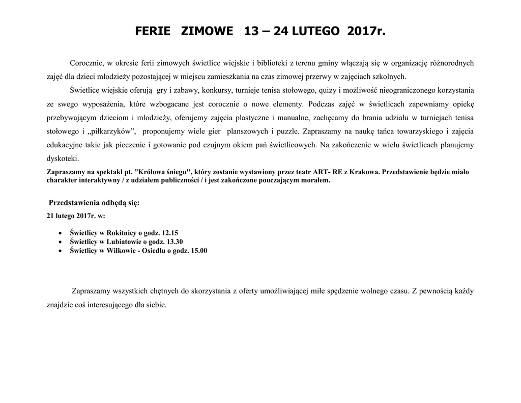 FERIE ZIMOWE 13 – 24 LUTEGO 2017r. Corocznie, w okresie ferii zimowych świetlice wiejskie i biblioteki z terenu gminy włączają się w organizację różnorodnych zajęć dla dzieci młodzieży pozostającej w miejscu zamieszkania na czas zimowej przerwy w zajęciach szkolnych. Świetlice wiejskie oferują gry i zabawy, konkursy, turnieje tenisa stołowego, quizy i możliwość nieograniczonego korzystania ze swego wyposażenia, które wzbogacane jest corocznie o nowe elementy. Podczas zajęć w świetlicach zapewniamy opiekę przebywającym dzieciom i młodzieży, oferujemy zajęcia plastyczne i manualne, zachęcamy do brania udziału w turniejach tenisa stołowego i „piłkarzyków”, proponujemy wiele gier planszowych i puzzle. Zapraszamy na naukę tańca towarzyskiego i zajęcia edukacyjne takie jak pieczenie i gotowanie pod czujnym okiem pań świetlicowych. Na zakończenie w wielu świetlicach planujemy dyskoteki. Zapraszamy na spektakl pt. ”Królowa śniegu", który zostanie wystawiony przez teatr ART- RE z Krakowa. Przedstawienie będzie miało charakter interaktywny / z udziałem publiczności / i jest zakończone pouczającym morałem. Przedstawienia odbędą się: 21 lutego 2017r. w: Świetlicy w Rokitnicy o godz. 12.15 Świetlicy w Lubiatowie o godz. 13.30 Świetlicy w Wilkowie - Osiedlu o godz. 15.00 Zapraszamy wszystkich chętnych do skorzystania z oferty umożliwiającej miłe spędzenie wolnego czasu. Z pewnością każdy znajdzie coś interesującego dla siebie. GODZINY PRACY ŚWIETLIC WIEJSKICH NA TERENIE GMINY ZŁOTORYJA W OKRESIE FERII ZIMOWYCH 13-24 LUTEGO 2017R. Poniedziałek Wtorek Środa Czwartek Piątek Sobota BRENNIK 16.30-20.00 16.30-20.00 16.30-20.00 16.30-20.00 - - ERNESTYNÓW 15.30-20.30 15.30-20.30 15.30-20.30 16.30-20.30 15.30-20.30 - GIERAŁTOWIEC 15.30-20.30 15.30-20.30 15.30-20.30 15.30-20.30 15.30-20.30 - JERZMANICE-ZDR 14.00-20.00 14.00-20.00 - 14.00-20.00 14.00-20.00 - KOPACZ - 15.30-20.30 15.30-20.30 15-30-19.30 - - KOZÓW 14.00-17.30 14.00-17.30 14.00-17.30 14.00-17.30 - - LESZCZYNA 16.00-18.00 16.00-19.00 16.00-19.00 16.00-19.00 16.00-19.00 - LUBIATÓW 15.00-20.00 15.00-20.00 15.00-20.00 15.00-20.00 15.00-20.00 - ŁAŹNIKI 14.00-17.30 14.00-17.30 - 14.00-17.30 14.00-17.30 - N.W.ZŁOTORYJSKA 13.00-16.00 13.00-16.00 13.00-16.00 13.00-16.00 13.00-16.00 - PODOLANY 17.00-20.00 17.00-20.00 17.00-20.00 17.00-20.00 17.00-19.00 - PRUSICE 14.30-19.30 14.30-19.30 14.30-19.30 14.30-19.30 14.30-19.30 - PYSKOWICE 15.00-18.30 15.00-18.30 15.00-18.30 15.00-18.30 - - ROKITNICA 15.00-20.00 15.00-20.00 15.00-20.00 15.00-20.00 15.00-20.00 RZYMÓWKA 15.00-18.00 15.00-18.00 15.00-18.00 15.00-18.00 15.00-18.00 - SĘPÓW 16.00-19.30 16.00-19.30 - 16.00-19.30 16.00-19.30 - WILKÓW-OSIEDLE 13.00-20.00 14.00-21.00 13.00-20.00 13.00-20.00 - 15.00- 21.00 WILKÓW 14.00-17.30 14.00-17.30 14.00-18.00 14.00-17.30 14.00-17.30 - WYSOCKO 15.00-18.00 15.00-18.00 15.00-18.00 15.00-18.00 15.00-17.00 - WYSKOK 16.00.-19.00 16.00.-19.00 16.00.-19.00 16.00.-19.00 16.00.-19.00