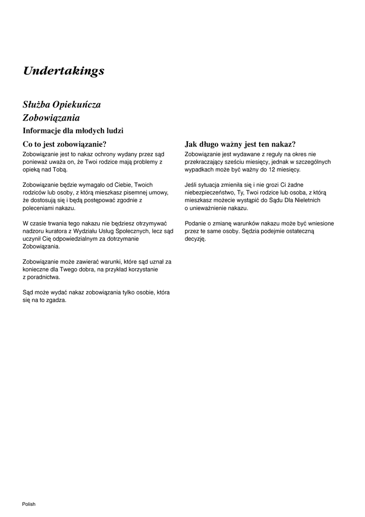 Undertakings SÂuz¾ba Opiekun;cza ZobowiaÅzania Informacje dla mÂodych ludzi Co to jest zobowiaÅzanie= Jak dÂugo waz¾ny jest ten nakaz= Zobowia•zanie jest to nakaz ochrony wydany przez sa•d poniewaz¾ uwaz¾a on, z¾e Twoi rodzice maja• problemy z opieka• nad Toba•. Zobowia•zanie jest wydawane z reguÂy na okres nie przekraczaja•cy sze—ciu miesie•cy, jednak w szczego;lnych wypadkach moz¾e byc; waz¾ny do 12 miesie•cy. Zobowia•zanie be•dzie wymagaÂo od Ciebie, Twoich rodzico;w lub osoby, z kto;ra• mieszkasz pisemnej umowy, z¾e dostosuja• sie• i be•da• poste•powac; zgodnie z poleceniami nakazu. Je—li sytuacja zmieniÂa sie• i nie grozi Ci z¾adne niebezpieczen;stwo, Ty, Twoi rodzice lub osoba, z kto;ra• mieszkasz moz¾ecie wysta•pic; do Sa•du Dla Nieletnich o uniewaz¾nienie nakazu. W czasie trwania tego nakazu nie be•dziesz otrzymywac; nadzoru kuratora z WydziaÂu UsÂug SpoÂecznych, lecz sa•d uczyni Cie• odpowiedzialnym za dotrzymanie Zobowia•zania. Podanie o zmiane• warunko;w nakazu moz¾e byc; wniesione przez te same osoby. Se•dzia podejmie ostateczna• decyzje•. Zobowia•zanie moz¾e zawierac; warunki, kto;re sa•d uzna za konieczne dla Twego dobra, na przykÂad korzystanie z poradnictwa. Sa•d moz¾e wydac; nakaz zobowia•zania tylko osobie, kto;ra sie• na to zgadza. Polish