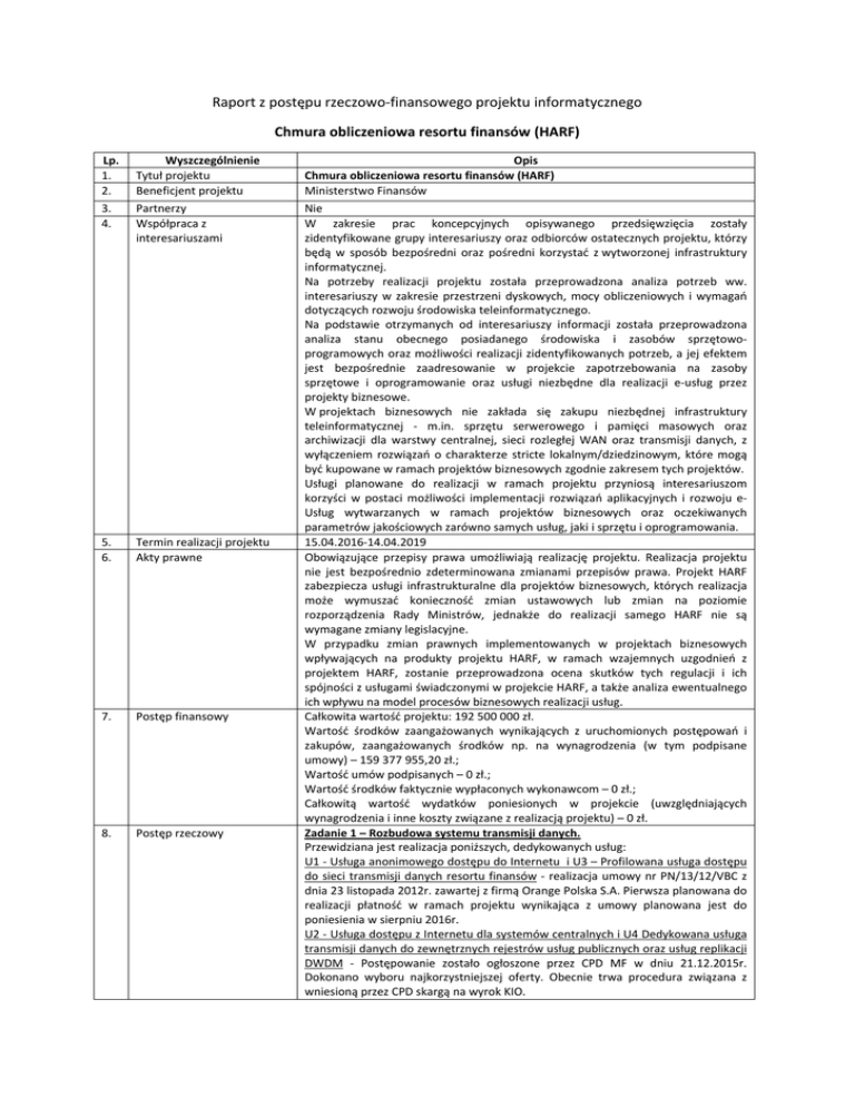 Raport z postępu rzeczowo-finansowego projektu informatycznego Chmura obliczeniowa resortu finansów (HARF) Lp. 1. 2. Wyszczególnienie Tytuł projektu Beneficjent projektu Opis Chmura obliczeniowa resortu finansów (HARF) Ministerstwo Finansów 3. 4. Partnerzy Współpraca z interesariuszami 5. 6. Termin realizacji projektu Akty prawne 7. Postęp finansowy 8. Postęp rzeczowy Nie W zakresie prac koncepcyjnych opisywanego przedsięwzięcia zostały zidentyfikowane grupy interesariuszy oraz odbiorców ostatecznych projektu, którzy będą w sposób bezpośredni oraz pośredni korzystać z wytworzonej infrastruktury informatycznej. Na potrzeby realizacji projektu została przeprowadzona analiza potrzeb ww. interesariuszy w zakresie przestrzeni dyskowych, mocy obliczeniowych i wymagań dotyczących rozwoju środowiska teleinformatycznego. Na podstawie otrzymanych od interesariuszy informacji została przeprowadzona analiza stanu obecnego posiadanego środowiska i zasobów sprzętowoprogramowych oraz możliwości realizacji zidentyfikowanych potrzeb, a jej efektem jest bezpośrednie zaadresowanie w projekcie zapotrzebowania na zasoby sprzętowe i oprogramowanie oraz usługi niezbędne dla realizacji e-usług przez projekty biznesowe. W projektach biznesowych nie zakłada się zakupu niezbędnej infrastruktury teleinformatycznej - m.in. sprzętu serwerowego i pamięci masowych oraz archiwizacji dla warstwy centralnej, sieci rozległej WAN oraz transmisji danych, z wyłączeniem rozwiązań o charakterze stricte lokalnym/dziedzinowym, które mogą być kupowane w ramach projektów biznesowych zgodnie zakresem tych projektów. Usługi planowane do realizacji w ramach projektu przyniosą interesariuszom korzyści w postaci możliwości implementacji rozwiązań aplikacyjnych i rozwoju eUsług wytwarzanych w ramach projektów biznesowych oraz oczekiwanych parametrów jakościowych zarówno samych usług, jaki i sprzętu i oprogramowania. 15.04.2016-14.04.2019 Obowiązujące przepisy prawa umożliwiają realizację projektu. Realizacja projektu nie jest bezpośrednio zdeterminowana zmianami przepisów prawa. Projekt HARF zabezpiecza usługi infrastrukturalne dla projektów biznesowych, których realizacja może wymuszać konieczność zmian ustawowych lub zmian na poziomie rozporządzenia Rady Ministrów, jednakże do realizacji samego HARF nie są wymagane zmiany legislacyjne. W przypadku zmian prawnych implementowanych w projektach biznesowych wpływających na produkty projektu HARF, w ramach wzajemnych uzgodnień z projektem HARF, zostanie przeprowadzona ocena skutków tych regulacji i ich spójności z usługami świadczonymi w projekcie HARF, a także analiza ewentualnego ich wpływu na model procesów biznesowych realizacji usług. Całkowita wartość projektu: 192 500 000 zł. Wartość środków zaangażowanych wynikających z uruchomionych postępowań i zakupów, zaangażowanych środków np. na wynagrodzenia (w tym podpisane umowy) – 159 377 955,20 zł.; Wartość umów podpisanych – 0 zł.; Wartość środków faktycznie wypłaconych wykonawcom – 0 zł.; Całkowitą wartość wydatków poniesionych w projekcie (uwzględniających wynagrodzenia i inne koszty związane z realizacją projektu) – 0 zł. Zadanie 1 – Rozbudowa systemu transmisji danych. Przewidziana jest realizacja poniższych, dedykowanych usług: U1 - Usługa anonimowego dostępu do Internetu i U3 – Profilowana usługa dostępu do sieci transmisji danych resortu finansów - realizacja umowy nr PN/13/12/VBC z dnia 23 listopada 2012r. zawartej z firmą Orange Polska S.A. Pierwsza planowana do realizacji płatność w ramach projektu wynikająca z umowy planowana jest do poniesienia w sierpniu 2016r. U2 - Usługa dostępu z Internetu dla systemów centralnych i U4 Dedykowana usługa transmisji danych do zewnętrznych rejestrów usług publicznych oraz usług replikacji DWDM - Postępowanie zostało ogłoszone przez CPD MF w dniu 21.12.2015r. Dokonano wyboru najkorzystniejszej oferty. Obecnie trwa procedura związana z wniesioną przez CPD skargą na wyrok KIO. Zadanie 2 – Rozbudowa centralnej chmury obliczeniowej resortu finansów. Przewidziana jest realizacja poniższych, dedykowanych usług: Usługa 5 - Usługa odtworzenia po katastrofie dla kluczowych usług elektronicznych resortu finansów (DR) - Postępowanie zostało ogłoszone przez CPD MF w dniu 18.01.2016r. Obecnie trwa udzielanie odpowiedzi na pytania i wynikające z tego modyfikacje SIWZ. Usługa 6 - Usługi migracji systemów do CPD MF -. Zadanie prowadzone jest w dwóch częściach. Pierwsza część obejmująca systemy niejawne obecnie jest na etapie aktualizacji SIWZ. Postępowanie zostało ogłoszone przez MF w dniu 05.02.2016r. Druga część w zakresie systemów jawnych jest obecnie na etapie przygotowywania Założeń dotyczących Zamówienia oraz doprecyzowaniu OPZ. Usługa 7 - Usługa zintegrowanego środowiska teleinformatycznego dla nowych rozwiązań biznesowych – Postępowanie zostało ogłoszone przez CPD MF w dniu 29.12.2015r. Zadanie prowadzone jest w trzech częściach z czego dwie części zamówienia są obecnie na etapie udzielania odpowiedzi wykonawcą oraz wprowadzania modyfikacji SIWZ, natomiast trzecia część na etapie zawierania Umowy z wybranym Wykonawcą. Usługa 14 - Usługa kolokacji dla działań pilotażowych - Postępowanie zostało ogłoszone przez CPD MF w dniu 14.12.2015r. Obecnie postępowanie jest na etapie zawierania umowy z wybranym Wykonawcą. Usługa 15 - Rozbudowane CPD MF - Planowane ogłoszenie postępowania przypada na sierpień 2016r. Zadanie 3 – Budowa, reorganizacja i centralizacja narzędzi informatycznych w resorcie finansów. Przewidziana jest realizacja poniższych, dedykowanych usług: Usługa 8. Usługa wirtualnej stacji roboczej użytkowników Ministerstwa Finansów Postępowanie zostało ogłoszone dnia 22.12.2015r. Obecnie postępowanie jest na etapie aktualizacji SIWZ. Usługa 9. Us