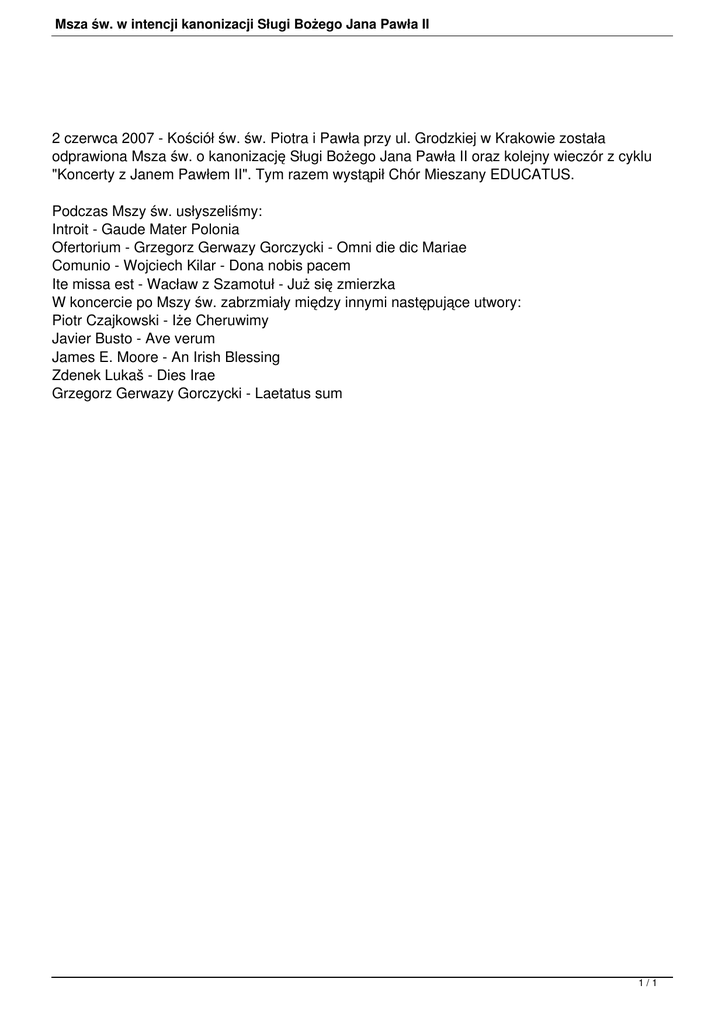 Msza św. w intencji kanonizacji Sługi Bożego Jana Pawła II 2 czerwca 2007 - Kościół św. św. Piotra i Pawła przy ul. Grodzkiej w Krakowie została odprawiona Msza św. o kanonizację Sługi Bożego Jana Pawła II oraz kolejny wieczór z cyklu "Koncerty z Janem Pawłem II". Tym razem wystąpił Chór Mieszany EDUCATUS. Podczas Mszy św. usłyszeliśmy: Introit - Gaude Mater Polonia Ofertorium - Grzegorz Gerwazy Gorczycki - Omni die dic Mariae Comunio - Wojciech Kilar - Dona nobis pacem Ite missa est - Wacław z Szamotuł - Już się zmierzka W koncercie po Mszy św. zabrzmiały między innymi następujące utwory: Piotr Czajkowski - Iże Cheruwimy Javier Busto - Ave verum James E. Moore - An Irish Blessing Zdenek Lukaš - Dies Irae Grzegorz Gerwazy Gorczycki - Laetatus sum 1/1
