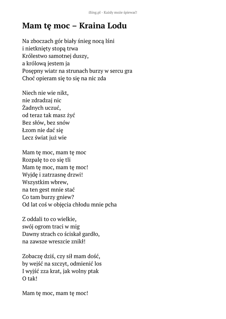 iSing.pl - Każdy może śpiewać! Mam tę moc – Kraina Lodu Na zboczach gór biały śnieg nocą lśni i nietknięty stopą trwa Królestwo samotnej duszy, a królową jestem ja Posępny wiatr na strunach burzy w sercu gra Choć opieram się to się na nic zda Niech nie wie nikt, nie zdradzaj nic Żadnych uczuć, od teraz tak masz żyć Bez słów, bez snów Łzom nie dać się Lecz świat już wie Mam tę moc, mam tę moc Rozpalę to co się tli Mam tę moc, mam tę moc! Wyjdę i zatrzasnę drzwi! Wszystkim wbrew, na ten gest mnie stać Co tam burzy gniew? Od lat coś w objęcia chłodu mnie pcha Z oddali to co wielkie, swój ogrom traci w mig Dawny strach co ściskał gardło, na zawsze wreszcie znikł! Zobaczę dziś, czy sił mam dość, by wejść na szczyt, odmienić los I wyjść zza krat, jak wolny ptak O tak! Mam tę moc, mam tę moc! Mój jest wiatr, okiełznam śnieg Mam tę moc, mam tę moc! I zamiast łez jest śmiech! Wreszcie ja, zostawię ślad! Co tam burzy gniew? Moc mojej władzy lodem spada dziś na świat A duszę moją w mroźnych skrach ku górze niesie wiatr I myśl powietrze tnie jak kryształowy miecz Nie zrobię kroku w tył, nie spojrzę nigdy wstecz! Mam tę moc, mam tę moc! Z nową zorzą zbudzę się Mam tę moc, mam tę moc! Już nie ma tamtej mnie Oto ja! Stanę w słońcu dnia Co tam burzy gniew?! Od lat coś w objęcia chłodu mnie pcha Słowa: Robert Lopez, Kristen Anderson-Lopez, Michał Wojnarowski (polski tekst) Muzyka: Robert Lopez, Kristen Anderson-Lopez Rok wydania: 2013 Płyta: brak danych