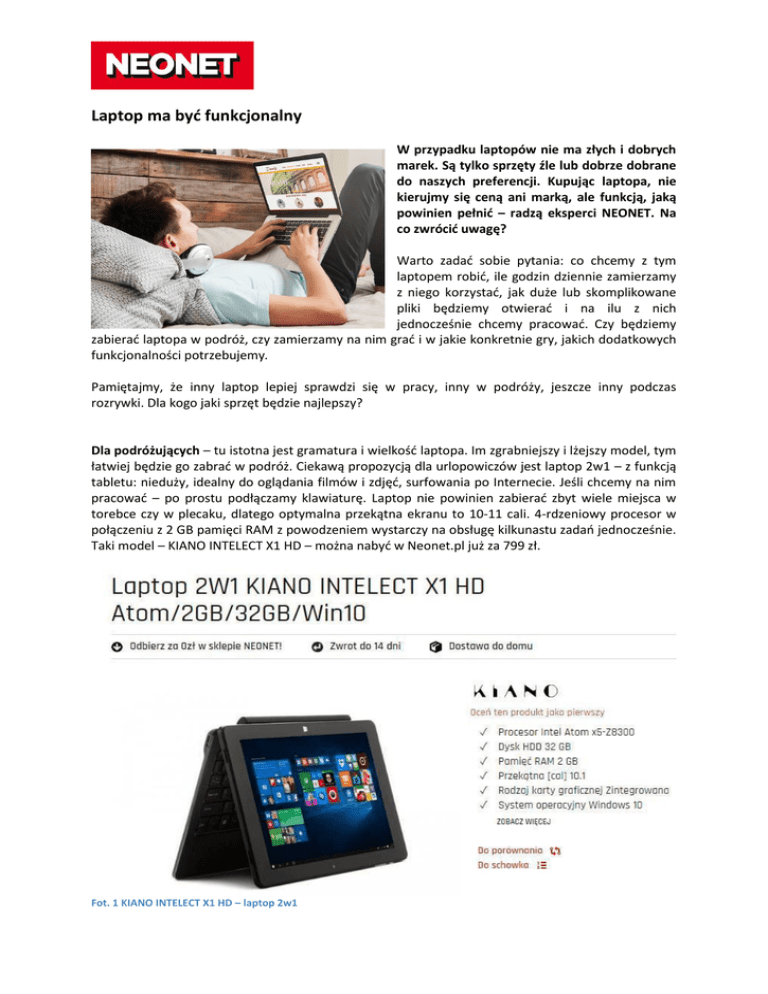 Laptop ma być funkcjonalny W przypadku laptopów nie ma złych i dobrych marek. Są tylko sprzęty źle lub dobrze dobrane do naszych preferencji. Kupując laptopa, nie kierujmy się ceną ani marką, ale funkcją, jaką powinien pełnić – radzą eksperci NEONET. Na co zwrócić uwagę? Warto zadać sobie pytania: co chcemy z tym laptopem robić, ile godzin dziennie zamierzamy z niego korzystać, jak duże lub skomplikowane pliki będziemy otwierać i na ilu z nich jednocześnie chcemy pracować. Czy będziemy zabierać laptopa w podróż, czy zamierzamy na nim grać i w jakie konkretnie gry, jakich dodatkowych funkcjonalności potrzebujemy. Pamiętajmy, że inny laptop lepiej sprawdzi się w pracy, inny w podróży, jeszcze inny podczas rozrywki. Dla kogo jaki sprzęt będzie najlepszy? Dla podróżujących – tu istotna jest gramatura i wielkość laptopa. Im zgrabniejszy i lżejszy model, tym łatwiej będzie go zabrać w podróż. Ciekawą propozycją dla urlopowiczów jest laptop 2w1 – z funkcją tabletu: nieduży, idealny do oglądania filmów i zdjęć, surfowania po Internecie. Jeśli chcemy na nim pracować – po prostu podłączamy klawiaturę. Laptop nie powinien zabierać zbyt wiele miejsca w torebce czy w plecaku, dlatego optymalna przekątna ekranu to 10-11 cali. 4-rdzeniowy procesor w połączeniu z 2 GB pamięci RAM z powodzeniem wystarczy na obsługę kilkunastu zadań jednocześnie. Taki model – KIANO INTELECT X1 HD – można nabyć w Neonet.pl już za 799 zł. Fot. 1 KIANO INTELECT X1 HD – laptop 2w1 Dla ucznia – młody człowiek będzie używał laptopa do nauki (i oczywiście także do rozrywki), dlatego taki sprzęt musi rosnąć razem z dzieckiem. Optymalne urządzenie powinno posiadać minimum czterordzeniowy procesor, pamięć RAM o pojemności min. 4 GB, dysk twardy o pojemności min. 500 GB. Do nauki warto zakupić też monitor. Taki wydatek to nie tylko inwestycja w komfort pracy, ale również gwarancja, że dziecko będzie korzystać z laptopa przy biurku, zachowując właściwą postawę ciała. Dobry monitor powinien mieć przekątną co najmniej 19 cali, a laptop musi być wyposażony w złącze VGA/HDMI. Przykładowy model laptopa: HP 15-r230nw, cena w Neonet.pl: 2089 zł. Fot. 2 HP 15-r230nw – idealny do nauki Dla gracza – parametry laptopa dla ucznia tu okażą się już niewystarczające. Wymagający gamer będzie oczekiwał od sprzętu przede wszystkim dużej przekątnej ekranu: nawet 17 cali, potężnego procesora, np. Intel Core i7, nowoczesnego systemu audio, który pozwoli usłyszeć każdy szmer (np. JBL, Bang & Olufsen PLAY), wysoko wydajnej karty graficznej (NVIDIA GeForce GTX), pamięci 8 GB i dysku o pojemności 1000 GB oraz takich dodatków jak podświetlana klawiatura czy system chłodzenia. Przykładowy model: ACER PREDATOR G9-792-72GZ, cena w Neonet.pl: 6499 zł. Fot. 3 ACER PREDATOR G9-792-72GZ – świetna propozycja dla gracza Dla pracownika – osoby szukające laptopa do pracy z pewnością zainteresuje zgrabny i nieduży ultrabook z procesorem minimum Intel Core i5, systemem operacyjnym Windows 8 lub 10 i intuicyjnym touchpadem. Ważne, by posiadał więcej portów USB, złącze VGA/HDMI umożliwiające podpięcie monitora, i baterię, która zapewni nawet 10-godzine działanie. W pracy zawodowej liczy się również to, by zawsze mieć pod ręką wszystkie dane i pliki, które są nam akurat potrzebne – dlatego od sprzętu powinniśmy wymagać pamięci 8 GB i dysku 1000 GB. Przykładowy model: LENOVO Y50-70. *** Grupa NEONET jest jednym z liderów rynku AGD, RTV, IT, akcesoria i multimedia. Powstała w 1991 roku w Polsce i obecnie skupia sieć blisko 300 salonów sprzedaży w całym kraju. Oferuje najwyższej klasy markowe produkty zarówno w swoich sklepach stacjonarnych, jak i w sklepie internetowym www.neonet.pl. Misją Grupy NEONET jest, by Klienci dokonali najlepszego dla siebie wyboru sprzętu RTV, AGD i IT oraz mogli w pełni cieszyć się jego funkcjonalnością. Wysoki poziom usług i zaufanie Klientów przyniosły Grupie NEONET wiele znaczących nagród i wyróżnień, m.in.: Gwiazda Jakości Obsługi, Laur Klienta i Konsumenta czy tytuł Created in Poland Superbrands. W 2016 roku NEONET dołączył do międzynarodowej grupy zakupowej E-Square. Kontakt dla mediów: Katarzyna Maciaszczyk-Sobolewska [email protected] Tel. 696 402 272