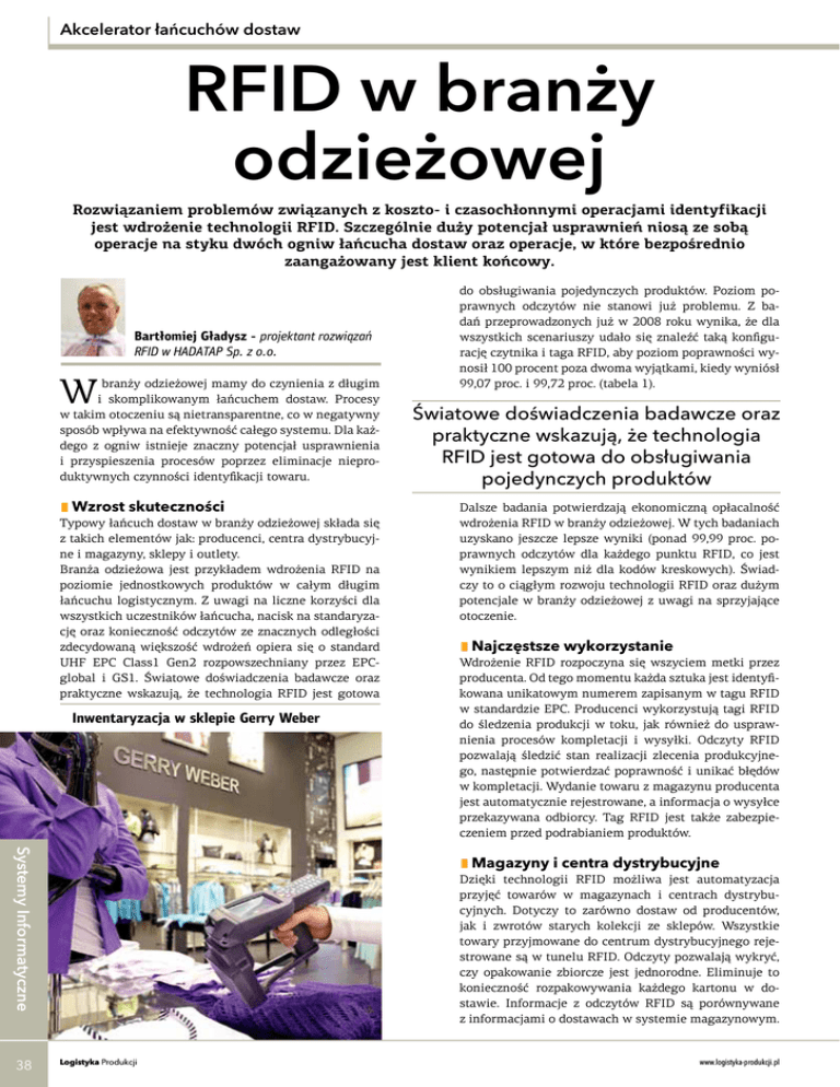Akcelerator łańcuchów dostaw RFID w branży odzieżowej Rozwiązaniem problemów związanych z koszto- i czasochłonnymi operacjami identyfikacji jest wdrożenie technologii RFID. Szczególnie duży potencjał usprawnień niosą ze sobą operacje na styku dwóch ogniw łańcucha dostaw oraz operacje, w które bezpośrednio zaangażowany jest klient końcowy. Bartłomiej Gładysz - projektant rozwiązań RFID w HADATAP Sp. z o.o. W branży odzieżowej mamy do czynienia z długim i skomplikowanym łańcuchem dostaw. Procesy w takim otoczeniu są nietransparentne, co w negatywny sposób wpływa na efektywność całego systemu. Dla każdego z ogniw istnieje znaczny potencjał usprawnienia i przyspieszenia procesów poprzez eliminacje nieproduktywnych czynności identyfikacji towaru. ÓÓWzrost skuteczności Typowy łańcuch dostaw w branży odzieżowej składa się z takich elementów jak: producenci, centra dystrybucyjne i magazyny, sklepy i outlety. Branża odzieżowa jest przykładem wdrożenia RFID na poziomie jednostkowych produktów w całym długim łańcuchu logistycznym. Z uwagi na liczne korzyści dla wszystkich uczestników łańcucha, nacisk na standaryzację oraz konieczność odczytów ze znacznych odległości zdecydowaną większość wdrożeń opiera się o standard UHF EPC Class1 Gen2 rozpowszechniany przez EPCglobal i GS1. Światowe doświadczenia badawcze oraz praktyczne wskazują, że technologia RFID jest gotowa Inwentaryzacja w sklepie Gerry Weber Systemy Informatyczne Xxxx 38 do obsługiwania pojedynczych produktów. Poziom poprawnych odczytów nie stanowi już problemu. Z badań przeprowadzonych już w 2008 roku wynika, że dla wszystkich scenariuszy udało się znaleźć taką konfigurację czytnika i taga RFID, aby poziom poprawności wynosił 100 procent poza dwoma wyjątkami, kiedy wyniósł 99,07 proc. i 99,72 proc. (tabela 1). Światowe doświadczenia badawcze oraz praktyczne wskazują, że technologia RFID jest gotowa do obsługiwania pojedynczych produktów Dalsze badania potwierdzają ekonomiczną opłacalność wdrożenia RFID w branży odzieżowej. W tych badaniach uzyskano jeszcze lepsze wyniki (ponad 99,99 proc. poprawnych odczytów dla każdego punktu RFID, co jest wynikiem lepszym niż dla kodów kreskowych). Świadczy to o ciągłym rozwoju technologii RFID oraz dużym potencjale w branży odzieżowej z uwagi na sprzyjające otoczenie. ÓÓNajczęstsze wykorzystanie Wdrożenie RFID rozpoczyna się wszyciem metki przez producenta. Od tego momentu każda sztuka jest identyfikowana unikatowym numerem zapisanym w tagu RFID w standardzie EPC. Producenci wykorzystują tagi RFID do śledzenia produkcji w toku, jak również do usprawnienia procesów kompletacji i wysyłki. Odczyty RFID pozwalają śledzić stan realizacji zlecenia produkcyjnego, następnie potwierdzać poprawność i unikać błędów w kompletacji. Wydanie towaru z magazynu producenta jest automatycznie rejestrowane, a informacja o wysyłce przekazywana odbiorcy. Tag RFID jest także zabezpieczeniem przed podrabianiem produktów. ÓÓMagazyny i centra dystrybucyjne Dzięki technologii RFID możliwa jest automatyzacja przyjęć towarów w magazynach i centrach dystrybucyjnych. Dotyczy to zarówno dostaw od producentów, jak i zwrotów starych kolekcji ze sklepów. Wszystkie towary przyjmowane do centrum dystrybucyjnego rejestrowane są w tunelu RFID. Odczyty pozwalają wykryć, czy opakowanie zbiorcze jest jednorodne. Eliminuje to konieczność rozpakowywania każdego kartonu w dostawie. Informacje z odczytów RFID są porównywane z informacjami o dostawach w systemie magazynowym. Logistyka Produkcji www.logistyka-produkcji.pl RFID może być wykorzystane do zarządzania magazynem i rejestrowania lokalizacji towarów. Następnie na podstawie odczytów RFID odbywa się kompletacja zamówień dla sklepów. Kontrola wysyłki do sklepu polega na automatycznym odczycie skompletowanego kartonu w tunelu RFID i porównaniu z zamówieniem, co eliminuje zbędne czynności kontrolne i nieporozumienia na linii centrum-sklep. ÓÓUdogodnienia w zapasach Towary podczas przyjęcia w punktach sprzedaży są odczytywane na bramkach i w tunelach RFID, a w małych placówkach przy użyciu czytników ręcznych. Technologia RFID w sklepie pozwala uzyskiwać bieżącą informację o stanie zapasów w sklepie i na zapleczu. Dzięki temu można generować automatyczne zamówienia uzupełniające zapasy i dostarczać towar na półki w momencie jego sprzedaży. Eliminowane są sytuacje braku towaru na półce i utracenia sprzedaży. Możliwe jest również dokładne lokalizowanie odzieży na terenie sklepu. Jest to informacja dla personelu o koniecznych przemieszczeniach towaru na właściwe miejsca oraz informacja statystyczna pozwalającą zwiększyć sprzedaż. Pracownicy sklepu mogą na bieżąco reagować na przemieszczenia towaru w strefy, w których nie powinien się on znajdować. Pozwala to znacznie podnieść poziom dostępności towaru dla klienta. Istotnym usprawnieniem procesu obsługi klienta końcowego jest zastosowanie czytników RFID w przymierzalniach. Z jednej strony jest to nieinwazyjny sposób kontroli ilości odzieży w przymierzalni. Jednocześnie umożliwia personelowi szybki dostęp Tab. 1 Wyniki testów L.p. 1 2 3 Opis scenariusza Czytnik mobilny Towary w bezruchu Czytnik stacjonarny Towary w bezruchu Czytnik stacjonarny Towary w ruchu Ilość poprawnych odczytów Odzież na wieszaku obrotowym Odzież na wieszaku prostym Odzież w kartonach Odzież na półce Obuwie na półkach Inteligentna półka Punkt sprzedaży (kasa) 100% 100% 100% 99,72% 100% 100% 100% Odzież na wieszaku Odzież przenoszona w kartonie ręcznie Odzież w kartonie na wózku plastikowym Odzież na wózku metalowym Odzież na taśmociągu 100% 100% 100% 100% 99,07% Opracowanie na podstawie D.B. Cromhout, B.C. Hardgrave, D.J. Armstrong, Item-Level RFID: Future Direction – Current Status, RFID Item-Level Tagging fo