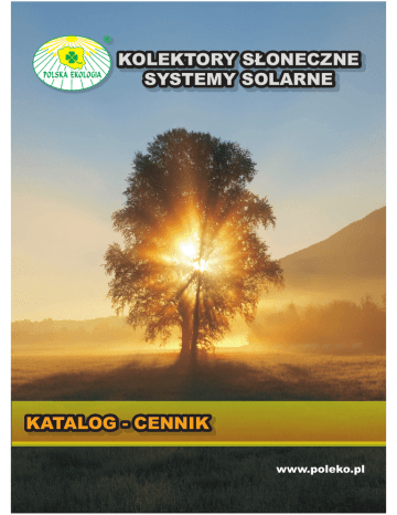 KOLEKTORY SŁONECZNE SYSTEMY SOLARNE KATALOG - CENNIK www.poleko.pl SPIS TREŚCI Lp. Nazwa Strona 1. Cechy szczególne kolektorów cieczowych płaskich Polskiej Ekologii 1 2. Kolektory słoneczne cieczowe płaskie z serii PIG 3 3. Pakiety solarne z kolektorami serii PIG 2,0/ PIG2,38/ PIG 2,51 4 4. Zespoły montażowe do kolektorów słonecznych serii PIG 5 5. Kolektory słoneczne cieczowe płaskie z serii PIX 7 6. Pakiety solarne z kolektorami serii PIX 2,0/ PIX2,51/ PIX 2,85 8 7. Zespoły montażowe do kolektorów słonecznych serii PIX 9 8. Kolektory słoneczne cieczowe płaskie serii SX 11 9. Pakiety solarne z kolektorami serii SX 2,0/ SX2,51/ SX 2,85 12 10. Zespoły montażowe do kolektorów słonecznych serii SX 13 11. Kolektory słoneczne rurowo - próżniowe serii PR 15 12. Pakiety solarne z kolektorami rurowo – próżniowymi PR 16 13. Zespoły montażowe do kolektorów słonecznych serii PR 17 14. Systemy połączeniowe do kolektorów słonecznych 19 15. Solarne regulatory temperatury 21 16. Grupy pompowe – solarne 24 17. Naczynia przeponowe – solarne 25 18. Koncentrat płynu solarnego 26 19. Magistrale solarne SUNFLEX 27 20. Zbiorniki jednowężownicowe i dwuwężownicowe PE do instalacji solarnych 29 21. Zbiorniki multiwalentne TORONTO do instalacji solarnych 33 22. Osprzęt hydrauliczny – separatory, odpowietrzniki, zawory, przepływomierze 34 23. Wymienniki basenowe 35 24. Osprzęt do napełniania i odpowietrzania instalacji solarnych 36 25. Haki do zespołów montażowych 37 26. Przykładowe realizacje z kolektorami Polskiej Ekologii 38 Polska Ekologia Sp. z o.o., www.poleko.pl tel. 22 879 14 70, fax. 22 879 14 73 [email protected] KOLEKTORY SŁONECZNE cieczowe, płaskie KOLEKTORY SŁONECZNE cieczowe, płaskie Kolektory słoneczne Cechy szczególne kolektorów Polskiej Ekologii Unikalna konstrukcja absorbera słonecznego • Absorber wykonany z jednej tafli blachy miedzianej pokrytej wysokoselektywną powłoką . • Spłaszczone rurki przepływowe zapewniają zwiększoną powierzchnię styku z taflą absorbera. • Specjalna przegroda w rurze zbiorczej powoduje, iż przepływ czynnika roboczego w kolektorze odbywa się w sposób szeregowo-równoległy. Przepływ szeregowo-równoległy (prekursorskie rozwiązanie w skali europejskiej) zapewnia równomierny odbiór ciepła z całej powierzchni absorbera oraz zwiększa jednostkowy przyrost temperatury w kolektorze. Wysoka efektywność działania • Doskonały absorber, przemyślana konstrukcja obudowy oraz bardzo dobra izolacja termiczna kolektorów sprawia, iż osiągają one bardzo wysoką sprawność działania zarówno w okresie letnim jak i w zimowym. • Kolektory z serii PIG, PIX, SX oraz z absorberami o przepływie szeregowo-równoległym przewyższają swą efektywnością większość produkowanych w Europie markowych kolektorów płaskich i rurowo-próżniowych. Niepowtarzalny design • Ciemna obudowa kolektora oraz granatowo-czarny odcień widocznego przez szybę solarną absorbera, uszlachetnia wygląd każdego dachu. Jednoelementowa konstrukcja ramy Przepływ – podwójna harfa zasilanie kolektora zimnym czynnikiem roboczym wypływ podgrzanego czynnika do następnego kolektora lub zbiornika Specjalnie kształtowany profil ramy kolektora zaginany jest w czterech narożnikach. Profil łączony jest wyłącznie w jednym miejscu – w dolnej części ramy kolektora. Połączenie pełnopowierzchniowe Absorber wysokoselektywny 100% promieniowanie odbite: 5% ciepło wypromieniowane: 5% Absorber wysokoselektywny Absorber wykonany z jednej tafli blachy miedzianej pokrytej wysokoselektywną powłoką . Spłaszczone rurki przepływowe zapewniają zwiększoną powierzchnię styku z taflą absorbera. Spłaszczenie dodatkowo powoduje turbulencyjny przepływ czynnika roboczego wewnątrz rurek przepływowych. Rurki łączone są z blachą absorbera unikalną technologią, która pozwala na uzyskanie pełnopowierzchniowego styku z płaszczyzną absorbera. Polska Ekologia Sp. z o.o., www.poleko.pl 90% miedziana blacha absorbera ciepło 1 tel. 22 879 14 70, fax. 22 879 14 73 [email protected] Zespoły montażowe do kolektorów M10... KPL SBW... ZESPOŁY MONTAŻOWE do kolektorów pionowych ZESPOŁY MONTAŻOWE do kolektorów pionowych ZM...K/45° – Zespoły montażowe do kolektorów (DACH > 25°) Elementy kompletnych zestawów do montażu kolektorów na dachu o kącie pochylenia od 25 do 60° NM KM BT... 25÷60° T... – Teleskop M8×60 KPL ZM...K/15° – Zespoły montażowe do kolektorów (DACH < 25°) SBK... Elementy kompletnych zestawów do montażu kolektorów na dachu o kącie pochylenia od 10 do 25° KM M10... KPL NM 10÷25° ZM...K/0° – Zespoły montażowe do kolektorów (DACH PŁASKI) Elementy kompletnych zestawów do montażu kolektorów na dachu płaskim, tarasie, fundamencie. T... – Teleskop M8×60 KPL SBK... M10... KPL BT... KM NM PD... Zestawy montażowe są kompletne i zawierają odpowiednią ilość haków dostosowaną do modelu i ilości kolektorów. Wybierając indeks zestawu montażowego należy dobrać odpowiedni model haka w zależności od pokrycia dachowego. Ostatnia cyfra indeksu zestawu montażowego oznacza wybrany model haka mocującego. Indeks zestawu montażowego X X X X X 2 3 6 1 - nach 0° Nachylenie dachu 2 - nach 10 do 25° 3 - nach 25 do 60° Ilość kolektorów HAK3 – do blachodachówki, onduliny falistej – BLACHODACHÓWKA HAK1 – do dachówek ceramicznych falistych – STANDARDOWY HAK4 – do dachówki ceramicznej falistej – FRANKFURCKA HAK2 – do dachówki ceramicznej płaskiej – KARPIÓWKA HAK5 – stosowany do różnych pokryć – SZPILKA HAK6 – do dachówki bitumicznej – PAPA HAK7 – do blachy płaskiej łączonej na RĄBEK STOJĄCY HAK8 – do dachówek ceram. falistych – STANDARDOWY WYSOKI Numer haka (1 - 8) Polska Ekologia Sp. z o.o., www.poleko.pl 2 tel. 22 879 14 70, fax. 22 879 14 73 [email protected] KOLEKTORY SŁONECZNE cieczowe, płaskie KOLEKTORY S