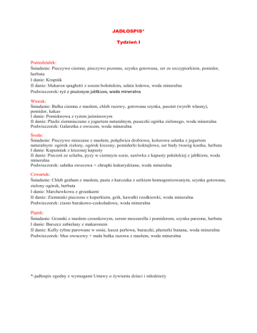 JADŁOSPIS* Tydzień I Poniedziałek: Śniadanie: Pieczywo ciemne, pieczywo pszenne, szynka gotowana, ser ze szczypiorkiem, pomidor, herbata I danie: Krupnik II danie: Makaron spaghetti z sosem bolońskim, sałata lodowa, woda mineralna Podwieczorek: ryż z prażonym jabłkiem, woda mineralna Wtorek: Śniadanie: Bułka ciemna z masłem, chleb razowy, gotowana szynka, pasztet (wyrób własny), pomidor, kakao I danie: Pomidorowa z ryżem jaśminowym II danie: Placki ziemniaczane z jogurtem naturalnym, paseczki ogórka zielonego, woda mineralna Podwieczorek: Galaretka z owocem, woda mineralna Środa: Śniadanie: Pieczywo mieszane z masłem, polędwica drobiowa, kolorowa sałatka z jogurtem naturalnym: ogórek zielony, ogórek kiszony, pomidorki koktajlowe, ser biały twaróg kostka, herbata I danie: Kapuśniak z kiszonej kapusty II danie: Pieczeń ze schabu, pyzy w ciemnym sosie, surówka z kapusty pekińskiej z jabłkiem, woda mineralna Podwieczorek: sałatka owocowa + chrupki kukurydziane, woda mineralna Czwartek: Śniadanie: Chleb graham z masłem, pasta z kurczaka z serkiem homogenizowanym, szynka gotowana, zielony ogórek, herbata I danie: Marchewkowa z grzankami II danie: Ziemniaki pieczone z koperkiem, gzik, kawałki rzodkiewki, woda mineralna Podwieczorek: ciasto burakowo-czekoladowe, woda mineralna Piątek: Śniadanie: Grzanki z masłem czosnkowym, serem mozzarella i pomidorem, szynka parzona, herbata I danie: Barszcz zabielany z makaronem II danie: Kefty rybne parowane w sosie, kasza perłowa, buraczki, plasterki banana, woda mineralna Podwieczorek: Mus owocowy + mała bułka razowa z masłem, woda mineralna *-jadłospis zgodny z wymogami Ustawy o żywieniu dzieci i młodzieży