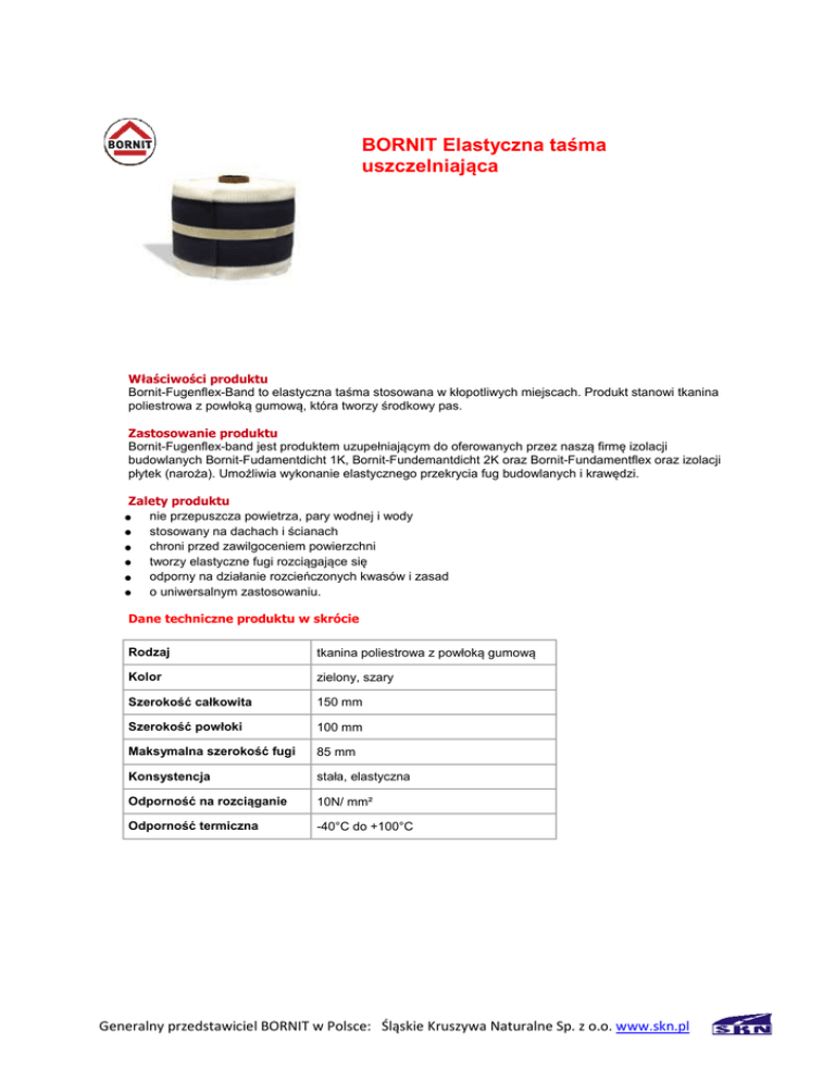 BORNIT Elastyczna taśma uszczelniająca Właściwości produktu Bornit-Fugenflex-Band Band to elastyczna taśma stosowana w kłopotliwych miejscach. Produkt stanowi tkanina poliestrowa z powłoką gumową, która tworzy środkowy pas. Zastosowanie produktu Bornit-Fugenflex-band band jest produktem uzupełniającym do oferowanych przez naszą firmę izolacji budowlanych Bornit-Fudamentdicht Fudamentdicht 1K, Bornit-Fundemantdicht Bornit 2K oraz Bornit-Fundamentflex Fundamentflex oraz izolacji płytek (naroża). Umożliwia wykonanie elastycznego przekrycia fug budowlanych i krawędzi. Zalety produktu nie przepuszcza powietrza, pary wodnej i wody stosowany na dachach i ścianach chroni przed zawilgoceniem powierzchni tworzy elastyczne fugi rozciągające się odporny na działanie rozcieńczonych kwasów i zasad o uniwersalnym zastosowaniu. • • • • • • Dane techniczne produktu w skrócie Rodzaj tkanina poliestrowa z powłoką gumową Kolor zielony, szary Szerokość całkowita 150 mm Szerokość powłoki 100 mm Maksymalna szerokość fugi 85 mm Konsystencja stała, elastyczna Odporność na rozciąganie 10N/ mm² Odporność termiczna -40°C do +100°C Generalny przedstawiciel BORNIT w Polsce: Śląskie Kruszywa Naturalne Sp. z o.o. www.skn.pl Sposób stosowania Stosowany materiał izolacyjny nakłada się jako pierwszy aż po samą fugę, a następnie od razu nakłada się na świeżo i stabilizuje taśmę BornitBornit Fugenflex-Band. Po wyschnięciu schnięciu izolacji jeszcze raz nakłada się ten sam materiał izolacyjny na krawędź taśmy celem jej zakrycia. Należy przestrzegać odpowiednich wskazówek dotyczących stosowanych materiałów izolacyjnych. 1. warstwa izolacji o grubości ok. 4 mm wykonana masą grubowarstwową grubowarstwową BORNIT Szerokość taśmy: 150 mm Część gumowana: 100 mm 2. warstwa izolacji o grubości ok. 3 mm wykonana masą grubowarstwową BORNIT W przypadku wykonywania fug roboczych nie wolno zaszpachlowywać gumowanej części taśmy. Szkic: Zabezpieczanie fug za pomocą wkładki z tkaniny Przykład: spoina pionowa w przypadku gotowych prefabrykatów betonowych stosowanych do budowy piwnicy Utylizacja Poddawać recyklingowi tylko całkowicie opróżnione pojemniki. Pozostałości substancji należy utylizować zgodnie z AVV-ASN ASN 200106 (inne tworzywa sztuczne). Uwagi Niniejsza informacja unieważnia wszystkie wcześniejsze dane techniczne dotyczące tego produktu. Dane zawarte w niniejszej informacji technicznej zestawiono zgodnie ze stanem najnowszej techniki dotyczącej zastosowania tosowania produktu. Jednakże w zależności od stanu obiektu należy zdecydować, jaki sposób postępowania jest odpowiedni. Uwzględniać sytuacje wyjątkowe występujące na budowie. Powyższe informacje nie skutkują powstaniem zobowiązania prawnego. Dostępne opakowania: rolki o długości 10 i 50 mb, 1 rolka w kartonie, 120 kartonów na palecie Generalny przedstawiciel BORNIT w Polsce: Śląskie Kruszywa Naturalne Sp. z o.o. www.skn.pl Dane kontaktowe: DZIAŁ CHEMII BUDOWLANEJ 47-364 Dobra, ul. Prudnicka 4 tel. +48 77 440 41 71 fax +48 77 407 65 17 www.bornit.com.pl Generalny przedstawiciel BORNIT w Polsce: Śląskie Kruszywa Naturalne Sp. z o.o. www.skn.pl