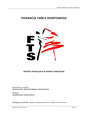PRZEPISY RYWALIZACJI W SPORCIE TANECZNYM FEDERACJA TAŃCA SPORTOWEGO PRZEPISY RYWALIZACJI W SPORCIE TANECZNYM Opracowanie i redakcja: Jarosław Grunt, Antoni Grycmacher, Tomasz Konury Redakcja: Jarosław Grunt, Tomasz Konury Obowiązuje od 01.01.2015 - Zgodnie z Uchwałą Zarządu FTS nr 74/2014 z dnia 14.12.2014r. Tylko do użytku wewnętrznego Strona 1 PRZEPISY RYWALIZACJI W SPORCIE TANECZNYM SPIS TREŚCI OGÓLNY OPIS DYSCYPLINY ZASADY WSTĘPNEGO WSPÓŁZAWODNICTWA W SPORCIE TANECZNYM ZASADY WSPÓŁZAWODNICTWA W GRUPACH HOBBY I SENIORÓW ZASADY WSPÓŁZAWODNICTWA W SPORCIE TANECZNYM SYSTEM ZDOBYWANIA SPORTOWYCH KLAS TANECZNYCH TURNIEJE PUNKTOWE ZASADY WSPÓŁZAWODNICTWA FORMACJI TANECZNYCH POSTANOWIENIA KOŃCOWE Tylko do użytku wewnętrznego Strona 2 PRZEPISY RYWALIZACJI W SPORCIE TANECZNYM OGÓLNY OPIS DYSCYPLINY Sport taneczny (ang. DanceSport) to sport drużynowy; jest to taniec wykonywany przez drużynę, tj. parę – kobietę i mężczyznę (lub grupy par tworzących drużynę) – wspólnie używających określonej techniki tańca, bezkolizyjnego sposobu przemieszczania się po parkiecie (floorcraft) oraz interpretacji artystycznej w celu stworzenia widowiska tanecznego wysokiej jakości. 1 Rodzaje współzawodnictwa w sporcie tanecznym. Sport taneczny dzielimy ze względu na stopień zaawansowania uczestników rywalizacji w następujący sposób: 1.1 Przygotowawczy klasy wojewódzkie – H, G, F klasy regionalne – E 1.2 Powszechny klasy regionalne – D, C klasy krajowe – B, A 1.3 Wyczynowy klasa międzynarodowa – S 1.4 Profesjonalny - Professional Division 2 Rodzaje rozgrywanych turniejów w sporcie tanecznym. Sport taneczny przewiduje następujące rodzaje turniejów: 2.1 Indywidualne w formule OPEN: regionalne Mistrzostwa Polski FTS - kwalifikacje do Mistrzostw Świata i Europy WDSF Akademickie Mistrzostwa Polski FTS Puchar Polski Mistrzostwa Województw Grand Prix Polski - Ekstraklasa Taneczna Open WDSF 2.2 w klasach i kategoriach tanecznych: Puchary Województw Puchary Regionów Puchar Polski punktowe 2.3 Formacje krajowe międzynarodowe Tylko do użytku wewnętrznego Strona 3 PRZEPISY RYWALIZACJI W SPORCIE TANECZNYM 3 Kategorie wiekowe i obowiązujące w nich tańce. Kategoria Dzieci Najmłodsze Wiek Do 7 lat Dzieci Młodsze 8-9 lat Dzieci Starsze 10-11 lat Juniorzy Młodsi 12-13 lat Juniorzy Starsi 14-15 lat Młodzież 16-18 lat Młodzież Starsza 16-20 lat Dorośli pow. 18 lat Senior I pow. 34 lat Senior II pow. 44 lat Senior III pow. 54 lat Senior IV pow. 64 lat Styl tańce standardowe tańce latynoamerykańskie tańce standardowe tańce latynoamerykańskie tańce standardowe tańce latynoamerykańskie tańce standardowe tańce latynoamerykańskie tańce standardowe tańce latynoamerykańskie tańce standardowe tańce latynoamerykańskie tańce standardowe tańce latynoamerykańskie tańce standardowe tańce latynoamerykańskie tańce standardowe tańce latynoamerykańskie tańce standardowe tańce latynoamerykańskie tańce standardowe tańce latynoamerykańskie tańce standardowe tańce latynoamerykańskie Tańce WA, WW, Q S, CCC, J WA, WW, Q S, CCC, J WA, T, WW, Q S, CCC, R, J WA, T, WW, F, Q S, CCC, R, P, J WA, T, WW, F, Q S, CCC, R, P, J WA, T, WW, F, Q S, CCC, R, P, J WA, T, WW, F, Q S, CCC, R, P, J WA, T, WW, F, Q S, CCC, R, P, J WA, T, WW, F, Q S, CCC, R, P, J WA, T, WW, F, Q S, CCC, R, P, J WA, T, WW, F, Q S, CCC, R, P, J WA, T, WW, F, Q S, CCC, R, P, J Ograniczenia wiekowe dotyczące rywalizacji w turniejach OPEN i WDSF: Juvenile I (Dzieci Młodsze): skończone 9 lat lub mniej w danym roku kalendarzowym Juvenile II (Dzieci Starsze): skończone 10 lub 11 lat w danym roku kalendarzowym Junior I (Juniorzy Młodsi): skończone 12 lub 13 lat w danym roku kalendarzowym Junior II (Juniorzy Starsi): skończone 14 lub 15 lat w danym roku kalendarzowym Youth (Młodzież): skończone 16, 17 lub 18 lat w danym roku kalendarzowym Under 21 (Młodzież Starsza): skończone 16, 17, 18, 19 lub 20 lat w danym roku kalendarzowym Adult (Dorośli): skończone 19 lat lub więcej w danym roku kalendarzowym Senior I: jeden z partnerów musi mieć skończone 35 lat lub więcej w danym roku kalendarzowym, drugi z partnerów musi mieć skończone 30 lat lub więcej w danym roku kalendarzowym Senior II: jeden z partnerów musi mieć skończone 45 lat lub więcej w danym roku kalendarzowym, drugi z partnerów musi mieć skończone 40 lat lub więcej w danym roku kalendarzowym Senior III: jeden z partnerów musi mieć skończone 55 lat lub więcej w danym roku kalendarzowym, drugi z partnerów musi mieć skończone 50 lat lub więcej w danym roku kalendarzowym Senior IV: jeden z partnerów musi mieć skończone 65 lat lub więcej w danym roku kalendarzowym, drugi z partnerów musi mieć skończone 60 lat lub więcej w danym roku kalendarzowym. Pary kategorii Professional Division zgodnie z restrykcjami WDSF. W turniejach otwartych (OPEN i WDSF) mogą występować następujące wyjątki: Kategorie wiekowe mogą być zgrupowane w jedną kategorię turniejową np. Dzieci Najmłodsze Dzieci Młodsze i Dzieci Starsze w połączoną kategorię Dzieci, Juniorzy Młodsi i Juniorzy Starsi połączeni w kategorię Juniorzy. Pary z kategorii Junior I mogą startować w turniejach kategorii Junior II; pary Junior II mogą startować w turniejach kategorii Młodzież. Pary kategorii Młodzież i Senior mogą Tylko do użytku wewnętrznego Strona 4 PRZEPISY RYWALIZACJI W SPORCIE TANECZNYM startować w kategorii Dorośli. W każdej kategorii wiekowej jeden z partnerów może być młodszy, nie dotyczy to jednak kategorii Seniorów. Łączenie kategorii wiekowych według powyższych zasada nie stosuje się w Mistrzostwach Województw. 4 Rodzaje rozgrywanych konkurencji. W ramach poszczególnych rodzajów współzawodnictwa dopuszcza się następujące konkurencje: Tańce standardowe (Walc Angielski, Tango, Walc Wiedeński, Fokstrot, Quickstep) Tańce latynoamerykańskie (Samba, Cha-Cha-Cha, Rumba