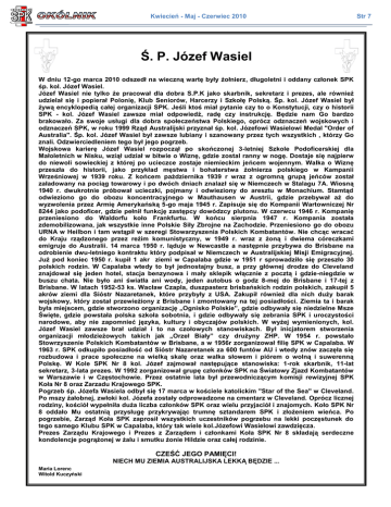Kwiecień - Maj - Czerwiec 2010 Ś. P. Józef Wasiel W dniu 12-go marca 2010 odszedł na wieczną wartę były żołnierz, długoletni i oddany członek SPK śp. kol. Józef Wasiel. Józef Wasiel nie tylko że pracował dla dobra S.P.K jako skarbnik, sekretarz i prezes, ale również udzielał się i popierał Polonię, Klub Seniorów, Harcerzy i Szkołę Polską. Śp. kol. Józef Wasiel był żywą encyklopedią całej organizacji SPK. Jeśli ktoś miał pytanie czy to o Konstytucji, czy o historii SPK - kol. Józef Wasiel zawsze miał odpowiedź, radę czy instrukcję. Będzie nam Go bardzo brakowało. Za swoje usługi dla dobra społeczeństwa Polskiego, oprócz odznaczeń wojskowych i odznaczeń SPK, w roku 1999 Rząd Australijski przyznał śp. kol. Józefowi Wasielowi Medal "Order of Australia". Śp. kol. Józef Wasiel był zawsze lubiany i szanowany przez tych wszystkich , którzy Go znali. Odzwierciedleniem tego był jego pogrzeb. Wojskowa karierę Józef Wasiel rozpoczął po skończonej 3-letniej Szkole Podoficerskiej dla Małoletnich w Nisku, wziął udział w bitwie o Wiznę, gdzie zostal ranny w nogę. Dostaje się najpierw do niewoli sowieckiej z której po ucieczce zostaje niemieckim jeńcem wojennym. Walka o Wiznę przeszła do historii, jako przykład męstwa i bohaterstwa żołnierza polskiego w Kampanii Wrześniowej w 1939 roku. Z końcem października 1939 r wraz z ogromną grupą jeńców został załadowany na pociąg towarowy i po dwóch dniach znalazł się w Niemczech w Stalagu 7A. Wiosną 1940 r. dwukrotnie próbował ucieczki, pojmany i odwieziony do aresztu w Monachium. Stamtąd odwieziono go do obozu koncentracyjnego w Mauthausen w Austrii, gdzie przebywał aż do wyzwolenia przez Armię Amerykańską 5-go maja 1945 r. Zapisuje się do Kompanii Wartowniczej Nr 8244 jako podoficer, gdzie pełnił funkcję zastępcy dowódzcy plutonu. W czerwcu 1946 r. Kompanię przeniesiono do Waldorfu koło Frankfurtu. W końcu sierpnia 1947 r. Kompania została zdemobilizowana, jak wszystkie inne Polskie Siły Zbrojne na Zachodzie. Przeniesiono go do obozu URNA w Heilbon i tam wstąpił w szeregi Stowarzyszenia Polskich Kombatantów. Nie chcąc wracać do Kraju rządzonego przez reżim komunistyczny, w 1949 r. wraz z żoną i dwiema córeczkami emigruje do Australii. 14 marca 1950 r. ląduje w Newcastle a następnie przybywa do Brisbane na odrobienie dwu-letniego kontraktu który podpisał w Niemczech w Australijskiej Misji Emigracyjnej. Już pod koniec 1950 r. kupił 1 akr ziemi w Capalaba gdzie w 1951 r sprowadziło się przeszło 30 polskich rodzin. W Capalaba wtedy to był jednostajny busz, a przy głównej drodze do Cleveland znajdował się jeden hotel, stacja benzynowa i mały sklepik włącznie z pocztą i gdzie-niegdzie w buszu chata. Nie było ani światła ani wody, jeden autobus o godz 8-mej do Brisbane i 17-tej z Brisbane. W latach 1952-53 ks. Wacław Czapla, duszpasterz brisbańskich rodzin polskich, zakupił 5 akrów ziemi dla Sióstr Nazaretanek, które przybyły z USA. Zakupił również dla nich duży barak wojskowy, który został przewieźiony z Brisbane i zmontowany na tej posiadłości. Ziemia ta i barak była miejscem, gdzie stworzono organizację „Ognisko Polskie”, gdzie odbywały się niedzielne Msze Święte, gdzie powstała polska szkoła sobotnia, i gdzie odbywały się zebrania SPK i uroczystości narodowe, aby nie zapomnieć języka, kultury i obyczajów polskich. W wyżej wymienionych, kol. Józef Wasiel zawsze brał udział i to na czołowych stanowiskach. Był inicjatorem stworzenia organizacji młodzieżowych takich jak „Orzeł Biały” czy drużyny ZHP. W 1954 r. powstało Stowrzyszenie Polskich Kombatantów w Brisbane, a w 1956r zorganizował filię SPK w Capalaba. W 1963 r. SPK odkupiło posiadłość od Sióstr Nazaretanek za 600 funtów AU i wtedy znów zaczęła się rozbudowa i prace społeczne na wielką skalę oraz walka słowem i piórem o wolną i suwerenną Polskę. W Kole SPK Nr 8 kol. Józef zajmował następujące stanowiska: 1-rok skarbnik, 11-lat sekretarz, 3-lata prezes. W 1992 zorganizował grupę członków SPK na Światowy Zjazd Kombatantów w Warszawie i w Częstochowie. Przez ostatnie lata był przewodniczącym komisji rewizyjnej SPK Koła Nr 8 oraz Zarzadu Krajowego SPK. Pogrzeb śp. Józefa Wasiela odbył się 17 marca w kościele katolickim "Star of the Sea" w Cleveland. Po mszy żałobnej, zwłoki kol. Józefa zostały odprowadzone na cmentarz w Cleveland. Oprócz licznej rodziny, kościół wypełniła duża liczba członków SPK oraz wielu przyjaciół i znajomych. Koło SPK Nr 8 oddało Mu ostatnią przysługę przykrywając trumnę sztandarem SPK i złożeniem wieńca. Po pogrzebie, Zarząd Koła SPK zaprosił wszystkich uczestników pogrzebu na lekki poczęstunek do tego samego Klubu SPK w Capalaba, który tak wiele kol.Józefowi Wasielowi zawdzięcza. Prezes Zarządu Krajowego i Prezes z Zarządem i członkami Koła SPK Nr 8 składają serdeczne kondolencje pogrążonej w żalu i smutku żonie Hildzie oraz całej rodzinie. CZEŚĆ JEGO PAMIĘCI! NIECH MU ZIEMIA AUSTRALIJSKA LEKKĄ BĘDZIE ... Maria Lorenc Witold Kuczyński Str 7 Kwiecień - Maj - Czerwiec 2010 A EULOGY FOR JÓZEF „GAGA‟ WASIEL NB; For the benefit of those who may be wondering what „Gaga‟ means, it originated from Sofia, Józef‟s first grandchild and her pronunciation of Dziadek or Dzia Dzia , the Polish term for Grandfather. From that moment forth, for those that were near and dear to him, Józef Wasiel became Gaga. He was born on the 16th August 1921 in Lodz, Poland. The 7th child of eight and the last to enter eternal life. As a young boy, he and his siblings lived a simple yet happy life on a farm in Lodz. At 15 he voluntarily enrolled at Junior Military School. In 1939, at the age of 18 and having completed his course, World War 2 commenced with the invasion of Poland by Nazi Germany. He and many of his fellow countrymen 