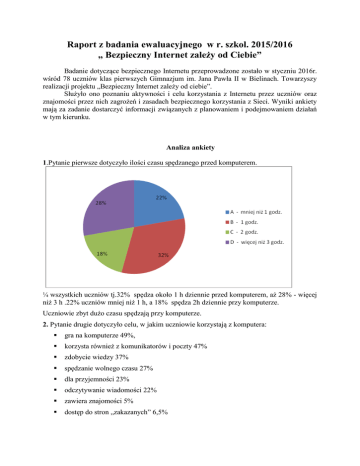 Raport z badania ewaluacyjnego w r. szkol. 2015/2016 „ Bezpieczny Internet zależy od Ciebie” Badanie dotyczące bezpiecznego Internetu przeprowadzone zostało w styczniu 2016r. wśród 78 uczniów klas pierwszych Gimnazjum im. Jana Pawła II w Bielinach. Towarzyszy realizacji projektu „Bezpieczny Internet zależy od ciebie”. Służyło ono poznaniu aktywności i celu korzystania z Internetu przez uczniów oraz znajomości przez nich zagrożeń i zasadach bezpiecznego korzystania z Sieci. Wyniki ankiety mają za zadanie dostarczyć informacji związanych z planowaniem i podejmowaniem działań w tym kierunku. Analiza ankiety 1.Pytanie pierwsze dotyczyło ilości czasu spędzanego przed komputerem. ¼ wszystkich uczniów tj.32% spędza około 1 h dziennie przed komputerem, aż 28% - więcej niż 3 h .22% uczniów mniej niż 1 h, a 18% spędza 2h dziennie przy komputerze. Uczniowie zbyt dużo czasu spędzają przy komputerze. 2. Pytanie drugie dotyczyło celu, w jakim uczniowie korzystają z komputera: gra na komputerze 49%, korzysta również z komunikatorów i poczty 47% zdobycie wiedzy 37% spędzanie wolnego czasu 27% dla przyjemności 23% odczytywanie wiadomości 22% zawiera znajomości 5% dostęp do stron „zakazanych” 6,5% Aktywność nastolatków w Internecie jest bardzo duża. Można wywnioskować, że komputer służy w większości przypadków dla celów rozrywkowych . Niepokojący jest u kilku uczniów dostęp do stron „zakazanych”. 3. Na pytanie gdzie najczęściej korzystasz z Internetu: Najczęściej padała odpowiedź: w domu – jest to 98,7% odpowiedzi wszystkich uczniów, 1 uczeń w szkole. Wszyscy więc mają dostęp do sieci w domu. 4. Kolejne pytanie brzmiało: czy możesz obejść się bez komputera. 64% badanych odpowiadało, że tak. Niepokojący jest fakt, że 29% musi codziennie korzystać z tego urządzenia, a 7% nie może bez niego żyć. W pytaniu 5 uczniowie odpowiadali, czy rodzice interesują się tym, co robią przy komputerze. Wyniki są następujące: wielu uczniów bo 60% odpowiedziało, że tak.. Aż 36%uczniów wyraziło opinię, że rodzice czasami interesują się ich działaniami na komputerze i w internecie , u 4% nie interesują się. Pytanie 6 wiąże się z 5. Czy rodzice w jakikolwiek sposób limitują Ci czas spędzony przed komputerem? W opinii uczniów 74% z nich ma limitowany czas korzystania z komputera, a 26% uczniów uważa że nie ma limitowanego czasu – pokrywa się to z odpowiedzią uczniów, którzy korzystają z komputera więcej niż 3 h. Pytanie7, 8, 9, 10, 11 i 12 to pytania o zagrożenia w internecie. W 7 pytaniu uczniowie mogli odpowiedzieć : Czy w jakikolwiek sposób ktoś obrażał Cię przy użyciu Internetu lub telefonu komórkowego? Tak odpowiedziało 28% Wynik ten odzwierciedla badania ogólnopolskie – co 5 nastolatek jest ofiarą cyberprzemocy. 8. Kolejne pytanie brzmiało: Czy słyszałeś/łaś lub czytałeś/łaś o zagrożeniach związanych z użytkowaniem Internetu? ¾ uczniów wie o zagrożeniach zw. z Internetem ,ale 25% nie słyszało nic o zagrożeniach.. 9. Czy zawierasz znajomości w Internecie? Aż 64% wszystkich uczniów zawiera znajomości w Internecie, tylko 36% nie poznaje nowych osób. 10.Co robisz w sytuacji, gdy nieznajoma osoba chce się z Tobą skontaktować za pomocą komunikatora lub chatu? 65% ankietowanych uczniów odrzuciłoby rozmowę z nieznajomym, który chciałby się usilnie skontaktować. 23% przyjmowałoby i rozpoczynałoby rozmowę – aby zorientować się z kim ma do czynienia. Bez żadnego problemu 7% przyjmowałoby i rozpoczynałoby rozmowę, a 5% od razu zaufałaby nieznajomemu i zaczęliby mówić coś o sobie. 11.Czy zdarzyło Ci się będąc na czacie lub gdzieś indziej w Internecie, że ktoś wbrew Twojej woli próbował usilnie z Tobą rozmawiać? 63% respondentów odpowiedziała, że nie zdarzyło im się spotkać z takim przypadkiem. 23% spotkali się z taką sytuacją kilka razy, tylko raz u 10% uczniów próbował ktoś z nimi usilnie rozmawiać i wielokrotnie miało do czynienia z takim przypadkiem 3 uczniów (4%). 12.Czy uważasz, że spotkania z osobami poznanymi przez Internet mogą być niebezpieczne. Na pytanie spotkania z osobami poznanymi przez Internet 59% uznało za niebezpieczne, 18% nie widzi w tym nic złego. 23% uczniów nie wie czy takie spotkania wiążą się z jakimś niebezpieczeństwem. 13. Jakie prywatne informacje podawałeś przez Internet? - możesz wybrać 3 odpowiedzi Pytanie 13 dotyczyło danych podawanych w internecie. Najczęściej umieszczają swoje zdjęcia 40%, następnie podają uczniowie adres e- mail 37%, nr tel. podaje aż 14%, adres zamieszkania 5%. Tylko 43% uczniów nie umieszcza swoich danych ani zdjęć w internecie. Większość uczniów postępuje nieodpowiedzialnie . 14. Czy według Ciebie częste korzystanie z Internetu może mieć wpływ na ograniczanie realnych kontaktów międzyludzkich? 51% uczniów klas pierwszych jest zdania, że korzystanie z internetu może mieć wpływ na ograniczenie kontaktów międzyludzkich. Połowa takiego zagrożenia nie widzi. 15 Czy zaglądasz na stronę internetową szkoły? Ostatnie pytanie dotyczyło przeglądania strony internetowej szkoły i biblioteki 65% odwiedza Na podstawie wyników uzyskanych z badania należy stwierdzić, że niezmiernie istotna jest profilaktyka, polegająca na edukacji. Należy rozmawiać z uczniami na temat zamieszczanych informacji, anonimowości, ostrożności przy zawieraniu znajomości i spotkaniu. Niepokoi zjawisko uzależnienia od komputera, ponieważ uczniowie zbyt długo czasu poświęcają surfowaniu w Internecie. WNIOSKI 1. Uczniowie zbyt dużo czasu spędzają przy komputerze –są to przejawy nadużywania Internetu. Może to prowadzić do zaniedbywania obowiązków szkolnych i różnych obszarów życia oraz izolacji (połowę przebadanych uczniów nie widzi takiego zagrożenia). Należy uświadomić młodym ludziom zagrożenia pły
