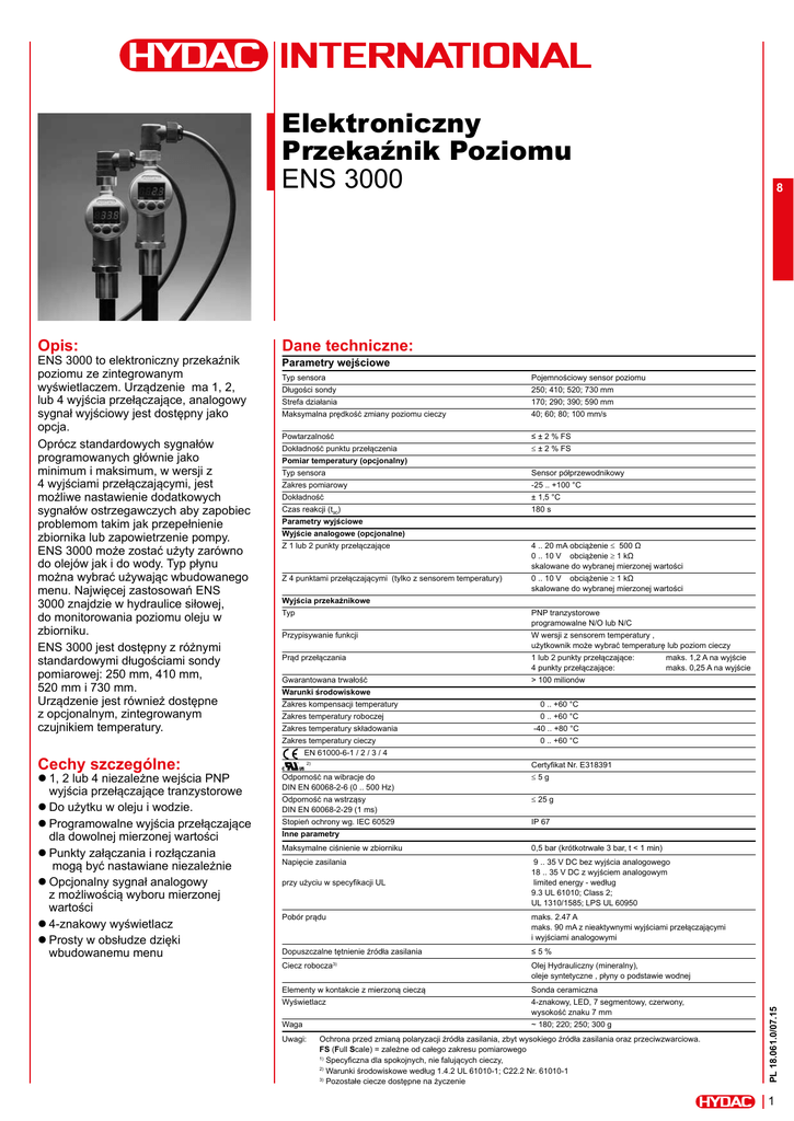 Elektroniczny Przekaźnik Poziomu ENS 3000 ENS 3000 to elektroniczny przekaźnik poziomu ze zintegrowanym wyświetlaczem. Urządzenie ma 1, 2, lub 4 wyjścia przełączające, analogowy sygnał wyjściowy jest dostępny jako opcja. Oprócz standardowych sygnałów programowanych głównie jako minimum i maksimum, w wersji z 4 wyjściami przełączającymi, jest możliwe nastawienie dodatkowych sygnałów ostrzegawczych aby zapobiec problemom takim jak przepełnienie zbiornika lub zapowietrzenie pompy. ENS 3000 może zostać użyty zarówno do olejów jak i do wody. Typ płynu można wybrać używając wbudowanego menu. Najwięcej zastosowań ENS 3000 znajdzie w hydraulice siłowej, do monitorowania poziomu oleju w zbiorniku. ENS 3000 jest dostępny z różnymi standardowymi długościami sondy pomiarowej: 250 mm, 410 mm, 520 mm i 730 mm. Urządzenie jest również dostępne z opcjonalnym, zintegrowanym czujnikiem temperatury. Cechy szczególne: 1, 2 lub 4 niezależne wejścia PNP wyjścia przełączające tranzystorowe Do użytku w oleju i wodzie. Programowalne wyjścia przełączające dla dowolnej mierzonej wartości Punkty załączania i rozłączania mogą być nastawiane niezależnie Opcjonalny sygnał analogowy z możliwością wyboru mierzonej wartości 4-znakowy wyświetlacz Prosty w obsłudze dzięki wbudowanemu menu Dane techniczne: Parametry wejściowe Typ sensora Pojemnościowy sensor poziomu Długości sondy 250; 410; 520; 730 mm Strefa działania 170; 290; 390; 590 mm Maksymalna prędkość zmiany poziomu cieczy 40; 60; 80; 100 mm/s Powtarzalność ≤ ± 2 % FS Dokładność punktu przełączenia ≤ ± 2 % FS Pomiar temperatury (opcjonalny) Typ sensora Sensor półprzewodnikowy Zakres pomiarowy -25 .. +100 °C Dokładność ± 1,5 °C Czas reakcji (t90) 180 s Parametry wyjściowe Wyjście analogowe (opcjonalne) Z 1 lub 2 punkty przełączające 4 .. 20 mAobciążenie ≤ 500 Ω 0 .. 10 V obciążenie ≥ 1 kΩ skalowane do wybranej mierzonej wartości Z 4 punktami przełączającymi (tylko z sensorem temperatury) 0 .. 10 V obciążenie ≥ 1 kΩ skalowane do wybranej mierzonej wartości Wyjścia przekaźnikowe Typ PNP tranzystorowe programowalne N/O lub N/C Przypisywanie funkcjiW wersji z sensorem temperatury , użytkownik może wybrać temperaturę lub poziom cieczy Prąd przełączania 1 lub 2 punkty przełączające: 4 punkty przełączające: Gwarantowana trwałość > 100 milionów maks. 1,2 A na wyjście maks. 0,25 A na wyjście Warunki środowiskowe Zakres kompensacji temperatury 0 .. +60 °C Zakres temperatury roboczej 0 .. +60 °C Zakres temperatury składowania -40 .. +80 °C Zakres temperatury cieczy 0 .. +60 °C EN 61000-6-1 / 2 / 3 / 4 2) Certyfikat Nr. E318391 Odporność na wibracje do DIN EN 60068-2-6 (0 .. 500 Hz) ≤5g Odporność na wstrząsy DIN EN 60068-2-29 (1 ms) ≤ 25 g Stopień ochrony wg. IEC 60529 IP 67 Inne parametry Maksymalne ciśnienie w zbiorniku 0,5 bar (krótkotrwałe 3 bar, t < 1 min) Napięcie zasilania przy użyciu w specyfikacji UL 9 .. 35 V DC bez wyjścia analogowego 18 .. 35 V DC z wyjściem analogowym limited energy - według 9.3 UL 61010; Class 2; UL 1310/1585; LPS UL 60950 Pobór prądu maks. 2.47 A maks. 90 mA z nieaktywnymi wyjściami przełączającymi i wyjściami analogowymi Dopuszczalne tętnienie źródła zasilania ≤5% Ciecz robocza3) Olej Hydrauliczny (mineralny), oleje syntetyczne , płyny o podstawie wodnej Elementy w kontakcie z mierzoną cieczą Sonda ceramiczna Wyświetlacz 4-znakowy, LED, 7 segmentowy, czerwony, wysokość znaku 7 mm Waga ~ 180; 220; 250; 300 g Uwagi: Ochrona przed zmianą polaryzacji źródła zasilania, zbyt wysokiego źródła zasilania oraz przeciwzwarciowa. FS (Full Scale) = zależne od całego zakresu pomiarowego 1) Specyficzna dla spokojnych, nie falujących cieczy, 2) Warunki środowiskowe według 1.4.2 UL 61010-1; C22.2 Nr. 61010-1 3) Pozostałe ciecze dostępne na życzenie PL 18.061.0/07.15 Opis: 8 1 Konfiguracja: Wszystkie ustawienia dostępne w ENS 3000 są zebrane w dwóch prostych w obsłudze menu. Aby zapobiec nieautoryzowanych zmianach nastaw na urządzeniu jest możliwe zastosowanie blokady programowania. Zmiana zakresów punktów przełączeń oraz histerezy: 8 Funkcja przekaźnika poziomu cieczy Długość sondy w cm Zakres. Pomiarowy w cm Punkt przełączania w cm * Histereza 25,0 17,0 0,3 .. 17,0 0,1 .. 16,8 41,0 29,0 0,5 .. 29,0 0,2 .. 28,7 52,0 39,0 0,6 .. 39,0 0,2 .. 38,6 73,0 59,0 0,9 .. 59,0 0,3 .. 58,4 w cm * Skok dla wszystkich jednostek to 0,1 cm. Funkcja Okna Długość sondy w cm Dolny punkt przełączenia w cm * Górny punkt przełączenia w cm * 25,0 0,3 .. 16,7 0,4 .. 16,8 41,0 0,5 .. 28,4 0,7 .. 28,7 52,0 0,6 . 38,3 0,9 .. 38,6 73,0 0,9 .. 57,9 1,4 .. 58,4 Dodatkowe funkcje: Tryb pracy wyjść przełączających nastawialny (funkcja przekaźnika lub funkcja okna) Możliwa zmiana kierunku przełączania (N/C lub N/O) Wyjścia przełączające mogą być przypisywane do poziomu cieczy lub temperatury Opóźnienie załączania i wyłączania nastawialne 0,00 .. 99,99 sekund Wyświetlacz można nastawiać tak aby wyświetlał: bieżący poziom cieczy, bieżącą temperaturę, wartość maksymalną, punkt przełączania 1, 2, 3, 4 lub wygasić wyświetlacz Sygnał analogowy może być przypisany (w zależności od modelu) do: -poziomu cieczy -temperatury Konfiguracja Pinów: M12x1, 4 pin Pin ENS 3X16-2 ENS 3X16-3 1 +UB +UB 2 SP 2 Analog 3 0V 0V 4 SP 1 SP 1 M12x1, 5 pin 4 5 1 3 2 Skok dla wszystkich jednostek to 0,1 cm. Przesunięcie punktu zerowego poziomu Długość sondy w cm Zakres Pomiarowy w cm* Przesunięcie 25,0 17,0 0 .. 68,0 41,0 29,0 0 .. 116,0 52,0 39,0 0 .. 156,0 73,0 59,0 0 .. 177,0 w cm * Skok dla wszystkich jednostek to 0,1 cm. Pin ENS 3X18-5 1 +UB 2 Analog 3 0V 4 SP 1 5 SP 2 M12x1, 8 pin Funkcja przekaźnika temperatury Jednostka Zakres pomiarowy Punkt przełaczenia Histereza °C -25 .. +100 -23,0 .. +100,0 1,0 .. 123,5 6 5 4 7 3 1 Skok dla wszystk