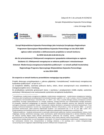 Załącznik Nr 1 do uchwały Nr 8/246/16 Zarządu Województwa Kujawsko-Pomorskiego z dnia 24 lutego 2016r. Zarząd Województwa Kujawsko-Pomorskiego jako Instytucja Zarządzająca Regionalnym Programem Operacyjnym Województwa Kujawsko-Pomorskiego na lata 2014-2020 ogłasza nabór wniosków o dofinansowanie projektów w ramach konkursu Nr RPKP.03.03.00-IZ.00-04-011/16 dla Osi priorytetowej 3 Efektywność energetyczna i gospodarka niskoemisyjna w regionie Działania 3.3. Efektywność energetyczna w sektorze publicznym i mieszkaniowym Schemat: Modernizacja energetyczna budynków publicznych – w ramach polityki terytorialnej Regionalnego Programu Operacyjnego Województwa Kujawsko-Pomorskiego na lata 2014-2020 Do wsparcia w ramach konkursu przewidziano następujący typ projektu: Projekt dotyczący przedsięwzięcia z zakresu głębokiej i kompleksowej1 modernizacji energetycznej budynków publicznych2, w tym m.in.:3 a) ocieplenie obiektu, wymiana pokrycia dachu, okien, drzwi zewnętrznych oraz oświetlenia na energooszczędne wraz z instalacją, b) przebudowa systemów grzewczych (wraz z wymianą i przyłączeniem źródła ciepła), systemów wentylacji i klimatyzacji oraz zastosowanie systemów zarządzania budynkiem, 1 Kompleksowa modernizacja energetyczna (głęboka modernizacja energetyczna) - modernizacja energetyczna budynku, rozumiana jako kompleksowe przedsięwzięcie termomodernizacyjne, zgodnie z art. 2 pkt 2 ustawy z dnia 21 listopada 2008 r. o wspieraniu termomodernizacji i remontów (Dz. U z 2014 r. poz. 712), w wyniku którego zostaną zmniejszone wartości wskaźników rocznego zapotrzebowania na: energię użytkową, energię końcową oraz nieodnawialną energię pierwotną. W przypadku ulepszenia polegającego na poprawie izolacyjności cieplnej przegród, powinny być spełnione minimalne wymagania dotyczące oszczędności energii i izolacyjności cieplnej określone w przepisach techniczno-budowlanych. Przez przepisy techniczno-budowlane rozumie się rozporządzenie Ministra Infrastruktury z dnia 12 kwietnia 2002 r. w sprawie warunków technicznych, jakim powinny odpowiadać budynki i ich usytuowanie (Dz. U. Nr 75, poz. 690 z późn. zm.). Przeprowadzona termomodernizacja musi zapewnić zwiększenie efektywności energetycznej o minimum 25%. 2 Budynek publiczny – budynek przeznaczony na potrzeby administracji publicznej, wymiaru sprawiedliwości, kultury, kultu religijnego, oświaty, szkolnictwa wyższego, nauki, wychowania, opieki zdrowotnej (wyłącznie w zakresie obiektów, których nie dotyczy wymóg objęcia mapą potrzeb zdrowotnych), społecznej lub socjalnej, sportu, z wyłączeniem obiektów przeznaczonych na cele mieszkalne np.: akademiki, internaty, bursy, domy zakonne, domy nauczycielskie. 3 Wymieniony katalog działań nie jest katalogiem zamkniętym. W ramach kompleksowej modernizacji energetycznej mogą być realizowane również inne, niewymienione w katalogu działania, o ile wynikają one z audytu energetycznego i przyczyniają się do osiągnięcia odpowiedniego poziomu efektywności energetycznej. c) realizacja mikrokogeneracji4 lub mikrotrigeneracji5 na potrzeby własne, d) budowa i przebudowa instalacji OZE w modernizowanych energetycznie budynkach, e) instalacja systemów chłodzących, w tym również z OZE. O wsparcie w ramach konkursu może ubiegać się: • • • • • • • jednostka samorządu terytorialnego, samorządowa jednostka organizacyjna, związek lub stowarzyszenie jednostek samorządu terytorialnego; inna jednostka sektora finansów publicznych; przedsiębiorstwo komunalne; organizacja pozarządowa; kościół lub związek wyznaniowy lub osoba prawna kościoła lub związku wyznaniowego; podmiot leczniczy udzielający świadczeń opieki zdrowotnej finansowanych ze środków publicznych6, partner prywatny we współpracy z podmiotem publicznym w przypadku projektu realizowanego w formule partnerstwa publiczno-prywatnego. Wielkość środków przeznaczonych na konkurs wynosi 22 267 000,00 PLN pochodzących z Europejskiego Funduszu Rozwoju Regionalnego (dalej: EFRR). Kwota jest wynikiem przeliczenia alokacji przewidzianej na realizację konkursu w Harmonogramie naborów wniosków o dofinansowanie w trybie konkursowym dla RPO WK-P na lata 2014-2020 na 2016 rok, przyjętym uchwałą Zarządu Województwa Nr 8/233/16 z dnia 24 lutego 2016 r. tj. 5 000 000,00 EUR.7 Maksymalny poziom dofinansowania ze środków EFRR wynosi do 85 % wydatków kwalifikowanych na poziomie projektu, w przypadku projektów nie objętych pomocą publiczną. Szczegóły odnośnie wysokości zabezpieczenia wkładu własnego znajdują się w kryterium B.12 Prawidłowość określenia wkładu własnego. Wartość dofinansowania UE wydatków kwalifikowalnych na poziomie budynku8 poddanego modernizacji energetycznej w ramach projektu wynosi nie więcej niż 1 mln PLN. Konkurs ma charakter zamknięty. Wnioski o dofinansowanie projektu należy składać od 29.03.2016 r. do 15.04.2016 r. Formularz wniosku o dofinansowanie projektu należy w pierwszej kolejności wypełnić i wysłać w Generatorze Wniosków o Dofinansowanie dla RPO WK-P 2014-2020 (dalej: GWD)9. Następnie należy wydrukować i złożyć ostateczną wersję formularza wniosku o dofinansowanie projektu wraz z załącznikami i pismem przewodnim w Urzędzie Marszałkowskim Województwa Kujawsko4 Mikrokogeneracja – proces technologiczny polegający na skojarzonej produkcji energii cieplnej i elektrycznej w oparciu o wykorzystanie urządzeń małych i średnich mocy. 5 Mikrotrigeneracja – efektywne wykorzystanie energii elektrycznej, ciepła i chłodu w jednej instalacji. 6 z wyłączeniem szpitali, których dotyczy wymóg objęcia mapą potrzeb zdrowotnych. 7 Według kursu Europejskiego Banku Centralnego z przedostatniego dnia roboczego miesiąca, poprzedzającego miesiąc w którym ogłoszono nabór, a który wynosi 1€=4,4534 PLN 8 Zgodnie z ustawą z dnia 7 lipca 1994 r. Prawo budowlane