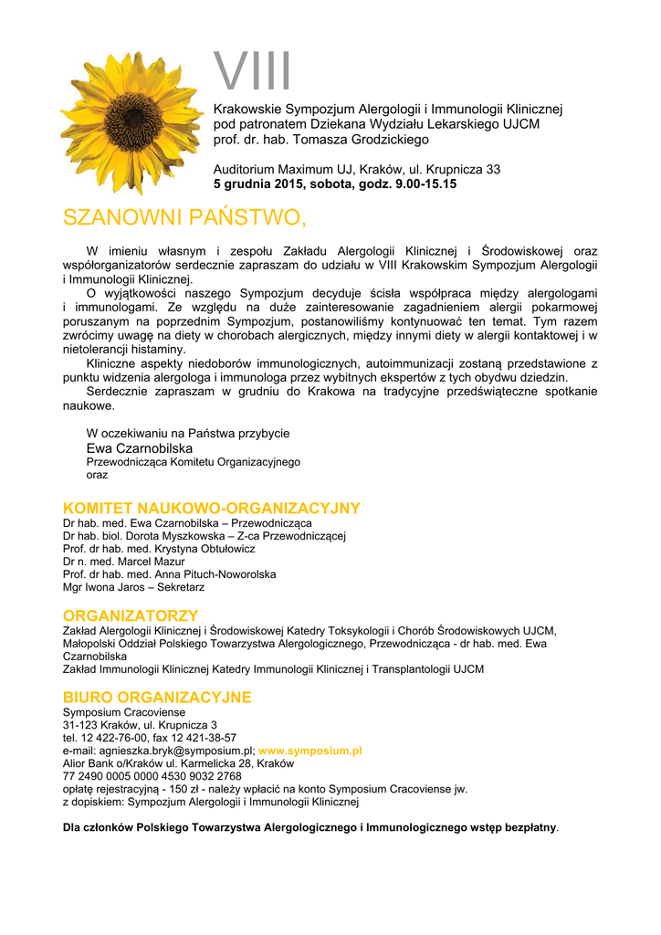 VIII Krakowskie Sympozjum Alergologii i Immunologii Klinicznej pod patronatem Dziekana Wydziału Lekarskiego UJCM prof. dr. hab. Tomasza Grodzickiego Auditorium Maximum UJ, Kraków, ul. Krupnicza 33 5 grudnia 2015, sobota, godz. 9.00-15.15 SZANOWNI PAŃSTWO, W imieniu własnym i zespołu Zakładu Alergologii Klinicznej i Środowiskowej oraz współorganizatorów serdecznie zapraszam do udziału w VIII Krakowskim Sympozjum Alergologii i Immunologii Klinicznej. O wyjątkowości naszego Sympozjum decyduje ścisła współpraca między alergologami i immunologami. Ze względu na duże zainteresowanie zagadnieniem alergii pokarmowej poruszanym na poprzednim Sympozjum, postanowiliśmy kontynuować ten temat. Tym razem zwrócimy uwagę na diety w chorobach alergicznych, między innymi diety w alergii kontaktowej i w nietolerancji histaminy. Kliniczne aspekty niedoborów immunologicznych, autoimmunizacji zostaną przedstawione z punktu widzenia alergologa i immunologa przez wybitnych ekspertów z tych obydwu dziedzin. Serdecznie zapraszam w grudniu do Krakowa na tradycyjne przedświąteczne spotkanie naukowe. W oczekiwaniu na Państwa przybycie Ewa Czarnobilska Przewodnicząca Komitetu Organizacyjnego oraz KOMITET NAUKOWO-ORGANIZACYJNY Dr hab. med. Ewa Czarnobilska – Przewodnicząca Dr hab. biol. Dorota Myszkowska – Z-ca Przewodniczącej Prof. dr hab. med. Krystyna Obtułowicz Dr n. med. Marcel Mazur Prof. dr hab. med. Anna Pituch-Noworolska Mgr Iwona Jaros – Sekretarz ORGANIZATORZY Zakład Alergologii Klinicznej i Środowiskowej Katedry Toksykologii i Chorób Środowiskowych UJCM, Małopolski Oddział Polskiego Towarzystwa Alergologicznego, Przewodnicząca - dr hab. med. Ewa Czarnobilska Zakład Immunologii Klinicznej Katedry Immunologii Klinicznej i Transplantologii UJCM BIURO ORGANIZACYJNE Symposium Cracoviense 31-123 Kraków, ul. Krupnicza 3 tel. 12 422-76-00, fax 12 421-38-57 e-mail: [email protected]; www.symposium.pl Alior Bank o/Kraków ul. Karmelicka 28, Kraków 77 2490 0005 0000 4530 9032 2768 opłatę rejestracyjną - 150 zł - należy wpłacić na konto Symposium Cracoviense jw. z dopiskiem: Sympozjum Alergologii i Immunologii Klinicznej Dla członków Polskiego Towarzystwa Alergologicznego i Immunologicznego wstęp bezpłatny. PROGRAM 9.00-9.15 UROCZYSTE OTWARCIE KONFERENCJI 9.15-11.15 SESJA ALERGOLOGICZNA Prowadzący: prof. Grażyna Bochenek, prof. Krzysztof Sładek 1. Alergia na gluten – wybrane przypadki kliniczne. Prof. Krystyna Obtułowicz 2. Diety w alergii kontaktowej. Prof. Radosław Śpiewak 3. Dieta ubogosalicylanowa w nadwrażliwości na NLPZ. Prof. Lucyna Mastalerz 4. Obraz kliniczny i postępowanie dietetyczne w nietolerancji histaminy. Dr Marcel Mazur 5. Test aktywacji bazofilów (BAT) w diagnostyce alergologicznej. Dr hab. Ewa Czarnobilska 11.15-12.15 Przerwa – Lunch 12.15-13.00 Sesja Posterowa Prowadzący: dr Grzegorz Porębski, dr Marcin Stobiecki 1. 2. 3. 4. 5. 6. 7. Test aktywacji bazofilów BAT- wpływ czasu przechowywania próbki na wynik testu. Małgorzata Leśniak, Wojciech Dyga, Ewa Czarnobilska Cytologia błony śluzowej nosa w diagnostyce alergicznego nieżytu nosa. Dorota Myszkowska, Ewa Czarnobilska Alergia dróg oddechowych u uczniów krakowskich szkół – wyniki badań profilaktycznych. Marcel Mazur, Ewa Czarnobilska Pokrzywka z wysokim stężeniem przeciwciał anty-TPO. Zlata Chaykivska, Grażyna Antoszczyk, Ewa Czarnobilska Reakcje nadwrażliwości na antybiotyki - spektrum kliniczne i epidemiologia. Grzegorz Porębski Anafilaksja jako kliniczny element rozpoznania mastocytozy. Marcin Stobiecki, Małgorzata Sacha Wpływ rehabilitacji pulmonologicznej w Kopalni Soli “Wieliczka” na kontrolę astmy – doniesienie wstępne. Magdalena Kostrzon, Krzysztof Czarnobilski, Ewa Czarnobilska. 13.00-15.00 SESJA IMMUNOLOGICZNA Prowadzący prof. Barbara Rogala, prof. Maciej Siedlar 1. IgE jako niecharakterystyczny wyróżnik skazy atopowej. Prof. Barbara Rogala 2. Immunoterapia w chorobach autoimmunizacyjnych. Prof. Danuta Kowalczyk 3. Immunoterapia swoista w chorobach autoimmunizacyjnych. Prof. Andrzej Bożek 4. Objawy skórne w niedoborach immunologicznych. Prof. Anna Pituch-Noworolska 5. Monitoring indywidualny w domu, szkole i pracy alergika. Dr hab. Dorota Myszkowska 15.00-15.15 Podsumowanie Konferencji