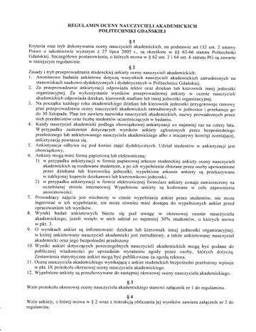 REGULAMIN OCENY NAUCZYCIELI AKADEMICKICH PoLITECHNIKI GDAŃSKIEJ s1 Kryteriaoraz tryb dokonywaniaoceny nauczycieliakademickich,na podstawieart.l3f ust. 2 ustawy Prawo o szkolnictwiewyższymz 27 lipca 2005 r., są określone w $$ 62-66 statutuPolitechniki Gdańskiej.Szczegółowe postanowienia, o którychmowaw $ 62 ust.2 i 64 ust' 6 statutuPG są zawartę w niniejszym regulam inie. s2 Zasadyi trybprzeprowadzania studenckiej ankietyocenynauczycieliakademickich: l. Anonimowe badaniaankietowedotycząwszystkichnauczycie|iakademickichzatrudnionychna stanowiskach naukowo.dydaktycznych i dydaktycznych w PoIitechnice Gdańskiej. 2. Za przeprowadzęnie ankietyzacjiodpowiadarektor oraz dziekan lub kierownik innej jednostki organizacyjnej.Za wykorzystanie wyników przeprowadzonejankiety w ocenie nauczycieli akademickichodpowiadadziekan,kierownikstudiumlub innejjednostkiorganizacyjnej. 3. Na początkukażdegoroku akadernickiego dziekanlub kierownikjednostkiprzygotowujeramowy plan przeprowadzenia oceny nauczycieliakademickichzatrudnionychw.iednostcei przekazujego do 30 listopada.Plan ten zawieranazwiskanauczycieliakademickich,nazwyprowadzonychprzez nich przedmiotóworaz liczbęstudentówuczestniczących w badaniu' 4' Każdy nauczyciel akademicki podlegaobowiązkowejankietyzacjico najmniej raz na cztery |ata' W przypadku zastrzeżzęńdotyczących wyników ankiety zgłoszonych przez bezpośredniego przełozonego Iub ankietowanego nauczycie|aakademickiego albo z inicjatywykomisji oceniającej' powtarzasię. ankietyzację 5. Ankietyzacjaodbywa się pod koniec zajęćdydaktycznych.L]działstudęntóww ankietyzacjijest obowiązkowy. 6. Ankietymogąmieó formępapierową|ube|ektroniczną: 1) w przypadkuankietyzacjiw formie papierowejarkuszestudenckiejankietyoceny nauczycieli akademickichsąrozdawanęstudentom, a po ich wypełnieniu zbieraneprzezosobyupowaznione przez dziekana |ub kierownika jednostki; wypełnione arkusze ankiety są przekazywane w zaklejonejkoperciedziekanowilub kierownikowijednostki, 2) w przypadkuankietyzacjiw formie elektronicznejformularz ankietyzostaje zamieszczonyna uczelnianejstronię internetowejWypełnioneankiety są kodowane w ceIu zapewnienia anonimowości. 7. Prowadzącyzajęciajest nieobecny w czasie wypełnianiaankiet przez studentów,nie moie ingerowaćw ich wypełnianie'nie moze równiez mieć dostępudo wypełnionychankiet przed opracowaniem ich wyników. 8. Wyniki badań ankietowych bierze się pod uwagę W okresowej ocenie nauczyciela akademickiego' jezeli wzięło w nich udział co najmniej 30% studentów' o których mowa w pkt. 3. 9, o wynikach aŃiet są informowani: dziekan lub kierownik innej jednostki organizacyjnej, w ktorej ankietowany nauczyciel akademicki jest zatrudniony,a takie ankietowany nauczyciel akademickL orazj ego bezpośredniprzełoŻony 10. Wyniki arrkiet dotyczących poszczególnych nauczycieli akademickich mogą być podane do publicznej wiadomości po uprzednim wyrazeniu zgody przez osoby, ktorych dotyczą. ZestawieniastatystyczneaŃiet mogą być publikowanęza zgodąrektora' l l. ocenę nauczycie|a akademickiego wynikającąz ankietstudenckichbezpośredni przełoż:ony wpisuje w pkt.IX protokotuokresowejoceny nauczycielaakademickiego. 12' Wypełnione ankietysą przechowywane do następnej okresowejoceny nauczycie|aakademickiego' s3 Wzór protokołuokresowej oceny nauczycie|a akademickiego Stanowi załączniknr 1 do regu|aminu. s4 jej wyników zawierazałącznik Wzór ankięty,o której mowa w $ 2 wrazz instrukcjąobliczania nr 2 do resulaminu. Załączniknr 1 do Regulaminuoceny jednostkaorganizacyjna PRoToKoŁ oKRESowEJ oCENY NAUCZYCIELA AKADEMICKIEGO . .' '.. . ) (okresobjętyoceną I. Dane osobowe(wypełniapracownik) 1. Imię,nazwisko,tytuł/stopień naukowy 2' Data rozpoczęciapracy w PolitechniceGdańskiej 3. Zajmowanestanowisko'rok zatrudnienia na Ęm stanowisku............' II. Działalność dydaktyczna (wypełniapracownik) l. Autorstwopodręczrrików,skryptów akademickichi innycli pomocy dydaktycznych f . Udział w rozwoju laboratoriów dydaktycznych 3, Prowadzenieprac dyplomowych 4, Pełnieniefunkcji opiekunaroku, grupy,praktyki 5. Współpracaz kołaminaukowymistudentów popuIaryzatorska 6, Publikacjezzakresu dydaktyki i działa|ność 7. Rozwijaniewspółpracydydaktycznejw ska|imiędzyucze|nianej' międzynarodowejorazze środowiskiem gospodarczym i samorządowym 8. Nagrody i wyróznienia uczelniane,resortowe,instytucjikrajowych i zagraniczIlychzwięatlych Z procesemkształcenia 9 . U działw ko l egiach redakcyjnych czasopi sm dydaktycznych l0. Udziałw komitetachnaukowychi organizacyjnychkonferencjidydaktycznych 1l. Aktywnośćw pozyskiwaniu środkówna działa|nośó dydaktycznąze źrodełzewnętrznych 12. Liczba godzin rea|izowanychponadpensumw okresieobjętymoceną III. Twórcze osiągnięcianaukowe lub artystyczne'wynalazcze i wdrożeniowe udokumentowane(wypełniapracownik) 1. Pracenaukowelub artvsfvczne 2. Publikacjenaukowez uwzględnieniemrangi wydawnictwlub czasopism,w których się ukazaty 3. Wynalazki,patenĘ i wzory uzytkowez uwzględnieniemich wdrożenia 4. Nagrody i wyróznienia uczelniane,resortowe,instytucjikrajowych i zagraniczl.tychoraztowarzystw naukowychlub aĄstycznych 5. opracowanei wdrozonenowe techno|ogie,urządzenia' stanowiskai laboratoria na rzecz środowiskanaukowegolub naukowo-technicznego IV. Działalność i gospodarki krajowej (wypełniapracownik) l. Funkcje pełnionew krajowych i międzynarodowychorganizac1achoraz towarzystwachnaukowych i naukowo-technicznych lub aĄsĘ cznych 2. Udział w kolegiach redakcyjnych czasopism naukowych orazrecenzowanieprac naukowych 3. Udział w komitetachnaukowych prestizowychkonferencji 4, Udziałw postępowaniuo nadaniestopniitytułów naukowych 5. Akfvwnośćw oozvskiwaniu środkówna badaniaze źródełzewnętrznych naukowymi samorządowym 6' osiągnięciabędącewynikiem współpracyze środowiskiem V. Działalnośćorganizacyjna n^ rzecz wydziału(studium, bibliotek