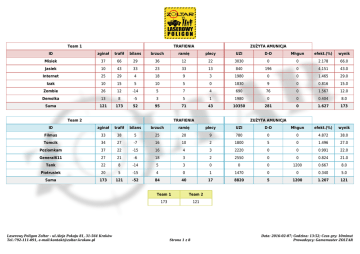 Team 1 TRAFIENIA ZUŻYTA AMUNICJA ID zginał trafił bilans brzuch ramię plecy UZI D-D Mhgun efekt.(%) wynik Misiek 37 66 29 36 12 22 3030 0 0 2.178 66.0 Jasiek 10 43 33 23 33 13 840 196 0 4.151 43.0 Internet 25 29 4 18 9 3 1980 0 0 1.465 29.0 Izak 10 15 5 10 5 0 1830 9 0 0.816 15.0 Zombie 26 12 -14 5 7 4 690 76 0 1.567 12.0 Demolka 13 8 -5 3 5 1 1980 0 0 0.404 8.0 Suma 121 173 52 95 71 43 10350 281 0 1.627 173 Team 2 TRAFIENIA ZUŻYTA AMUNICJA ID zginał trafił bilans brzuch ramię plecy UZI D-D Mhgun efekt.(%) wynik Filmus 33 38 5 25 20 9 780 0 0 4.872 38.0 Tomcik 34 27 -7 16 10 2 1800 5 0 1.496 27.0 Poziomkam 37 22 -15 16 4 3 2220 0 0 0.991 22.0 General611 27 21 -6 18 3 2 2550 0 0 0.824 21.0 Tank 22 8 -14 5 3 0 0 0 1200 0.667 8.0 Piotrusiek 20 5 -15 4 0 1 1470 0 0 0.340 5.0 Suma 173 121 -52 84 40 17 8820 5 1200 1.207 121 Laserowy Poligon Zoltar - ul.Aleja Pokoju 81, 31-564 Kraków Tel.:792-111-091, e-mail:[email protected] Team 1 Team 2 173 121 Strona 1 z 8 Data: 2016-02-07; Godzina: 13:52; Czas gry: 10minut Prowadzący: Gamemaster ZOLTAR Team 1 TRAFIENIA ZUŻYTA AMUNICJA ID zginał trafił bilans brzuch ramię plecy UZI D-D Mhgun Shg ATank efekt.(%) wynik Internet 55 112 57 77 31 14 5160 0 0 0 0 2.171 112.0 Jasiek 12 86 74 45 53 18 6120 1 0 0 0 1.405 86.0 Misiek 55 62 7 48 15 9 5220 10 0 0 0 1.185 62.0 Iron Top 43 43 0 19 14 14 5670 8 0 0 0 0.757 43.0 Bron 26 27 1 18 4 6 6330 7 0 0 0 0.426 27.0 Max 30 8 -22 5 3 0 4500 3 0 0 0 0.178 8.0 Suma 221 338 117 212 120 61 33000 29 0 0 0 1.023 338 Team 2 TRAFIENIA ZUŻYTA AMUNICJA ID zginał trafił bilans brzuch ramię plecy UZI D-D Mhgun Shg ATank efekt.(%) wynik Tomcik 65 74 9 47 27 6 4830 0 0 0 0 1.532 74.0 Filmus 60 57 -2 38 34 9 1380 5 0 0 0 4.116 57.0 Poziomkam 80 34 -45 22 5 7 4500 4 0 0 0 0.755 34.0 General611 55 28 -27 24 4 2 4770 0 0 0 0 0.587 28.0 Tank 35 22 -13 9 9 4 0 0 2460 5 2 0.892 22.0 Piotrusiek 45 6 -39 3 3 0 2580 0 0 0 0 0.233 6.0 Suma 340 221 -117 143 82 28 18060 9 2460 5 2 1.076 221 Laserowy Poligon Zoltar - ul.Aleja Pokoju 81, 31-564 Kraków Tel.:792-111-091, e-mail:[email protected] Team 1 Team 2 338 221 Strona 2 z 8 Data: 2016-02-07; Godzina: 11:59; Czas gry: 25minut Prowadzący: Gamemaster ZOLTAR Team 1 TRAFIENIA ZUŻYTA AMUNICJA ID zginał trafił bilans brzuch ramię plecy UZI D-D Mhgun Snp ATank efekt.(%) wynik Internet 56 102 46 67 43 12 4980 8 0 0 0 2.045 102.0 Jasiek 20 99 79 54 61 26 5700 15 0 0 0 1.732 99.0 Misiek 60 79 19 47 19 20 5400 9 0 0 0 1.461 79.0 Iron Tom 12 26 14 13 14 2 5940 0 0 0 0 0.438 26.0 Pro 25 25 0 13 5 8 4860 59 0 0 0 0.508 25.0 Max 12 10 -2 6 1 3 4770 0 0 0 0 0.210 10.0 Suma 185 341 156 200 143 71 31650 91 0 0 0 1.074 341 Team 2 TRAFIENIA ZUŻYTA AMUNICJA ID zginał trafił bilans brzuch ramię plecy UZI D-D Mhgun Snp ATank efekt.(%) wynik Tomcik 66 65 -1 50 17 9 4590 59 0 0 0 1.398 65.0 Filmus 48 40 -8 27 19 9 1290 0 0 0 0 3.101 40.0 Poziomkam 67 32 -35 27 2 3 4650 0 0 0 0 0.688 32.0 General611 49 29 -20 24 2 5 3990 0 0 0 0 0.727 29.0 Tank 60 17 -43 8 5 4 0 0 1710 12 4 0.985 17.0 Piotrusiek 51 2 -49 1 1 0 1740 11 0 0 0 0.114 2.0 Suma 341 185 -156 137 46 30 16260 70 1710 12 4 1.025 185 Laserowy Poligon Zoltar - ul.Aleja Pokoju 81, 31-564 Kraków Tel.:792-111-091, e-mail:[email protected] Team 1 Team 2 341 185 Strona 3 z 8 Data: 2016-02-07; Godzina: 12:46; Czas gry: 25minut Prowadzący: Gamemaster ZOLTAR Team 1 TRAFIENIA ZUŻYTA AMUNICJA ID zginał trafił bilans brzuch ramię plecy UZI D-D Mhgun Shg Snp Jasiek 38 161 123 114 88 28 5670 1 0 0 0 0 2.839 161.0 Internet 80 99 19 80 33 4 5160 2 0 0 0 0 1.918 99.0 Misiek 107 93 -14 76 9 13 5010 29 0 0 0 0 1.846 93.0 Izak 77 41 15 26 9 6 5700 0 0 0 0 0 0.719 41.0 Zombie 56 32 -24 24 5 5 4230 1 0 0 0 0 0.756 32.0 Demolka 52 15 -36 10 4 2 4770 0 0 0 0 0 0.314 15.0 Suma 410 441 83 330 148 58 30540 33 0 0 0 0 1.442 441 Team 2 TRAFIENIA ATank efekt.(%) wynik ZUŻYTA AMUNICJA ID zginał trafił bilans brzuch ramię plecy UZI D-D Mhgun Shg Snp Filmus 58 94 36 60 59 28 2190 0 0 0 0 0 4.292 94.0 Tomcik 76 92 16 51 48 9 5100 0 0 0 0 0 1.804 92.0 General611 74 76 2 65 7 7 5490 0 0 0 0 0 1.384 76.0 Poziomkam 77 39 -36 28 7 4 5700 0 0 0 0 0 0.684 39.0 Tank 90 34 -56 21 8 5 0 0 2520 3 13 4 1.339 34.0 Piotrusiek 68 23 -45 16 6 3 3150 0 0 0 0 0 0.730 23.0 Suma 443 358 -83 241 135 56 21630 0 2520 3 13 4 1.481 358 Laserowy Poligon Zoltar - ul.Aleja Pokoju 81, 31-564 Kraków Tel.:792-111-091, e-mail:[email protected] Team 1 Team 2 441 358 Strona 4 z 8 ATank efekt.(%) wynik Data: 2016-02-07; Godzina: 13:37; Czas gry: 25minut Prowadzący: Gamemaster ZOLTAR Drużyny Miejsce Laserowy Poligon Zoltar - ul.Aleja Pokoju 81, 31-564 Kraków Tel.:792-111-091, e-mail:[email protected] Nazwa Rozgrywki 1 2 3 4 Suma Team 1 173 338 341 441 1293 Team 2 121 221 185 358 885 Strona 5 z 8 Data: 2016-02-07 Prowadzący: Gamemaster ZOLTAR Zestawienie wg wyniku Miejsce TRAFIENIA ZUŻYTA AMUNICJA ID zginał trafił bilans brzuch ramię plecy UZI D-D Mhgun Shg Snp aTank efekt.(%) wynik Jasiek 57.00 272.10 215.10 162.30 170.70 62.70 11754.00 304.20 0.00 0.00 0.00 0.00 2.257 272.10 Misiek 188.70 239.40 50.70 156.60 43.80 58.20 13923.00 28.80 0.00 0.00 0.00 0.00 1.716 239.40 Internet 152.10 231.30 79.20 161.40 77.70 22.50 12150.00 6.00 0.00 0.00 0.00 0.00 1.903 231.30 4 Tomcik 175.20 179.10 3.90 112.80 70.20 17.40 11412.00 42.90 0.00 0.00 0.00 0.00 1.564 179.10 5 Filmus 149.10 171.60 22.50 112.50 97.20 41.10 4086.00 3.00 0.00 0.00 0.00 0.00 4.197 171.60 6 General611 147.30 111.30 -36.00 94.80 12.30 11.40 12375.00 0.00 0.00 0.00 0.00 0.00 0.899 111.30 7 Iron Top 103.20 103.20 0.00 45.60 33.60 33.60 13608.00 19.20 0.00 0.00 0.00 0.00 0.757 103.20 8 Poziomkam 189.90 96.00 -93.90 70.20 14.40 12.90 12240.00 2.40 0.00 0.00 0.00 0.00 0.784 96.00 9 Izak 122.40 94.20 -28.20 61.20 25.80 7.20 12330.00 27.00 0.00 0.00 0.00 0.00 0.762 94.20 10 Zombie 145.20 74.40 -70.80 43.80 27.00 18.00 7146.00 229.20 0.00 0.00 0.00 0.00 1.009 74.40 11 Bron 62.40 64.80 2.40 43.20 9.60 14.40 15192.00 16.80 0.00 0.00 0.00 