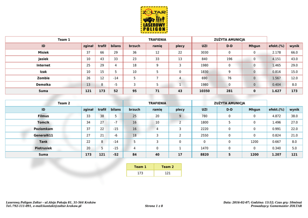 Team 1 TRAFIENIA ZUŻYTA AMUNICJA ID zginał trafił bilans