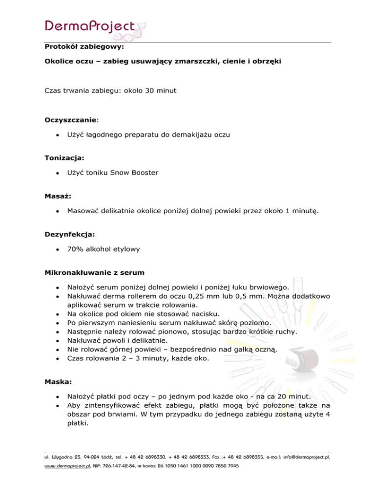 Protokół zabiegowy: Okolice oczu – zabieg usuwający zmarszczki, cienie i obrzęki Czas trwania zabiegu: około 30 minut Oczyszczanie: Użyć łagodnego preparatu do demakijażu oczu Tonizacja: Użyć toniku Snow Booster Masaż: Masować delikatnie okolice poniżej dolnej powieki przez około 1 minutę. Dezynfekcja: 70% alkohol etylowy Mikronakłuwanie z serum Nałożyć serum poniżej dolnej powieki i poniżej łuku brwiowego. Nakłuwać derma rollerem do oczu 0,25 mm lub 0,5 mm. Można dodatkowo aplikować serum w trakcie rolowania. Na okolice pod okiem nie stosować nacisku. Po pierwszym naniesieniu serum nakłuwać skórę poziomo. Następnie należy rolować pionowo, stosując bardzo krótkie ruchy. Nakłuwać powoli i delikatnie. Nie rolować górnej powieki – bezpośrednio nad gałką oczną. Czas rolowania 2 – 3 minuty, każde oko. Maska: Nałożyć płatki pod oczy – po jednym pod każde oko - na ca 20 minut. Aby zintensyfikować efekt zabiegu, płatki mogą być położone także na obszar pod brwiami. W tym przypadku do jednego zabiegu zostaną użyte 4 płatki. ul. Wygodna 23, 94-024 Łódź, tel: + 48 42 6898330, + 48 42 6898333, Fax :+ 48 42 6898355, e-mail: [email protected], www.dermaproject.pl, NIP: 726-147-42-84, nr konta: 26 1050 1461 1000 0090 7850 7945 Na zakończenie: Krem do oczu Rezultat: Zmniejsza widoczność drobnych linii i głębokich zmarszczek w okolicach oczu Zmniejsza widoczność czerwono/sinych cieni pod oczami Poprawia cyrkulację krwi wokół oczu, zmniejsza obrzęki. Częstotliwość zabiegów: Raz na tydzień Rada: Zalecane jest bardzo ostrożne nakłuwanie ze względu na wrażliwą okolicę. Można zastosować lekki nacisk w miejscu „kurzych łapek”. Zalecana pielęgnacja domowa: Serum do oczu Krem do oczu Płatki do oczu Zalecana liczba zabiegów: 8 to 10 zabiegów Technika rolowania: W okolicy oczu powinno się używać derma rollera o długości igiełek 0,25 mm. W przypadku głębokich zmarszczek i zwiotczenia skóry można użyć derma rollera 0,5 mm. Pacjent powinien zamknąć oczy podczas zabiegu. ul. Wygodna 23, 94-024 Łódź, tel: + 48 42 6898330, + 48 42 6898333, Fax :+ 48 42 6898355, e-mail: [email protected], www.dermaproject.pl, NIP: 726-147-42-84, nr konta: 26 1050 1461 1000 0090 7850 7945 Naciągnąć “kurze łapki” I nakłuwać z lekkim naciskiem. Nie rolować powiek. Nie wolno rolować okolic, gdzie nie ma kości. Nakłuwać poniżej oka bez nacisku, wzdłuż i w poprzek ułożenia zmarszczki. Aby usunąć worki pod oczami, należy nakłuwać w kierunku poziomym i ukośnym. Nakłuwanie poniżej brwi zapobiega opadaniu górnej powieki. ul. Wygodna 23, 94-024 Łódź, tel: + 48 42 6898330, + 48 42 6898333, Fax :+ 48 42 6898355, e-mail: [email protected], www.dermaproject.pl, NIP: 726-147-42-84, nr konta: 26 1050 1461 1000 0090 7850 7945