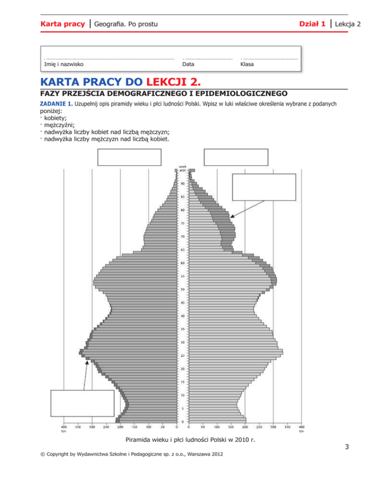 Karta pracy Imię i nazwisko | Geografia. Po prostu Dział 1 Data | Lekcja 2 Klasa KARTA PRACY DO LEKCJI 2. FAZY PRZEJŚCIA DEMOGRAFICZNEGO I EPIDEMIOLOGICZNEGO ZADANIE 1. Uzupełnij opis piramidy wieku i płci ludności Polski. Wpisz w luki właściwe określenia wybrane z podanych poniżej: kobiety; mężczyźni; nadwyżka liczby kobiet nad liczbą mężczyzn; nadwyżka liczby mężczyzn nad liczbą kobiet. Piramida wieku i płci ludności Polski w 2010 r. 3 © Copyright by Wydawnictwa Szkolne i Pedagogiczne sp. z o.o., Warszawa 2012 Karta pracy | Geografia. Po prostu Dział 1 | Lekcja 2 ZADANIE 2. Oznacz na piramidzie wieku i płci: niebieską linią – dolną granicę wieku produkcyjnego; zieloną linią – dolną granicę wieku poprodukcyjnego; zamaluj na czerwono swój rocznik; zakreskuj roczniki urodzone w czasie II wojny światowej. ZADANIE 3. Na podstawie piramidy wieku i płci określ liczbę osób, które w 2010 r. miały 18 lat. Obliczenia: Odpowiedź: ......................................................................................................................................................................... ZADANIE 4. Na podstawie wybranych danych z tabeli oblicz: A. wskaźnik przyrostu naturalnego; B. wskaźnik feminizacji; C. wskaźnik maskulinizacji. Liczba ludności Polski w dniu 31.12.2010 r. (w tys.) 38 200 Liczba mężczyzn (w tys.) 18 444 Średnia długość życia kobiet (w latach) 80 Urodzenia żywe (w tys.) 413 Zgony (w tys.) 378 Migracje zagraniczne (w tys.) imigracja emigracja 15 17 Obliczenia: Odpowiedź: ............................................................................................................................................... ZADANIE 5. Spośród przedstawionych piramid wieku i płci podpisz tę, która przedstawia strukturę wieku i płci Wielkiej Brytanii. Podaj cztery argumenty, które zdecydowały o twoim wyborze. Argumenty: 1. .......................................................................................................................................................................................... 2. .......................................................................................................................................................................................... 3. .......................................................................................................................................................................................... 4. .......................................................................................................................................................................................... 4 © Copyright by Wydawnictwa Szkolne i Pedagogiczne sp. z o.o., Warszawa 2012