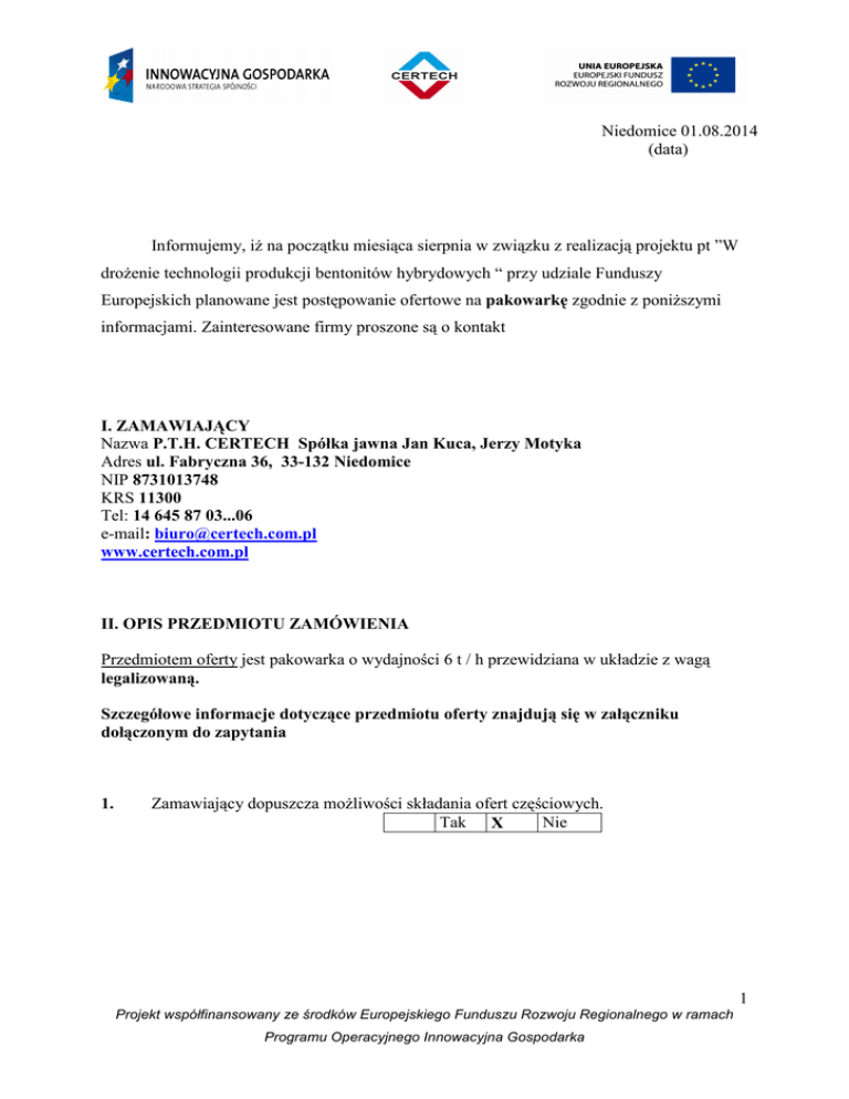 Niedomice 01.08.2014 (data) Informujemy, iż na początku miesiąca sierpnia w związku z realizacją projektu pt ”W drożenie technologii produkcji bentonitów hybrydowych “ przy udziale Funduszy Europejskich planowane jest postępowanie ofertowe na pakowarkę zgodnie z poniższymi informacjami. Zainteresowane firmy proszone są o kontakt I. ZAMAWIAJĄCY Nazwa P.T.H. CERTECH Spółka jawna Jan Kuca, Jerzy Motyka Adres ul. Fabryczna 36, 33-132 Niedomice NIP 8731013748 KRS 11300 Tel: 14 645 87 03...06 e-mail: [email protected] www.certech.com.pl II. OPIS PRZEDMIOTU ZAMÓWIENIA Przedmiotem oferty jest pakowarka o wydajności 6 t / h przewidziana w układzie z wagą legalizowaną. Szczegółowe informacje dotyczące przedmiotu oferty znajdują się w załączniku dołączonym do zapytania 1. Zamawiający dopuszcza możliwości składania ofert częściowych. Tak X Nie 1 Projekt współfinansowany ze środków Europejskiego Funduszu Rozwoju Regionalnego w ramach Programu Operacyjnego Innowacyjna Gospodarka III KRYTERIA OCENY Oferty przedstawione przez Oferentów będą oceniane według następujących kryteriów i przypisanych im wag: 1. Cena- 50 % 2. Zgodność konstrukcji z założeniami technologicznymi -10% 3. Gwarancja -10% 4. Systemu pakowania (optymalizacja systemu do rodzaju produktu) -30% Oferta, która otrzyma największą ilość punktów zostanie wybrana jako najkorzystniejsza. Ocenie nie będą podlegać oferty nie kompletne lub złożone po terminie IV. TERMIN WYKONANIA ZAMÓWIENIA Termin wykonania przedmiotu zamówienia: IV kwartał 2014 roku V. MIEJSCE ORAZ TERMIN SKŁADANIA OFERT 1. Oferta powinna być przesłana za pośrednictwem: poczty elektronicznej na adres: [email protected] , poczty, kuriera lub też dostarczona osobiście na adres: P.T.H. CERTECH Spółka jawna Jan Kuca, Jerzy Motyka ul. Fabryczna 36, 33-132 Niedomice do dnia 26.08.2014 Dla ofert przekazanych osobiście przesłanych pocztą/kurierem decyduje data wpływu do Sekretariatu mieszczącego się w siedzibie Firmy CERTECH 2. Ocena dostarczonych ofert w wyznaczonym powyżej terminie zostanie dokonana w ciągu 1 m-c 3. Oferty złożone po terminie nie będą rozpatrywane 2 Projekt współfinansowany ze środków Europejskiego Funduszu Rozwoju Regionalnego w ramach Programu Operacyjnego Innowacyjna Gospodarka V. DODATKOWE INFORMACJE Dodatkowych informacji udziela- Ewelina Załęska pod numerem telefonu +48 14 645 87 03 wew 114 oraz adresem email: [email protected] Z poważaniem Jerzy Motyka 3 Projekt współfinansowany ze środków Europejskiego Funduszu Rozwoju Regionalnego w ramach Programu Operacyjnego Innowacyjna Gospodarka