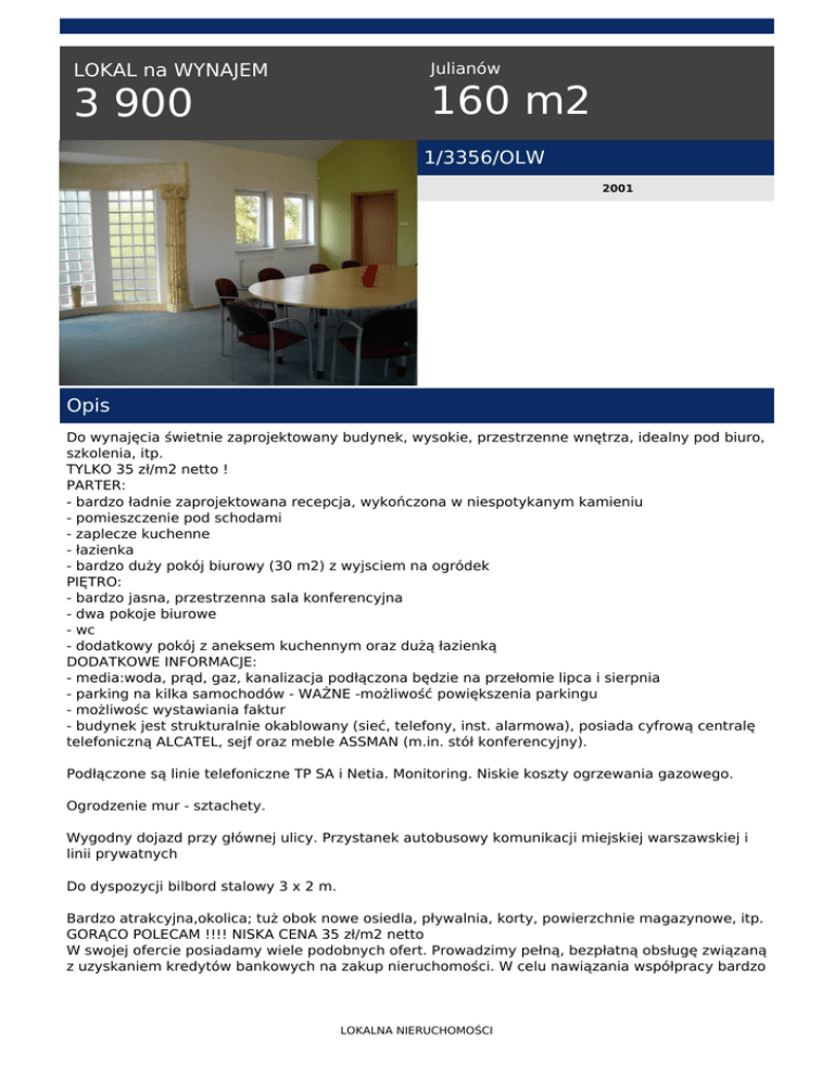 Julianów LOKAL na WYNAJEM 160 m2 3 900 1/3356/OLW 2001 Opis Do wynajęcia świetnie zaprojektowany budynek, wysokie, przestrzenne wnętrza, idealny pod biuro, szkolenia, itp. TYLKO 35 zł/m2 netto ! PARTER: - bardzo ładnie zaprojektowana recepcja, wykończona w niespotykanym kamieniu - pomieszczenie pod schodami - zaplecze kuchenne - łazienka - bardzo duży pokój biurowy (30 m2) z wyjsciem na ogródek PIĘTRO: - bardzo jasna, przestrzenna sala konferencyjna - dwa pokoje biurowe - wc - dodatkowy pokój z aneksem kuchennym oraz dużą łazienką DODATKOWE INFORMACJE: - media:woda, prąd, gaz, kanalizacja podłączona będzie na przełomie lipca i sierpnia - parking na kilka samochodów - WAŻNE -możliwość powiększenia parkingu - możliwośc wystawiania faktur - budynek jest strukturalnie okablowany (sieć, telefony, inst. alarmowa), posiada cyfrową centralę telefoniczną ALCATEL, sejf oraz meble ASSMAN (m.in. stół konferencyjny). Podłączone są linie telefoniczne TP SA i Netia. Monitoring. Niskie koszty ogrzewania gazowego. Ogrodzenie mur - sztachety. Wygodny dojazd przy głównej ulicy. Przystanek autobusowy komunikacji miejskiej warszawskiej i linii prywatnych Do dyspozycji bilbord stalowy 3 x 2 m. Bardzo atrakcyjna,okolica; tuż obok nowe osiedla, pływalnia, korty, powierzchnie magazynowe, itp. GORĄCO POLECAM !!!! NISKA CENA 35 zł/m2 netto W swojej ofercie posiadamy wiele podobnych ofert. Prowadzimy pełną, bezpłatną obsługę związaną z uzyskaniem kredytów bankowych na zakup nieruchomości. W celu nawiązania współpracy bardzo LOKALNA NIERUCHOMOŚCI prosimy o kontakt. Zapraszamy do kontaktu telefonicznego - dyżur 7 dni w tygodniu do 22.00 pod numerem telefonu agenta prowadzącego i pod numerem 515-500-000. Niniejsza oferta jest informacją handlową i nie może być uznawana za ofertę w rozumieniu art. 66 ustęp 1 Kodeksu Cywilnego. Edyta Ufnalewska tel. 515-500-000 email: [email protected] LOKALNA NIERUCHOMOŚCI Powered by TCPDF (www.tcpdf.org)