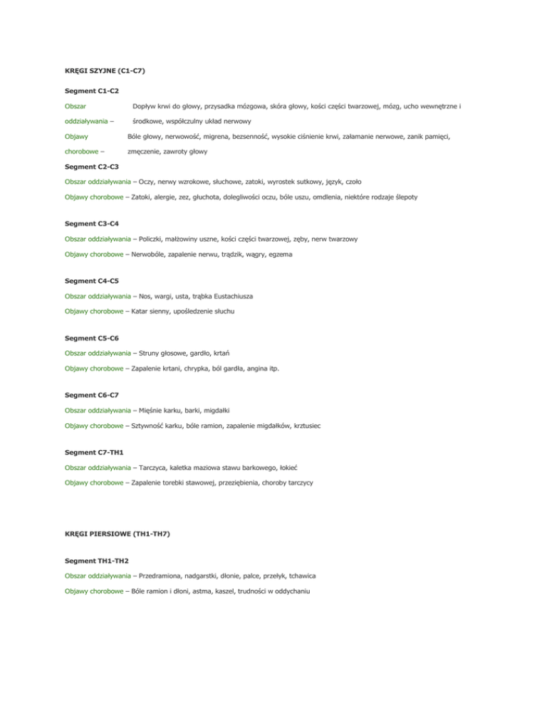 KRĘGI SZYJNE (C1-C7) Segment C1-C2 Obszar Dopływ krwi do głowy, przysadka mózgowa, skóra głowy, kości części twarzowej, mózg, ucho wewnętrzne i oddziaływania – środkowe, współczulny układ nerwowy Objawy Bóle głowy, nerwowość, migrena, bezsenność, wysokie ciśnienie krwi, załamanie nerwowe, zanik pamięci, chorobowe – zmęczenie, zawroty głowy Segment C2-C3 Obszar oddziaływania – Oczy, nerwy wzrokowe, słuchowe, zatoki, wyrostek sutkowy, język, czoło Objawy chorobowe – Zatoki, alergie, zez, głuchota, dolegliwości oczu, bóle uszu, omdlenia, niektóre rodzaje ślepoty Segment C3-C4 Obszar oddziaływania – Policzki, małżowiny uszne, kości części twarzowej, zęby, nerw twarzowy Objawy chorobowe – Nerwobóle, zapalenie nerwu, trądzik, wągry, egzema Segment C4-C5 Obszar oddziaływania – Nos, wargi, usta, trąbka Eustachiusza Objawy chorobowe – Katar sienny, upośledzenie słuchu Segment C5-C6 Obszar oddziaływania – Struny głosowe, gardło, krtań Objawy chorobowe – Zapalenie krtani, chrypka, ból gardła, angina itp. Segment C6-C7 Obszar oddziaływania – Mięśnie karku, barki, migdałki Objawy chorobowe – Sztywność karku, bóle ramion, zapalenie migdałków, krztusiec Segment C7-TH1 Obszar oddziaływania – Tarczyca, kaletka maziowa stawu barkowego, łokieć Objawy chorobowe – Zapalenie torebki stawowej, przeziębienia, choroby tarczycy KRĘGI PIERSIOWE (TH1-TH7) Segment TH1-TH2 Obszar oddziaływania – Przedramiona, nadgarstki, dłonie, palce, przełyk, tchawica Objawy chorobowe – Bóle ramion i dłoni, astma, kaszel, trudności w oddychaniu Segment TH2-TH3 Obszar oddziaływania – Serce – zastawki, osierdzie, naczynia wieńcowe Objawy chorobowe – Zaburzenia czynności serca, dolegliwości piersi Segment TH3-TH4 Obszar oddziaływania – Płuca, oskrzela, opłucna, klatka piersiowa, piersi Objawy chorobowe – Zapalenie oskrzeli, zapalenie opłucnej, zapalenie płuc Segment TH4-TH5 Obszar oddziaływania – Pęcherzyk żółciowy, drogi żółciowe Objawy chorobowe – Dolegliwości pęcherzyka żółciowego, żółtaczka Segment TH5-TH6 Obszar oddziaływania – Wątroba, splot słoneczny, krew Objawy chorobowe – Dolegliwości wątroby, gorączka, niskie ciśnienie krwi, anemia, zaburzenia układu krążenia Segment TH6-TH7 Obszar oddziaływania – Żołądek Objawy chorobowe – Dolegliwości żołądka, zaburzenia trawienia, zgaga Segment TH7-TH8 Obszar oddziaływania – Trzustka, dwunastnica Objawy chorobowe – Wrzody, nieżyt żołądka, osłabienie systemu odpornościowego Segment TH8-TH9 Obszar oddziaływania – Śledziona Objawy chorobowe – Wrzody, nieżyt żołądka, osłabienie systemu odpornościowego Segment TH9-TH10 Obszar oddziaływania – Nadnercza Objawy chorobowe – Alergie, pokrzywka Segment TH10-TH11 Obszar oddziaływania – Nerki Objawy chorobowe – Dolegliwości nerek, zwapnienie tętnic, chroniczne zmęczenie, zapalenie miedniczek nerkowych Segment TH11-TH12 Obszar oddziaływania – Nerki, moczowody Objawy chorobowe – Schorzenia skórne jak trądzik, wągry, egzema, czyraki Segment TH12-L1 Obszar oddziaływania – Jelito grube, pachwiny Objawy chorobowe – Zaparcie, zapalenie jelita grubego, biegunka, rozwolnienie, niektóre rodzaje przepukliny KRĘGI LĘDŹWIOWE (L1-L5) Segment L1-L2 Obszar oddziaływania – Wyrostek robaczkowy, brzuch, uda Objawy chorobowe – Skurcze, kłopoty z oddychaniem, nadkwasota, żylaki Segment L2-L3 Obszar oddziaływania – Narządy płciowe, macica, pęcherz, kolano Objawy Dolegliwości pęcherza moczowego, miesiączkowania - np. bolesne lub nieregularne miesiączki, poronienia, moczenie chorobowe – nocne, impotencja, dolegliwości klimakterium, dolegliwości kolan Segment L3-L4 Obszar oddziaływania – Prostata, mięśnie dolnej części pleców, ischias Objawy chorobowe – Ischias, postrzał, trudne i bolesne oddawanie moczu, bóle pleców Segment L4-L5 Obszar oddziaływania – Stawy skokowe, stopy, podudzia Objawy chorobowe – Złe ukrwienie podudzi, spuchnięte kostki, słabe stawy skokowe, podbicie, zimne stopy, słabe nogi, kurcze łydek Segment L5-S1 Obszar oddziaływania – Pęcherz moczowy, odbyt, narządy płciowe Objawy chorobowe – Zaburzenia erekcji, zaburzenia wydzielania, częstomocz, brak czucia w narządach płciowych
