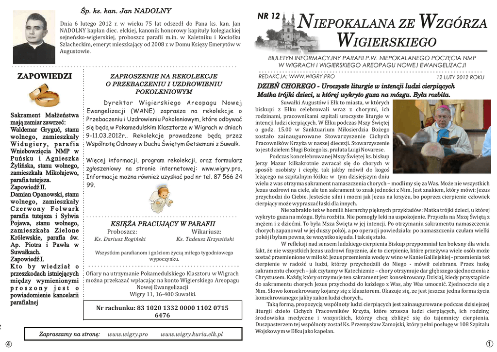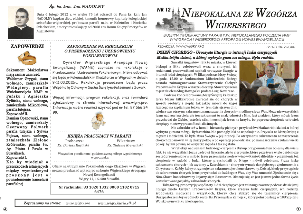 Śp. ks. kan. Jan NADOLNY NR 12 Dnia 6 lutego 2012 r. w wieku 75 lat odszedł do Pana ks. kan. Jan NADOLNY kapłan diec. ełckiej, kanonik honorowy kapituły kolegiackiej sejneńsko-wigierskiej, proboszcz parafii m.in. w Kaletniku i Kociołku Szlacheckim, emeryt mieszkający od 2008 r. w Domu Księzy Emerytów w Augustowie. NIEPOKALANA ZE WZGÓRZA WIGIERSKIEGO BIULETYN INFORMACYJNY PARAFII P.W. NIEPOKALANEGO POCZĘCIA NMP W WIGRACH I WIGIERSKIEGO AREOPAGU NOWEJ EWANGELIZACJI ZAPOWIEDZI Sakrament Małżeństwa mają zamiar zawrzeć: Waldemar Gryguć, stanu wolnego, zamieszkały W i d u g i e r y, p a r a f i a Wniebowzięcia NMP w Puńsku i Agnieszka Żylińska, stanu wolnego, zamieszkała Mikołajewo, parafia tutejsza. Zapowiedź II. Damian Opanowski, stanu wolnego, zamieszkały Czerwony Folwark parafia tutejsza i Sylwia Pojawa, stanu wolnego, zamieszkała Zielone Królewskie, parafia św. Ap. Piotra i Pawła w Suwałkach. Zapowiedź I. Kto by wiedział o przeszkodach istniejących między wymienionymi proszony jest o powiadomienie kancelarii parafialnej ZAPROSZENIE NA REKOLEKCJE O PRZEBACZENIU I UZDROWIENIU POKOLENIOWYM Dyrektor Wigierskiego Areopagu Nowej Ewangelizacji (WANE) zaprasza na rekolekcje o Przebaczeniu i Uzdrowieniu Pokoleniowym, które odbywać się będą w Pokamedulskim Klasztorze w Wigrach w dniach 9-11.03.2012r.. Rekolekcje prowadzone będą przez Wspólnotę Odnowy w Duchu Świętym Getsemani z Suwałk. Więcej informacji, program rekolekcji, oraz formularz zgłoszeniowy na stronie internetowej: www.wigry.pro, Informacje można również uzyskać pod nr tel. 87 566 24 99. KSIĘŻA PRACUJĄCY W PARAFII Wikariusz: Proboszcz: Ks. Dariusz Rogiński Ks. Tadeusz Krzywiński Wszystkim parafianom i gościom życzą miłego tygodniowego wypoczynku. Ofiary na utrzymanie Pokamedulskiego Klasztoru w Wigrach można przekazać wpłacając na konto Wigierskiego Areopagu Nowej Ewangelizacji Wigry 11, 16-400 Suwałki. Nr rachunku: 83 1020 1332 0000 1102 0715 6476 E Zapraszamy na stronę: 4 www.wigry.pro www.wigry.kuria.elk.pl REDAKCJA: WWW.WIGRY.PRO 12 LUTY 2012 ROKU DZIEŃ CHOREGO - Uroczyste liturgie w intencji ludzi cierpiących Matka trójki dzieci, u której wykryto guza na mózgu. Była rozbita. Suwałki Augustów i Ełk to miasta, w których biskupi z Ełku celebrowali wraz z chorymi, ich rodzinami, pracownikami szpitali uroczyste liturgie w intencji ludzi cierpiących. W Ełku podczas Mszy Świętej o godz. 15.00 w Sanktuarium Miłosierdzia Bożego zostało zainaugurowane Stowarzyszenie Cichych Pracowników Krzyża w naszej diecezji. Stowarzyszenie to jest dziełem Sługi Bożego ks. prałata Luigi Novarese. Podczas koncelebrowanej Mszy Świętej ks. biskup Jerzy Mazur kilkakrotnie zwracał się do chorych w sposób osobisty i ciepły, tak jakby mówił do kogoś leżącego na szpitalnym łóżku: w tym dzisiejszym dniu wielu z was otrzyma sakrament namaszczenia chorych – modlimy się za Was. Może nie wszystkich Jezus uzdrowi na ciele, ale ten sakrament to znak jedności z Nim. Jest znakiem, który mówi: Jezus przychodzi do Ciebie. Jesteście silni i mocni jak Jezus na krzyżu, bo poprzez cierpienie człowiek cierpiący może wypraszać łaski dla innych. Nie zabrakło też w homilii hierarchy pięknych przykładów: Matka trójki dzieci, u której wykryto guza na mózgu. Była rozbita. Nie pomogły leki na uspokojenie. Przyszła na Mszę Świętą z mężem i z dziećmi. To była Msza Święta w jej intencji. Po otrzymaniu sakramentu namaszczenia chorych zapanował w jej duszy pokój, a po operacji powiedziała: po namaszczeniu czułam wielki pokój i byłam pewna, że wszystko się uda. I tak się stało. W refleksji nad sensem ludzkiego cierpienia Biskup przypomniał ten bolesny dla wielu fakt, że nie wszystkich Jezus uzdrowi fizycznie, ale to cierpienie, które przeżywa wiele osób może zostać przemienione w miłość. Jezus przemienia wodę w wino w Kanie Galilejskiej - przemienia też cierpienie w radość u ludzi, którzy przychodzili do Niego - mówił celebrans. Przez łaskę sakramentu chorych – jak czytamy w Katechizmie – chory otrzymuje dar głębszego zjednoczenia z Chrystusem. Każdy, który otrzymuje ten sakrament jest konsekrowany. Dzisiaj, kiedy przystąpicie do sakramentu chorych Jezus przychodzi do każdego z Was, aby Was umocnić. Zjednoczcie się z Nim. Słowo konsekrowany kojarzy się z klasztorem. Okazuje się, ze jest jeszcze jedna forma życia konsekrowanego: jakby zakon ludzi chorych.. Taką formą, propozycją wspólnoty ludzi cierpiących jest zainaugurowane podczas dzisiejszej liturgii dzieło Cichych Pracowników Krzyża, które zrzesza ludzi cierpiących, ich rodziny, środowiska medyczne i wszystkich, którzy chcą zbliżyć się do tajemnicy cierpienia. Duszpasterzem tej wspólnoty został Ks. Przemysław Zamojski, który pełni posługę w 108 Szpitalu Wojskowym w Ełku jako kapelan. 1 KALENDARIUM LITURGICZNE 12.02. – Niedziela. VI Niedziela Zwykła. 14.02. – Wtorek. Święto św. Cyryla Mnicha i Metodego Biskupa Patronów Europy. 19.02. – Niedziela. VII Niedziela Zwykła. OGŁOSZENIA PARAFIALNE 1. W dniu dzisiejszym ofiary składane na tacę są przeznaczone na potrzeby Wyższego Seminarium Duchownego w Ełku. Za składane ofiary składamy Bóg Zapłać. 2. W sobotę 18 lutego zapraszamy na spotkanie formacyjne Parafialną Radę Duszpasterską i Parafialną Radę Ekonomiczną. Spotkanie odbędzie się o godz. 11:00 w Dużej Galerii Domu Królewskiego. ŚWIĘCI TYGODNIA ŚWIĘTY CYRYL I METODY (14.02.) - Cyryl urodził się w Tesalonikach w 826 r. jako siódme dziecko w rodzinie Leona, który był wyższym oficerem miejscowego garnizonu. Jego właściwe imię to Konstanty, imię Cyryl przyjął pod koniec życia, wstępując do zakonu. Po studiach w Konstantynopolu został bibliotekarzem przy kościele Hagia Sophia. Później odsunął się na ubocze. Jednak odnaleziony, podjął w szkole cesarskiej wykłady z filozofii. Wkró