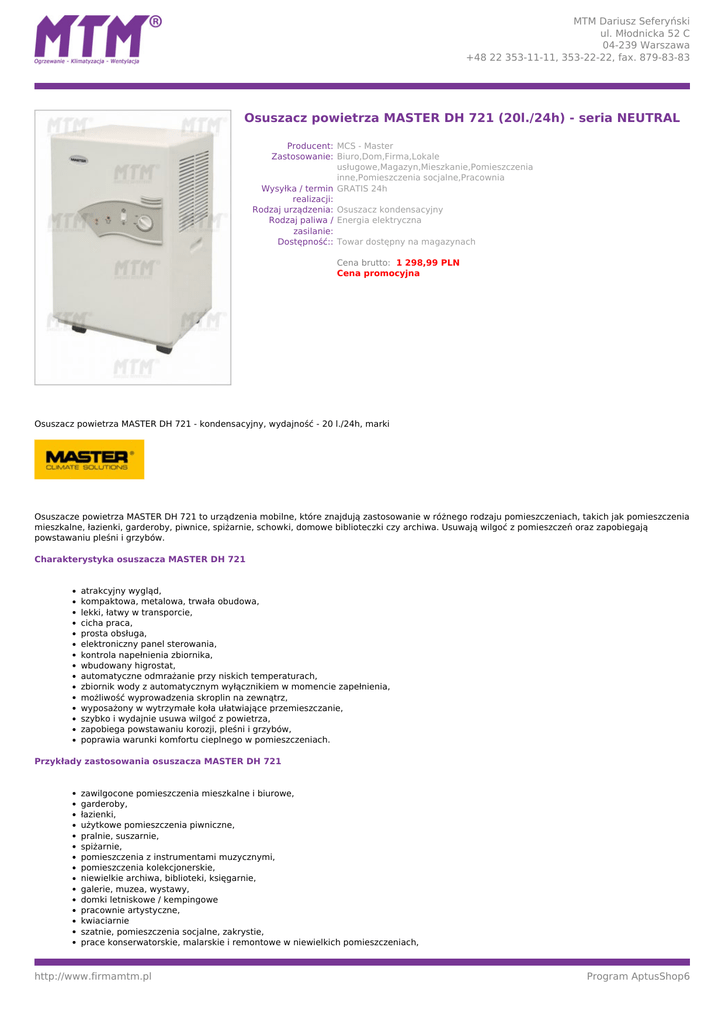 MTM Dariusz Seferyński ul. Młodnicka 52 C 04-239 Warszawa +48 22 353-11-11, 353-22-22, fax. 879-83-83 Osuszacz powietrza MASTER DH 721 (20l./24h) - seria NEUTRAL Producent: MCS - Master Zastosowanie: Biuro,Dom,Firma,Lokale usługowe,Magazyn,Mieszkanie,Pomieszczenia inne,Pomieszczenia socjalne,Pracownia Wysyłka / termin GRATIS 24h realizacji: Rodzaj urządzenia: Osuszacz kondensacyjny Rodzaj paliwa / Energia elektryczna zasilanie: Dostępność:: Towar dostępny na magazynach Cena brutto: 1 298,99 PLN Cena promocyjna Osuszacz powietrza MASTER DH 721 - kondensacyjny, wydajność - 20 l./24h, marki Osuszacze powietrza MASTER DH 721 to urządzenia mobilne, które znajdują zastosowanie w różnego rodzaju pomieszczeniach, takich jak pomieszczenia mieszkalne, łazienki, garderoby, piwnice, spiżarnie, schowki, domowe biblioteczki czy archiwa. Usuwają wilgoć z pomieszczeń oraz zapobiegają powstawaniu pleśni i grzybów. Charakterystyka osuszacza MASTER DH 721 atrakcyjny wygląd, kompaktowa, metalowa, trwała obudowa, lekki, łatwy w transporcie, cicha praca, prosta obsługa, elektroniczny panel sterowania, kontrola napełnienia zbiornika, wbudowany higrostat, automatyczne odmrażanie przy niskich temperaturach, zbiornik wody z automatycznym wyłącznikiem w momencie zapełnienia, możliwość wyprowadzenia skroplin na zewnątrz, wyposażony w wytrzymałe koła ułatwiające przemieszczanie, szybko i wydajnie usuwa wilgoć z powietrza, zapobiega powstawaniu korozji, pleśni i grzybów, poprawia warunki komfortu cieplnego w pomieszczeniach. Przykłady zastosowania osuszacza MASTER DH 721 zawilgocone pomieszczenia mieszkalne i biurowe, garderoby, łazienki, użytkowe pomieszczenia piwniczne, pralnie, suszarnie, spiżarnie, pomieszczenia z instrumentami muzycznymi, pomieszczenia kolekcjonerskie, niewielkie archiwa, biblioteki, księgarnie, galerie, muzea, wystawy, domki letniskowe / kempingowe pracownie artystyczne, kwiaciarnie szatnie, pomieszczenia socjalne, zakrystie, prace konserwatorskie, malarskie i remontowe w niewielkich pomieszczeniach, http://www.firmamtm.pl Program AptusShop6 MTM Dariusz Seferyński ul. Młodnicka 52 C 04-239 Warszawa +48 22 353-11-11, 353-22-22, fax. 879-83-83 do osuszania niewielkich pomieszczeń po powodziach i zalaniach w budynkach, mieszkaniach, piwnicach, suterenach itp. Opis działania: Metoda ta polega na odbieraniu wilgoci z powietrza przez schładzanie go poniżej punktu rosy, co powoduje wykraplanie wilgoci (kondensację). Do osuszania kondensacyjnego służą kondensacyjne osuszacze powietrza. Ich głównymi elementami są wentylator, sprężarka, wymienniki ciepła (skraplacz i parownik) oraz element rozprężny. Temperatura wypływającego z osuszacza powietrza jest wyższa o 3-8 stopnie od temperatury powietrza zassanego. Taki wzrost temperatury powoduje szybsze odparowanie wody np. z mokrych ścian. Wraz z wydłużeniem czasu pracy urządzenia w zamkniętym pomieszczeniu, ilość wody zawartej w powietrzu zostaje skutecznie zmniejszona. Wydajność osuszaczy kondensacyjnych uzależniona jest od warunków pracy (temperatury i wilgotności) oraz od rodzaju urządzenia (wielkości). Jest ona największa przy wyższych wartościach temperatury i wilgotności względnej. Osuszanie kondensacyjne jest zdecydowanie bardziej efektywne i ekonomiczne od osuszania przez ogrzewanie i wentylację, przede wszystkim dzięki wyeliminowaniu wymiany powietrza zawartego wewnątrz pomieszczenia. Dla podniesienia wydajności osuszania stosować z nagrzewnicami MASTER Kupując w naszej firmie kupujesz u Rekomendowanego Sprzedawcy Internetowego Master. Jesteśmy również Autoryzowanym Serwisem marki Master. http://www.firmamtm.pl Program AptusShop6 MTM Dariusz Seferyński ul. Młodnicka 52 C 04-239 Warszawa +48 22 353-11-11, 353-22-22, fax. 879-83-83 Dane techniczne Wydajność (30°C / 80% RH) Do pomieszczeń o kubaturze Przepływ powietrza Zakres pracy - temperatura Zakres pracy - wilgotność Czynnik chłodniczy Zużycie energii Zasilanie Poziom hałasu Kompresor Pojemność zbiornika wody Wymiary (dł. x szer. x wys.) Waga netto Rodzaj osuszacza Rodzaj obudowy Uchwyt Możliwość ciągłej pracy http://www.firmamtm.pl Powered by TCPDF (www.tcpdf.org) 20 l./24h 80 m3 240 m3/h 5 - 35 °C 35-90 % R134A 490 W 220-240 V / 50-60 Hz 42 dB tłokowy 4,7 l. 380 x 350 x 640 mm 19,5 kg kondensacyjny metalowa w obudowie tak Program AptusShop6