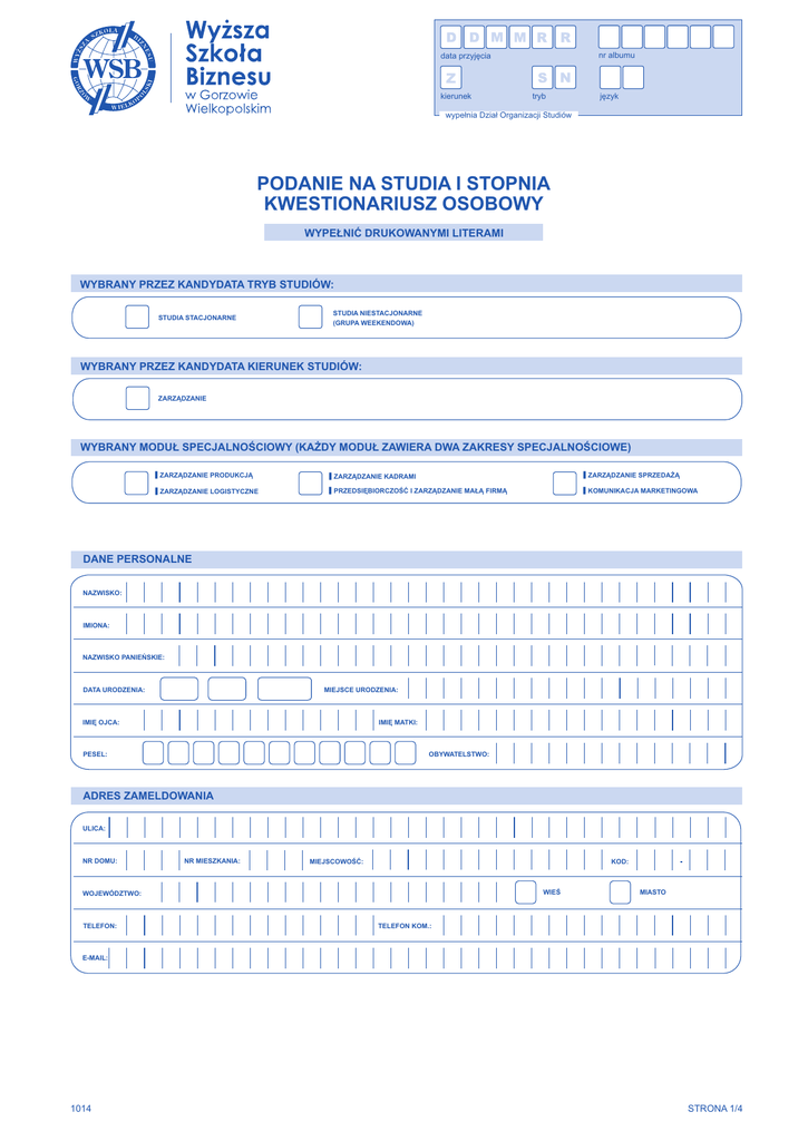 nr albumu data przyjęcia G kierunek tryb język wypełnia Dział Organizacji Studiów PODANIE NA STUDIA I STOPNIA KWESTIONARIUSZ OSOBOWY WYPEŁNIĆ DRUKOWANYMI LITERAMI WYBRANY PRZEZ KANDYDATA TRYB STUDIÓW: STUDIA STACJONARNE STUDIA NIESTACJONARNE (GRUPA WEEKENDOWA) WYBRANY PRZEZ KANDYDATA KIERUNEK STUDIÓW: ZARZĄDZANIE WYBRANY MODUŁ SPECJALNOŚCIOWY (KAŻDY MODUŁ ZAWIERA DWA ZAKRESY SPECJALNOŚCIOWE) ▌ZARZĄDZANIE PRODUKCJĄ ▌ZARZĄDZANIE KADRAMI ▌ZARZĄDZANIE SPRZEDAŻĄ ▌ZARZĄDZANIE LOGISTYCZNE ▌PRZEDSIĘBIORCZOŚĆ I ZARZĄDZANIE MAŁĄ FIRMĄ ▌KOMUNIKACJA MARKETINGOWA DANE PERSONALNE NAZWISKO: IMIONA: NAZWISKO PANIEŃSKIE: DATA URODZENIA: MIEJSCE URODZENIA: IMIĘ MATKI: IMIĘ OJCA: PESEL: OBYWATELSTWO: ADRES ZAMELDOWANIA ULICA: NR DOMU: NR MIESZKANIA: KOD: MIEJSCOWOŚĆ: WIEŚ WOJEWÓDZTWO: TELEFON: MIASTO TELEFON KOM.: E-MAIL: 1014 STRONA 1/4 ADRES DO KORESPONDENCJI (jeżeli inny niż zameldowania) ULICA: NR DOMU: NR MIESZKANIA: KOD: MIEJSCOWOŚĆ: WOJEWÓDZTWO: DOKUMENT TOŻSAMOŚCI SERIA I NUMER DOWODU OSOBISTEGO: NR PESEL: DOWÓD WYDANY PRZEZ: DATA WYDANIA: MIEJSCE WYDANIA: SŁUŻBA WOJSKOWA (nie dotyczy kobiet): STOSUNEK DO SŁUŻBY WOJSKOWEJ: UREGULOWANY: NIEUREGULOWANY: SERIA I NR KSIĄŻECZKI WOJSKOWEJ: ADRES WKU: AKTUALNE MIEJSCE ZATRUDNIENIA (dla pracujących) NAZWA ZAKŁADU PRACY: NR: ULICA: KOD: MIEJSCOWOŚĆ: WOJEWÓDZTWO: TELEFON SŁUŻBOWY: E-MAIL SŁUŻBOWY: ZAJMOWANE STANOWISKO: UKOŃCZONA SZKOŁA ŚREDNIA NAZWA SZKOŁY: ROK UKOŃCZENIA: MIEJSCE UKOŃCZENIA SZKOŁY: RODZAJ MATURY: STARA MATURA: NOWA MATURA: DATA WYDANIA ŚWIADECTWA MATURALNEGO: NR ŚWIADECTWA MATURALNEGO: ORGAN WYDAJĄCY ŚWIADECTWO MATURALNE: MIEJSCE WYDANIA ŚWIADECTWA MATURALNEGO: MATURA Z JĘZYKA OBCEGO MATURA PISEMNA Z JĘZYKA OBCEGO: BRAK PISEMNEJ MATURY Z JĘZYKA OCENA Z JĘZYKA OBCEGO NA STAREJ MATURZE: ANGIELSKI NIEMIECKI PISEMNA USTNA PISEMNA: PODSTAWOWA ROZSZERZONA USTNA: PODSTAWOWA ROZSZERZONA ROSYJSKI INNA, JAKA: PROCENT Z JĘZYKA OBCEGO NA NOWEJ MATURZE: 1014 STRONA 2/4 WYBRANY PRZEZ KANDYDATA JĘZYK OBCY ORAZ STOPIEŃ JEGO ZNAJOMOŚCI JĘZYK ROSYJSKI JĘZYK ANGIELSKI WYBRANY JĘZYK DO STUDIOWANIA: STOPIEŃ ZNAJOMOŚCI WYBRANEGO JĘZYKA: JĘZYK NIEMIECKI PODSTAWOWY ZEROWY (POD WARUNKIEM ZEBRANIA 15-OSOBOWEJ GRUPY CHĘTNYCH) ZAAWANSOWANY ŚREDNI STOPIEŃ ZNAJOMOŚCI OBSŁUGI KOMPUTERA (W TYM WORD’A I EXCEL’A) SŁABY DOBRY NIEPEŁNOSPRAWNOŚĆ (jeżeli dotyczy) ORZECZONA NIEPEŁNOSPRAWNOŚĆ: STOPIEŃ NIEPEŁNOSPRAWNOŚCI: NIESŁYSZĄCY LUB SŁABOSŁYSZĄCY NIEWIDOMY LUB SŁABOWIDZĄCY DYSFUNKCJA RUCHU - NIECHODZĄCY INNY RODZAJ NIEPEŁNOSPRAWNOŚCI LEKKI ZNACZNY UMIARKOWANY DYSFUNKCJA RUCHU - CHODZĄCY PODSTAWOWE ŹRÓDŁO UTRZYMANIA NA UTRZYMANIU RODZICÓW/OPIEKUNÓW PRACA ZAROBKOWA WŁASNA DZIAŁALNOŚĆ GOSPODARCZA INNE OŚWIADCZENIA 1. POWYŻSZE DANE PODAŁEM(AM) ZGODNIE ZE STANEM FAKTYCZNYM. 2. JESTEM ŚWIADOMY(A), IŻ STUDIA W WYŻSZEJ SZKOLE BIZNESU SĄ ODPŁATNE. 3. ZAPOZNAŁEM/ŁAM SIĘ Z REGULAMINEM STUDIÓW WYŻSZEJ SZKOŁY BIZNESU I REGULAMINEM PŁATNOŚCI WSB. 4. JESTEM ŚWIADOMY/A, IŻ NA STUDIACH W WYŻSZEJ SZKOLE BIZNESU , OBOWIĄZUJE JEDEN JĘZYK OBCY. 5. WYRAŻAM ZGODĘ NA PRZETWARZANIE MOICH DANYCH OSOBOWYCH DLA POTRZEB WSB W GORZOWIE WLKP. (ZGODNIE Z USTAWĄ Z DNIA 29.08.97 O OCHRONIE DANYCH OSOBOWYCH DZ. U. 2002R. NR 101 POZ. 926). 6. WSZELKIE ZMIANY DANYCH ZAWARTYCH W KWESTIONARIUSZU NIEZWŁOCZNIE ZGŁOSZĘ W DZIALE ORGANIZACJI STUDIÓW. PODPIS KANDYDATA ZGODNIE Z ART. 10 UST. Z DNIA 18 LIPCA 2002 ROKU O ŚWIADCZENIU USŁUG DROGĄ ELEKTRONICZNĄ (DZ. U. NR 144 Pozycja. 1204 Z PÓŹNIEJSZYMI ZMIANAMI) WYRAŻAM ZGODĘ NA OTRZYMYWANIE INFORMACJI, W TYM INFORMACJI HANDLOWYCH DROGĄ ELEKTRONICZNĄ. PODPIS KANDYDATA 1. KSEROKOPIĘ ŚWIADECTWA DOJRZAŁOŚCI (ORYGINAŁ DO WGLĄDU) NR__________________________________ Z DNIA________________________ 1. 2. 4 KOLOROWE FOTOGRAFIE O WYMIARZE 35x45 W STROJU WIZYTOWYM, BEZ NAKRYCIA GŁOWY, 2. 3. KSEROKOPIĘ DOWODU OSOBISTEGO, 3. 4. KSEROKOPIĘ KSIĄŻECZKI WOJSKOWEJ - MĘŻCZYŹNI (STR.1,2,3,6 i 7), 4. 5. 3 KOPERTY C6 (MAŁE) ZE ZNACZKAMI I ADRESEM ZWROTNYM KANDYDATA, 5. 6. POTWIERDZENIE WNIESIENIA OPŁATY REKRUTACYJNEJ. 6. potwierdza DOS DO PODANIA ZAŁĄCZAM: PODPIS PRZYJMUJĄCEGO PODPIS KANDYDATA ODEBRAŁEM/AM: (WYPEŁNIĆ PRZY ODBIORZE DOKUMENTÓW Z WSB) 1. ŚWIADECTWO DOJRZAŁOŚCI (ORYGINAŁ/ODPIS) NR_________________________________________ Z DNIA__________________________ 2...................................................................................................................................................................................... 3. ...................................................................................................................................................................................... 4....................................................................................................................................................................................... 5....................................................................................................................................................................................... DATA 1014 CZYTELNY PODPIS STRONA 3/4 OŚWIADCZENIE DO UBEZPIECZENIA DANE PERSONALNE NAZWISKO: IMIONA: NAZWISKO PANIEŃSKIE: IMIĘ MATKI: IMIĘ OJCA: DATA URODZENIA: MIEJSCE URODZENIA: PESEL: NIP: ADRES ULICA: NR DOMU: NR MIESZKANIA: MIEJSCOWOŚĆ: WOJEWÓDZTWO: KOD: OŚWIADCZENIE OŚWIADCZAM, ŻE: 1.POZOSTAJĘ NA WYŁĄCZNYM UTRZYMANIU OSOBY PODLEGAJĄCEJ UBEZPIECZENIU, KTÓRA ZGŁOSIŁA MNIE DO UBEZPIECZENIA* 2.PODLEGAM OBOWIĄZKOWI UBEZPIECZENIA ZDROWOTNEGO Z INNEGO TYTUŁU I NIE PODLEGAM OBOWIĄZKOWEMU UBEZPIECZENIU ZA POŚREDNICTWEM UCZELNI* 3.W ZWIĄZKU Z UKOŃCZENIEM 26 ROKU ŻYCIA PROSZĘ O ZGŁOSZENIE DO UBEZPIECZENIAI ODPROWADZENIE SKŁADKI NA UBEZPIECZENIE ZDROWOTNE* * ZAZNACZYĆ WYBRANE W PRZYPADKU ZMIANY DANYCH ZAWARTYCH W DRUKACH ZGŁOSZENIOWYCH PRZEKAŻĘWYPEŁNIONE DRUKI ZMIENIAJĄCE ZGŁOSZEN