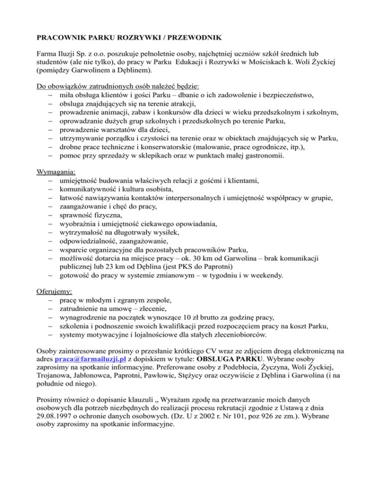 PRACOWNIK PARKU ROZRYWKI / PRZEWODNIK Farma Iluzji Sp. z o.o. poszukuje pełnoletnie osoby, najchętniej uczniów szkół średnich lub studentów (ale nie tylko), do pracy w Parku Edukacji i Rozrywki w Mościskach k. Woli Życkiej (pomiędzy Garwolinem a Dęblinem). Do obowiązków zatrudnionych osób należeć będzie: miła obsługa klientów i gości Parku – dbanie o ich zadowolenie i bezpieczeństwo, obsluga znajdujących się na terenie atrakcji, prowadzenie animacji, zabaw i konkursów dla dzieci w wieku przedszkolnym i szkolnym, oprowadzanie dużych grup szkolnych i przedszkolnych po terenie Parku, prowadzenie warsztatów dla dzieci, utrzymywanie porządku i czystości na terenie oraz w obiektach znajdujących się w Parku, drobne prace techniczne i konserwatorskie (malowanie, prace ogrodnicze, itp.), pomoc przy sprzedaży w sklepikach oraz w punktach małej gastronomii. Wymagania: umiejętność budowania właściwych relacji z gośćmi i klientami, komunikatywność i kultura osobista, łatwość nawiązywania kontaktów interpersonalnych i umiejętność współpracy w grupie, zaangażowanie i chęć do pracy, sprawność fizyczna, wyobraźnia i umiejętność ciekawego opowiadania, wytrzymałość na długotrwały wysiłek, odpowiedzialność, zaangażowanie, wsparcie organizacyjne dla pozostałych pracowników Parku, możliwość dotarcia na miejsce pracy – ok. 30 km od Garwolina – brak komunikacji publicznej lub 23 km od Dęblina (jest PKS do Paprotni) gotowość do pracy w systemie zmianowym – w tygodniu i w weekendy. Oferujemy: pracę w młodym i zgranym zespole, zatrudnienie na umowę – zlecenie, wynagrodzenie na początek wynoszące 10 zł brutto za godzinę pracy, szkolenia i podnoszenie swoich kwalifikacji przed rozpoczęciem pracy na koszt Parku, systemy motywacyjne i lojalnościowe dla stałych zleceniobiorców. Osoby zainteresowane prosimy o przesłanie krótkiego CV wraz ze zdjęciem drogą elektroniczną na adres [email protected] z dopiskiem w tytule: OBSLUGA PARKU. Wybrane osoby zaprosimy na spotkanie informacyjne. Preferowane osoby z Podebłocia, Życzyna, Woli Życkiej, Trojanowa, Jabłonowca, Paprotni, Pawłowic, Stężycy oraz oczywiście z Dęblina i Garwolina (i na południe od niego). Prosimy również o dopisanie klauzuli „ Wyrażam zgodę na przetwarzanie moich danych osobowych dla potrzeb niezbędnych do realizacji procesu rekrutacji zgodnie z Ustawą z dnia 29.08.1997 o ochronie danych osobowych. (Dz. U z 2002 r. Nr 101, poz 926 ze zm.). Wybrane osoby zaprosimy na spotkanie informacyjne.