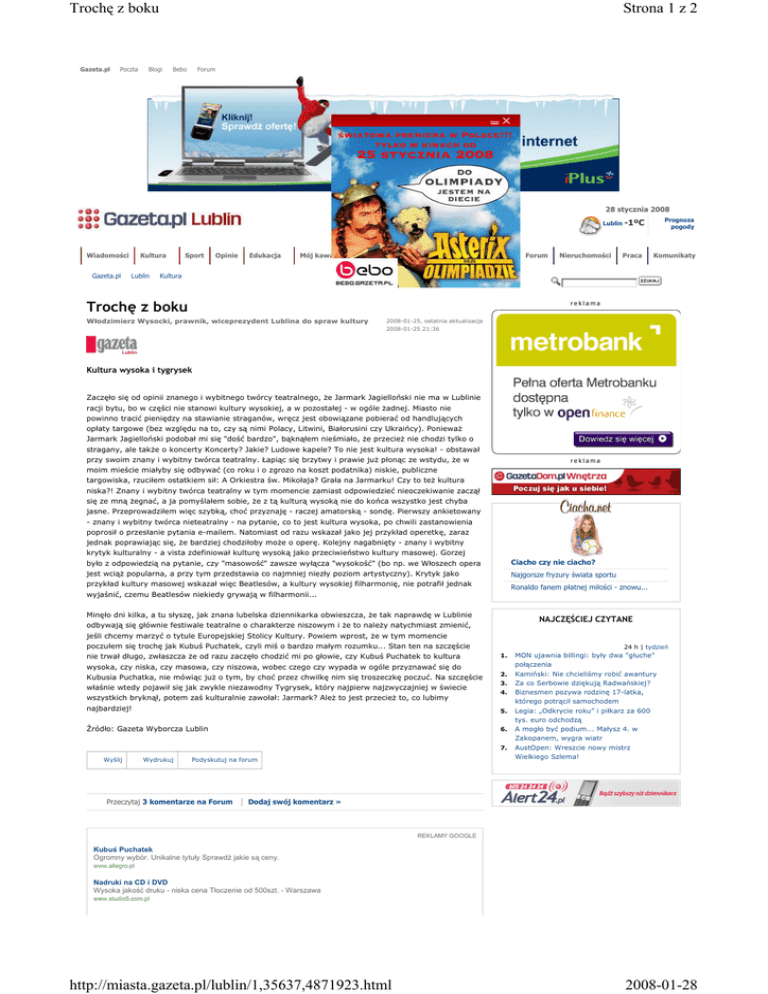 Trochę z boku Gazeta.pl Poczta Strona 1 z 2 Blogi Bebo Forum 28 stycznia 2008 Lublin Wiadomości Gazeta.pl Kultura Lublin Sport Opinie Edukacja Mój kawałek Europy Kultura A Przystanek Lublin Turystyka Forum Nieruchomości Prognoza pogody -1ºC Praca Komunikaty AA reklama Trochę z boku Włodzimierz Wysocki, prawnik, wiceprezydent Lublina do spraw kultury 2008-01-25, ostatnia aktualizacja 2008-01-25 21:36 Kultura wysoka i tygrysek Zaczęło się od opinii znanego i wybitnego twórcy teatralnego, że Jarmark Jagielloński nie ma w Lublinie racji bytu, bo w części nie stanowi kultury wysokiej, a w pozostałej - w ogóle żadnej. Miasto nie powinno tracić pieniędzy na stawianie straganów, wręcz jest obowiązane pobierać od handlujących opłaty targowe (bez względu na to, czy są nimi Polacy, Litwini, Białorusini czy Ukraińcy). Ponieważ Jarmark Jagielloński podobał mi się "dość bardzo", bąknąłem nieśmiało, że przecież nie chodzi tylko o stragany, ale także o koncerty Koncerty? Jakie? Ludowe kapele? To nie jest kultura wysoka! - obstawał przy swoim znany i wybitny twórca teatralny. Łapiąc się brzytwy i prawie już płonąc ze wstydu, że w reklama moim mieście miałyby się odbywać (co roku i o zgrozo na koszt podatnika) niskie, publiczne targowiska, rzuciłem ostatkiem sił: A Orkiestra św. Mikołaja? Grała na Jarmarku! Czy to też kultura niska?! Znany i wybitny twórca teatralny w tym momencie zamiast odpowiedzieć nieoczekiwanie zaczął się ze mną żegnać, a ja pomyślałem sobie, że z tą kulturą wysoką nie do końca wszystko jest chyba jasne. Przeprowadziłem więc szybką, choć przyznaję - raczej amatorską - sondę. Pierwszy ankietowany - znany i wybitny twórca nieteatralny - na pytanie, co to jest kultura wysoka, po chwili zastanowienia poprosił o przesłanie pytania e-mailem. Natomiast od razu wskazał jako jej przykład operetkę, zaraz jednak poprawiając się, że bardziej chodziłoby może o operę. Kolejny nagabnięty - znany i wybitny krytyk kulturalny - a vista zdefiniował kulturę wysoką jako przeciwieństwo kultury masowej. Gorzej było z odpowiedzią na pytanie, czy "masowość" zawsze wyłącza "wysokość" (bo np. we Włoszech opera Ciacho czy nie ciacho? jest wciąż popularna, a przy tym przedstawia co najmniej niezły poziom artystyczny). Krytyk jako Najgorsze fryzury świata sportu przykład kultury masowej wskazał więc Beatlesów, a kultury wysokiej filharmonię, nie potrafił jednak Ronaldo fanem płatnej miłości - znowu... wyjaśnić, czemu Beatlesów niekiedy grywają w filharmonii... Minęło dni kilka, a tu słyszę, jak znana lubelska dziennikarka obwieszcza, że tak naprawdę w Lublinie NAJCZĘŚCIEJ CZYTANE odbywają się głównie festiwale teatralne o charakterze niszowym i że to należy natychmiast zmienić, jeśli chcemy marzyć o tytule Europejskiej Stolicy Kultury. Powiem wprost, że w tym momencie poczułem się trochę jak Kubuś Puchatek, czyli miś o bardzo małym rozumku... Stan ten na szczęście nie trwał długo, zwłaszcza że od razu zaczęło chodzić mi po głowie, czy Kubuś Puchatek to kultura 24 h | tydzień 1. wysoka, czy niska, czy masowa, czy niszowa, wobec czego czy wypada w ogóle przyznawać się do Kubusia Puchatka, nie mówiąc już o tym, by choć przez chwilkę nim się troszeczkę poczuć. Na szczęście właśnie wtedy pojawił się jak zwykle niezawodny Tygrysek, który najpierw najzwyczajniej w świecie wszystkich bryknął, potem zaś kulturalnie zawołał: Jarmark? Ależ to jest przecież to, co lubimy 2. 3. 4. najbardziej! 5. Źródło: Gazeta Wyborcza Lublin 6. 7. Wyślij Wydrukuj Podyskutuj na forum Przeczytaj 3 komentarze na Forum MON ujawnia billingi: były dwa "głuche" połączenia Kamiński: Nie chcieliśmy robić awantury Za co Serbowie dziękują Radwańskiej? Biznesmen pozywa rodzinę 17-latka, którego potrącił samochodem Legia: „Odkrycie roku” i piłkarz za 600 tys. euro odchodzą A mogło być podium... Małysz 4. w Zakopanem, wygra wiatr AustOpen: Wreszcie nowy mistrz Wielkiego Szlema! Dodaj swój komentarz » REKLAMY GOOGLE Kubuś Puchatek Ogromny wybór. Unikalne tytuły Sprawdź jakie są ceny. www.allegro.pl Nadruki na CD i DVD Wysoka jakość druku - niska cena Tłoczenie od 500szt. - Warszawa www.studio5.com.pl http://miasta.gazeta.pl/lublin/1,35637,4871923.html 2008-01-28 Trochę z boku Strona 2 z 2 Toalety Przenośne Na budowy, imprezy, parkingi itp. Bardzo niskie ceny i wysoka jakość! www.clipper.com.pl Copyright © Agora SA • O nas • Staże w Gazeta.pl • Reklama • Prywatność • Wszystkie artykuły Poleć stronę | Zgłoś problem Praca Oferty pracy List motywacyjny CV http://miasta.gazeta.pl/lublin/1,35637,4871923.html Praca za granicą 2008-01-28