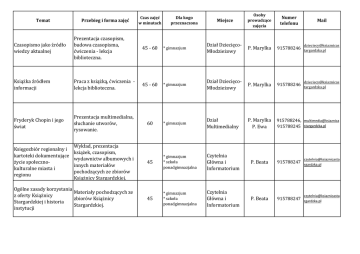 Temat Przebieg i forma zajęć Czas zajęć w minutach Dla kogo przeznaczona Miejsce Osoby prowadzące zajęcia Numer telefonu Mail Czasopismo jako źródło wiedzy aktualnej Prezentacja czasopism, budowa czasopisma, ćwiczenia - lekcja biblioteczna. 45 - 60 * gimnazjum Dział DziecięcoMłodzieżowy P. Marylka 915788246 targardzka.pl Książka źródłem informacji Praca z książką, ćwiczenia lekcja biblioteczna. 45 - 60 * gimnazjum Dział DziecięcoMłodzieżowy P. Marylka 915788246 targardzka.pl Fryderyk Chopin i jego świat Prezentacja multimedialna, słuchanie utworów, rysowanie. 60 * gimnazjum Dział Multimedialny P. Marylka P. Ewa 915788246, multimedia@ksiaznica 915788245 stargardzka.pl Księgozbiór regionalny i kartoteki dokumentujące życie społecznokulturalne miasta i regionu Wykład, prezentacja książek, czasopism, wydawnictw albumowych i innych materiałów pochodzących ze zbiorów Książnicy Stargardzkiej. 45 * gimnazjum * szkoła ponadgimnazjalna Czytelnia Główna i Informatorium P. Beata 915788247 rgardzka.pl 45 * gimnazjum * szkoła ponadgimnazjalna Czytelnia Główna i Informatorium P. Beata 915788247 rgardzka.pl Ogólne zasady korzystania Materiały pochodzących ze z oferty Książnicy zbiorów Książnicy Stargardzkiej i historia Stargardzkiej. instytucji dzieciecy@ksiaznicas dzieciecy@ksiaznicas czytelnia@ksiaznicasta czytelnia@ksiaznicasta 45 * gimnazjum * szkoła ponadgimnazjalna Czytelnia Główna i Informatorium P. Beata 915788247 rgardzka.pl Historia teatru Prezentacja multimedialna, warsztaty teatralne. 90 * gimnazjum * szkoła ponadgimnazjalna Dział Multimedialny; Sala Teatralna P. Beata 915788247 rgardzka.pl Co nam jesień niesie? Prezentacja multimedialna, piosenki, zabawy ruchowe. 45-60 * przedszkole * szkoła podstawowa (kl. 0-2) Dział Multimedialny P. Ewa 915788245 stargardzka.pl Moje zdrówko Prezentacja multimedialna, piosenki, zabawy ruchowe. 45-60 * przedszkole * szkoła podstawowa (kl. 0-2) Dział Multimedialny P. Ewa 915788245 stargardzka.pl Przyszła wiosna. Wstawać Prezentacja multimedialna, śpiochy! piosenki, zabawy ruchowe. 45-60 * przedszkole * szkoła podstawowa (kl. 0-2) Dział Multimedialny P. Ewa 915788245 stargardzka.pl 60 * przedszkole * szkoła podstawowa (kl. 0-2) Dział Multimedialny P. Marylka P. Ewa Zasady posługiwania się Wykład i ćwiczenia. katalogami bibliotecznymi Fryderyk Chopin oczami dzieci Prezentacja multimedialna, słuchanie utworów, malowanie. czytelnia@ksiaznicasta czytelnia@ksiaznicasta multimedia@ksiaznica multimedia@ksiaznica multimedia@ksiaznica 915788246, multimedia@ksiaznica 915788245 stargardzka.pl Śladami Świętego Mikołaja Prezentacja multimedialna, piosenki, zabawy ruchowe. 45-60 * przedszkole * szkoła podstawowa (kl. 0-2) Dział Multimedialny P. Marylka P. Ewa 45 - 60 * przedszkole * szkoła podstawowa * gimnazjum Dział Multimedialny P. Ania P. Ewa 915788245 stargardzka.pl 60 * przedszkole * szkoła podstawowa * gimnazjum Filia Książnicy Stargardzkiej ul. Pogodna 16 U/2 P. Basia 915772154 zka.pl 915788246, multimedia@ksiaznica 915788245 stargardzka.pl Prezentacja multimedialna, zapoznanie dzieci i Biblioteka - wrota innego młodzieży ze zbiorami świata biblioteki oraz z zasadami korzystania – wycieczka.. multimedia@ksiaznica Poznajemy bibliotekę Zapoznanie dzieci i młodzieży z zasadami obowiązującymi w bibliotece. Projekcje filmowe Projekcje filmów będących w zależności ekranizacją lektur szkolnych, * przedszkole od czasu * szkoła podstawowa filmów edukacyjnych, filmów z trwania tzw. klasyki filmowej oraz danego filmu * gimnazjum bajek dla dzieci. Dział Multimedialny P. Ewa 915788245 stargardzka.pl Poznajemy bibliotekę Zapoznanie dzieci i młodzieży ze zbiorami biblioteki oraz z zasadami obowiązującymi w wypożyczalni i czytelni – wycieczka. Dział DziecięcoMłodzieżowy P. Marylka 915788246 targardzka.pl Książka moim przyjacielem Prezentacja literatury czytanej przez studentów i bibliotekarza. Filia Książnicy Stargardzkiej ul. Pogodna 16 U/1 P. Basia 45 - 60 45 * przedszkole * szkoła podstawowa * gimnazjum * przedszkole filia@ksiaznicastargard multimedia@ksiaznica dzieciecy@ksiaznicas filia@ksiaznicastargard 915772154 zka.pl Kolorowe książeczki, kolorowe bajeczki… Spotkanie z książką - lekcja biblioteczna. 45 - 60 * przedszkole Dział DziecięcoMłodzieżowy P. Kasia 915788246 targardzka.pl Poeci dziecięcej radości Np. Jan Brzechwa, Julian Tuwim, Wanda Chotomska lekcja tematyczna, warsztatowa. 45 - 60 * szkoła podstawowa (kl. 1-3) Dział DziecięcoMłodzieżowy P. Marylka 915788246 targardzka.pl W krainie uśmiechniętej książki Spotkanie z książką zagadki, zabawy, czytanie fragmentów książek, zajęcia plastyczne - lekcja biblioteczna. 45 - 60 * szkoła podstawowa (kl. 1-3) Dział DziecięcoMłodzieżowy P. Marylka 915788246 targardzka.pl Podróż do Książkolandii Wprowadzenie uczniów do biblioteki - lekcja biblioteczna. 45 - 60 * szkoła podstawowa (kl. 0-1) Dział DziecięcoMłodzieżowy P. Kasia 915788246 targardzka.pl Latający kufer Czytamy baśnie H. Ch. Andersena. 45 - 60 * szkoła podstawowa (kl. 3-4) Dział DziecięcoMłodzieżowy P. Marylka 915788246 targardzka.pl Czasopismo jako źródło wiedzy aktualnej Prezentacja czasopism, budowa czasopisma, ćwiczenia - lekcja biblioteczna. 45 - 60 * szkoła podstawowa (kl. 5-6) Dział DziecięcoMłodzieżowy P. Marylka 915788246 targardzka.pl dzieciecy@ksiaznicas dzieciecy@ksiaznicas dzieciecy@ksiaznicas dzieciecy@ksiaznicas dzieciecy@ksiaznicas dzieciecy@ksiaznicas 1. Świąteczna gwiazda życzeń 2. Kraszanki, pisanki, gliniane koguciki … Spotkanie z polską tradycją i kulturą Świąt Bożego Narodzenia i Świąt Wielkanocnych - lekcje okolicznościowe. Historia teatru (od Marca 2014r.) Warsztaty teatralne w Sali Teatralnej. 45 - 60 * szkoła podstawowa (kl. 1-6) Dział DziecięcoMłodzieżowy P. Marylka 915788246 targardzka.pl 60 * szkoła podstawowa (kl. 2-6) * gimnazjum 