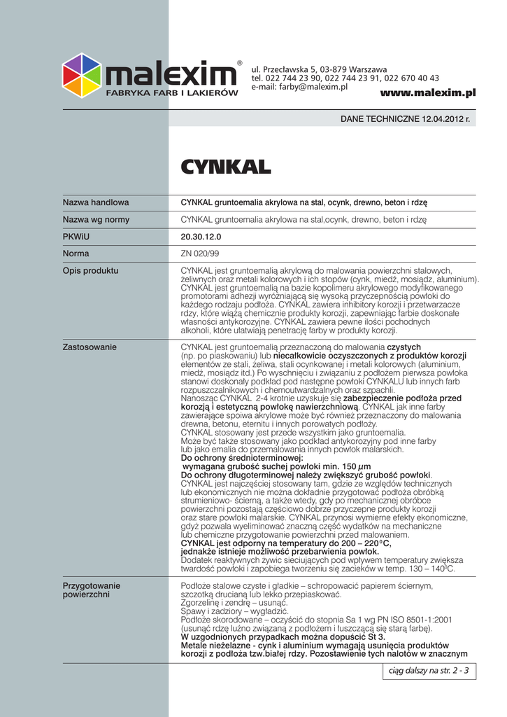 malexim ® FABRYKA FARB I LAKIERÓW ul. Przecławska 5, 03-879 Warszawa tel. 022 744 23 90, 022 744 23 91, 022 670 40 43 e-mail: [email protected] www.malexim.pl DANE TECHNICZNE 12.04.2012 r. CYNKAL Nazwa handlowa CYNKAL gruntoemalia akrylowa na stal, ocynk, drewno, beton i rdzę Nazwa wg normy CYNKAL gruntoemalia akrylowa na stal,ocynk, drewno, beton i rdzę PKWiU 20.30.12.0 Norma ZN 020/99 Opis produktu CYNKAL jest gruntoemalią akrylową do malowania powierzchni stalowych, żeliwnych oraz metali kolorowych i ich stopów (cynk, miedź, mosiądz, aluminium). CYNKAL jest gruntoemalią na bazie kopolimeru akrylowego modyfikowanego promotorami adhezji wyróżniającą się wysoką przyczepnością powłoki do każdego rodzaju podłoża. CYNKAL zawiera inhibitory korozji i przetwarzacze rdzy, które wiążą chemicznie produkty korozji, zapewniając farbie doskonałe własności antykorozyjne. CYNKAL zawiera pewne ilości pochodnych alkoholi, które ułatwiają penetrację farby w produkty korozji. Zastosowanie CYNKAL jest gruntoemalią przeznaczoną do malowania czystych (np. po piaskowaniu) lub niecałkowicie oczyszczonych z produktów korozji elementów ze stali, żeliwa, stali ocynkowanej i metali kolorowych (aluminium, miedź, mosiądz itd.) Po wyschnięciu i związaniu z podłożem pierwsza powłoka stanowi doskonały podkład pod następne powłoki CYNKALU lub innych farb rozpuszczalnikowych i chemoutwardzalnych oraz szpachli. Nanosząc CYNKAL 2-4 krotnie uzyskuje się zabezpieczenie podłoża przed korozją i estetyczną powłokę nawierzchniową. CYNKAL jak inne farby zawierające spoiwa akrylowe może być również przeznaczony do malowania drewna, betonu, eternitu i innych porowatych podłoży. CYNKAL stosowany jest przede wszystkim jako gruntoemalia. Może być także stosowany jako podkład antykorozyjny pod inne farby lub jako emalia do przemalowania innych powłok malarskich. Do ochrony średnioterminowej: wymagana grubość . suchej powłoki min. 150 µm Do ochrony długoterminowej należy zwiększyć grubość powłoki. CYNKAL jest najczęściej stosowany tam, gdzie ze względów technicznych lub ekonomicznych nie można dokładnie przygotować podłoża obróbką strumieniowo- ścierną, a także wtedy, gdy po mechanicznej obróbce powierzchni pozostają częściowo dobrze przyczepne produkty korozji oraz stare powłoki malarskie. CYNKAL przynosi wymierne efekty ekonomiczne, gdyż pozwala wyeliminować znaczną część wydatków na mechaniczne lub chemiczne przygotowanie powierzchni przed malowaniem. CYNKAL jest odporny na temperatury do 200 – 220 0 C, jednakże istnieje możliwość przebarwienia powłok. Dodatek reaktywnych żywic sieciujących pod wpływem temperatury zwiększa twardość powłoki i zapobiega tworzeniu się zacieków w temp. 130 – 1400C. Przygotowanie powierzchni Podłoże stalowe czyste i gładkie – schropowacić papierem ściernym, szczotką drucianą lub lekko przepiaskować. Zgorzelinę i zendrę – usunąć. Spawy i zadziory – wygładzić. Podłoże skorodowane – oczyścić do stopnia Sa 1 wg PN ISO 8501-1:2001 (usunąć rdzę luźno związaną z podłożem i łuszczącą się starą farbę). W uzgodnionych przypadkach można dopuścić St 3. Metale nieżelazne - cynk i aluminium wymagają usunięcia produktów korozji z podłoża tzw.białej rdzy. Pozostawienie tych nalotów w znacznym ciąg dalszy na str. 2 - 3 malexim ® FABRYKA FARB I LAKIERÓW CYNKAL str. 2 Przygotowanie powierzchni stopniu obniża przyczepność powłok malarskich i powoduje ich odspajanie nawet po krótkim czasie eksploatacji. Produkty korozji można usunąć ręcznymi lub mechanicznymi szczotkami stalowymi lub poprzez delikatną obróbkę strumieniowo - ścierną tzw. omiatanie luźnym ścierniwem. Stare powłoki malarskie – starannie sprawdzić przyczepność starych powłok do podłoża zgodnie z PN EN ISO 2409, wykonując tzw. siatkę nacięć. Słabo przylegające powłoki usunąć, pozostałe zmyć roztworem EKOSOLWENTU i schropowacić (piaskowanie, szczotka druciana itp.). Przeprowadzić miejscowo próbne wymalowania w celu sprawdzenia czy nie nastąpi odspojenie całego systemu od podłoża. Każde podłoże przed malowaniem odtłuścić wodnym roztworem preparatu EKOSOLWENT prod. MALEXIM i dokładnie spłukać wodą. Sposób użycia CYNKAL można nakładać na suche i czyste podłoże za pomocą pędzla, wałka, pistoletu lub przez zanurzenie. Przygotowanie farby Farbę wymieszać przed użyciem. Do malowania pędzlem rozcieńczać w ilości do 10% rozcieńczalnikiem MALSOLWENT nr 1 prod. MALEXIM. Do malowania przez zanurzenie lub natryskiem należy stosować rozcieńczalnik MALSOLWENT nr 2 (w ilości 20-30%). Lepkości robocze: malowanie pędzlem - lepkość handlowa natrysk pneumatyczny - 20 – 40 s malowanie przez zanurzenie - 25 – 35 s Najkorzystniej jest malować w temperaturach 20 – 300C. Następne wymalowania Krótki czas schnięcia farby zapewnia możliwość 2-krotnego malowania w ciągu jednego dnia, np. dużej konstrukcji nośnej, dachu, ogrodzenia. Następne powłoki CYNKALU lub innych farb można nakładać w dowolnych odstępach czasu, po wyschnięciu poprzedniej powłoki CYNKALU. Jeżeli wykonawca zamierza nanosić na CYNKAL farby tzw. chemoodporne lub inne zawierające dużo agresywnych rozpuszczalników jak ksylen, toluen lub nitro należy wydłużyć czas schnięcia i przeprowadzić próbne wymalowanie, żeby uniknąć odspajania powłok od podłoża. Właściwości CYNKAL wiąże się z rdzą oraz podłożem metalicznym fizycznie i chemicznie.Posiada wysoką trwałość barwy i odporność na podwyższone temperatury. Tworzy powłoki charakteryzujące się bardzo dobrymi właściwościami mechanicznymi i świetną przyczepnością do podłoża. Kolor Gama kolorów oraz RAL, NCS lub według uzgodnień. Opakowania 0,2; 0,3; 0,7; 2,5; 10 litrów malexim ® FABRYKA FARB I LAKIERÓW CYNKAL str. 3 Wydajność Zawartość części sta