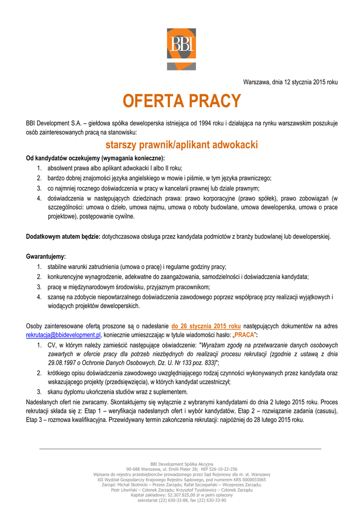 Warszawa, dnia 12 stycznia 2015 roku OFERTA PRACY BBI Development S.A. – giełdowa spółka deweloperska istniejąca od 1994 roku i działająca na rynku warszawskim poszukuje osób zainteresowanych pracą na stanowisku: starszy prawnik/aplikant adwokacki Od kandydatów oczekujemy (wymagania konieczne): 1. absolwent prawa albo aplikant adwokacki I albo II roku; 2. bardzo dobrej znajomości języka angielskiego w mowie i piśmie, w tym języka prawniczego; 3. co najmniej rocznego doświadczenia w pracy w kancelarii prawnej lub dziale prawnym; 4. doświadczenia w następujących dziedzinach prawa: prawo korporacyjne (prawo spółek), prawo zobowiązań (w szczególności: umowa o dzieło, umowa najmu, umowa o roboty budowlane, umowa deweloperska, umowa o prace projektowe), postępowanie cywilne. Dodatkowym atutem będzie: dotychczasowa obsługa przez kandydata podmiotów z branży budowlanej lub deweloperskiej. Gwarantujemy: 1. stabilne warunki zatrudnienia (umowa o pracę) i regularne godziny pracy; 2. konkurencyjne wynagrodzenie, adekwatne do zaangażowania, samodzielności i doświadczenia kandydata; 3. pracę w międzynarodowym środowisku, przyjaznym pracownikom; 4. szansę na zdobycie niepowtarzalnego doświadczenia zawodowego poprzez współpracę przy realizacji wyjątkowych i wiodących projektów deweloperskich. Osoby zainteresowane ofertą proszone są o nadesłanie do 26 stycznia 2015 roku następujących dokumentów na adres [email protected], koniecznie umieszczając w tytule wiadomości hasło: „PRACA”: 1. CV, w którym należy zamieścić następujące oświadczenie: "Wyrażam zgodę na przetwarzanie danych osobowych zawartych w ofercie pracy dla potrzeb niezbędnych do realizacji procesu rekrutacji (zgodnie z ustawą z dnia 29.08.1997 o Ochronie Danych Osobowych, Dz. U. Nr 133 poz. 833)"; 2. krótkiego opisu doświadczenia zawodowego uwzględniającego rodzaj czynności wykonywanych przez kandydata oraz wskazującego projekty (przedsięwzięcia), w których kandydat uczestniczył; 3. skanu dyplomu ukończenia studiów wraz z suplementem. Nadesłanych ofert nie zwracamy. Skontaktujemy się wyłącznie z wybranymi kandydatami do dnia 2 lutego 2015 roku. Proces rekrutacji składa się z: Etap 1 – weryfikacja nadesłanych ofert i wybór kandydatów, Etap 2 – rozwiązanie zadania (casusu), Etap 3 – rozmowa kwalifikacyjna. Przewidywany termin zakończenia rekrutacji: najpóźniej do 28 lutego 2015 roku. BBI Development Spółka Akcyjna 00-688 Warszawa, ul. Emilii Plater 28; NIP 526-10-22-256 Wpisana do rejestru przedsiębiorców prowadzonego przez Sąd Rejonowy dla m. st. Warszawy XII Wydział Gospodarczy Krajowego Rejestru Sądowego, pod numerem KRS 0000033065 Zarząd: Michał Skotnicki – Prezes Zarządu; Rafał Szczepański – Wiceprezes Zarządu; Piotr Litwiński – Członek Zarządu; Krzysztof Tyszkiewicz – Członek Zarządu Kapitał zakładowy: 52.307.825,00 zł w pełni opłacony sekretariat (22) 630-33-88, fax (22) 630-33-90