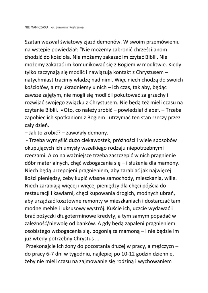 NIE MAM CZASU , ks. Sławomir Kostrzewa Szatan wezwał światowy zjazd demonów. W swoim przemówieniu na wstępie powiedział: “Nie możemy zabronić chrześcijanom chodzić do kościoła. Nie możemy zakazać im czytać Biblii. Nie możemy zakazać im komunikować się z Bogiem w modlitwie. Kiedy tylko zaczynają się modlić i nawiązują kontakt z Chrystusem – natychmiast tracimy władzę nad nimi. Więc niech chodzą do swoich kościołów, a my ukradniemy u nich – ich czas, tak aby, będąc zawsze zajętym, nie mogli się modlić i pokutować za grzechy i rozwijać swojego związku z Chrystusem. Nie będą też mieli czasu na czytanie Biblii. «Oto, co należy zrobić – powiedział diabeł. – Trzeba zapobiec ich spotkaniom z Bogiem i utrzymać ten stan rzeczy przez cały dzień. – Jak to zrobić? – zawołały demony. - Trzeba wymyślić dużo ciekawostek, próżności i wiele sposobów okupujących ich umysły wszelkiego rodzaju niepotrzebnymi rzeczami. A co najważniejsze trzeba zaszczepić w nich pragnienie dóbr materialnych, chęć wzbogacania się – i służenia dla mamony. Niech będą przepojeni pragnieniem, aby zarabiać jak najwięcej ilości pieniędzy, żeby kupić własne samochody, mieszkania, wille. Niech zarabiają więcej i więcej pieniędzy dla chęci pójścia do restauracji i kawiarni, chęci kupowania drogich, modnych ubrań, aby urządzać kosztowne remonty w mieszkaniach i dostarczać tam modne meble i luksusowy wystrój. Kuście ich, uczcie wydawać i brać pożyczki długoterminowe kredyty, a tym samym popadać w zależność/niewolę od banków. A gdy będą zapaleni pragnieniem osobistego wzbogacenia się, pogonią za mamoną – i nie będzie im już wtedy potrzebny Chrystus … Przekonajcie ich żony do pozostania dłużej w pracy, a mężczyzn – do pracy 6-7 dni w tygodniu, najlepiej po 10-12 godzin dziennie, żeby nie mieli czasu na zajmowanie się rodziną i wychowaniem dzieci. Nie pozwólcie im spędzać czasu z dziećmi – po to, by ich dzieci włóczyły się od rana do nocy po ulicy i kolegowały i wpadły w złe towarzystwo, przez to przestały się uczyć, zaniedbały szkołę i aby nic z nich dobrego dzięki temu nie wyrosło. Wtedy ich rodziny rozpadną się, oni staną się samotni, a my pomożemy im z żalu upić się i stać się alkoholikami. Stymulujcie ich umysły tak, żeby dzięki temu telewizory i komputery w domach pracowały stale, a oni jak najwięcej czasu spędzali oglądając telewizję i ślęcząc przed komputerem, a przez to nie mieli czasu na modlitwę. Upewnijcie się, że w każdym sklepie i restauracji na świecie stale brzmiała niechrześcijańska bluźnierczaomamiająca muzyka. To będzie blokować ich umysły i niszczyć ich jedność z Chrystusem i przynależność do Niego Rozłóżcie na stole w kawiarni dużo czasopism i gazet. Bombardujcie ich umysły wiadomościami i reklamami 24 godziny na dobę. Niech po drodze uderza w nich morze oślepiających reklam z billboardów. Napełnijcie im reklamą skrzynki pocztowe, katalogami do zamówienia towarów dostępnych w internecie, biuletynami i ofertami bezpłatnych towarów, usług i innych złudzeń. Pokazujcie im, w czasopismach i telewizji szczupłe, wysportowane piękne modelki, żeby mężczyźni uwierzyli , że zewnętrzne piękno jest najważniejsze, a przez to stali się niezadowoleni ze swoich żon. Zróbcie tak, żeby ich żony były zbyt zmęczone, aby spełniać swoje małżeńskie obowiązki. Jeśli nie spełnią ich żony tego czego oczekują, to zaczną szukać tego gdzie indziej. To doprowadzi szybko do zniszczenia rodzin! Na Boże Narodzenie i Wielkanoc trzeba odwrócić ich uwagę pustotą, dajcie koncerty, filmy w telewizji, aby te święta były spędzone za stołem, z obżarstwem i pijaństwem. Dzięki temu nie nauczą oni dzieci prawdziwej wymowy świąt i ich Bożego znaczenia. Niech wracają z wolnego zmęczeni. Zróbcie to tak, żeby też nie mieli czasu wybrać się na łono natury i cieszyć się Bożym stworzeniem. Zamiast tego kuście ich wyjściem do parków rozrywki, na imprezy sportowe, spektakle, koncerty czy do galerii. Tak żeby ich umysł ciągle był zajęty tą pustotą nie przynoszącą nic dobrego i pożytecznego dla zbawienia. Macie czynić pełną izolację ich od Chrystusa! Niech wszyscy chrześcijanie będą wiecznie zajęci, zajęci, zajęci! Zalejcie ich życie tak wieloma pozornie dobrymi rzeczami, żeby nie mieli czasu na zastanowienie nad poszukiwaniem pomocy u Jezusa, a wkrótce będą żyć i pracować, opierając się tylko na sobie, poświęcając swoje zdrowie i rodziny. To działa! To wspaniały plan! Diabły chętnie poszły do pracy, zmuszając chrześcijan wszędzie by byli bardziej zajęci i pędzili tu i tam, nie pozostawiając czasu dla Boga, na modlitwę i dla rodziny. Czy plan diabła odniósł sukces? Możesz osądzić! Daj ten list innym. A może i TY zbyt jesteś zajęty?