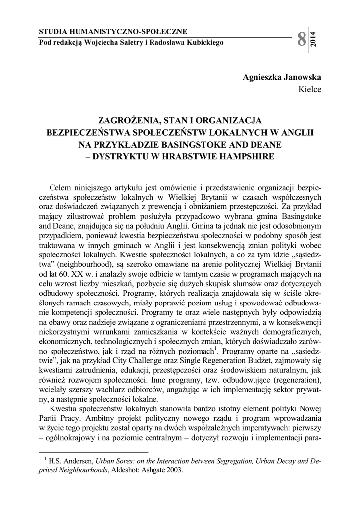 8 2014 STUDIA HUMANISTYCZNO-SPOŁECZNE Pod redakcją Wojciecha Saletry i Radosława Kubickiego Agnieszka Janowska Kielce ZAGROŻENIA, STAN I ORGANIZACJA BEZPIECZEŃSTWA SPOŁECZEŃSTW LOKALNYCH W ANGLII NA PRZYKŁADZIE BASINGSTOKE AND DEANE – DYSTRYKTU W HRABSTWIE HAMPSHIRE Celem niniejszego artykułu jest omówienie i przedstawienie organizacji bezpieczeństwa społeczeństw lokalnych w Wielkiej Brytanii w czasach współczesnych oraz doświadczeń związanych z prewencją i obniżaniem przestępczości. Za przykład mający zilustrować problem posłużyła przypadkowo wybrana gmina Basingstoke and Deane, znajdująca się na południu Anglii. Gmina ta jednak nie jest odosobnionym przypadkiem, ponieważ kwestia bezpieczeństwa społeczności w podobny sposób jest traktowana w innych gminach w Anglii i jest konsekwencją zmian polityki wobec społeczności lokalnych. Kwestie społeczności lokalnych, a co za tym idzie „sąsiedztwa” (neighbourhood), są szeroko omawiane na arenie politycznej Wielkiej Brytanii od lat 60. XX w. i znalazły swoje odbicie w tamtym czasie w programach mających na celu wzrost liczby mieszkań, pozbycie się dużych skupisk slumsów oraz dotyczących odbudowy społeczności. Programy, których realizacja znajdowała się w ściśle określonych ramach czasowych, miały poprawić poziom usług i spowodować odbudowanie kompetencji społeczności. Programy te oraz wiele następnych były odpowiedzią na obawy oraz nadzieje związane z ograniczeniami przestrzennymi, a w konsekwencji niekorzystnymi warunkami zamieszkania w kontekście ważnych demograficznych, ekonomicznych, technologicznych i społecznych zmian, których doświadczało zarówno społeczeństwo, jak i rząd na różnych poziomach1. Programy oparte na „sąsiedztwie”, jak na przykład City Challenge oraz Single Regeneration Budżet, zajmowały się kwestiami zatrudnienia, edukacji, przestępczości oraz środowiskiem naturalnym, jak również rozwojem społeczności. Inne programy, tzw. odbudowujące (regeneration), wcielały szerszy wachlarz odbiorców, angażując w ich implementację sektor prywatny, a następnie społeczności lokalne. Kwestia społeczeństw lokalnych stanowiła bardzo istotny element polityki Nowej Partii Pracy. Ambitny projekt polityczny nowego rządu i program wprowadzania w życie tego projektu został oparty na dwóch współzależnych imperatywach: pierwszy – ogólnokrajowy i na poziomie centralnym – dotyczył rozwoju i implementacji para1 H.S. Andersen, Urban Sores: on the Interaction between Segregation, Urban Decay and Deprived Neighbourhoods, Aldeshot: Ashgate 2003. 98 AGNIESZKA JANOWSKA dygmatu polityki i praktyk służących zmniejszaniu przestępczości. Z kolei drugi – na poziomie lokalnym – koncentrował się na problemie organizowania się społeczności, tworzenia przez nie właściwych dla danego obszaru strategii walki z przestępczością, postawami antyspołecznymi, łamaniem porządku. Rządy Konserwatystów z lat 80. oraz 90. XX w. podejmowały podobne inicjatywy, jednak misja Partii Pracy, mająca na celu modernizację instytucji społecznych, delegowanie władzy, była uderzająca. Głównym celem dokumentu National Strategy for Neighbourhood Renewal (Narodowa Strategia dla Odbudowy Społeczności), który powstał w okresie pierwszej kadencji Partii Pracy, było uchwycenie i określenie niedogodności danego miejsca zamieszkania. Strategia koncentrowała się na próbie zmniejszenia luki między najuboższymi, najbardziej niekorzystnie położonymi okolicami, a resztą kraju2. Główną intencją laburzystów było zachęcanie lokalnych społeczności do podejmowania własnych inicjatyw poprzez zaangażowanie w zarządzanie i rozwijanie poczucia obywatelskości. Wizja społecznej odnowy nakreślana przez parlamentarzystę Davida Blunketta (wówczas ministra spraw wewnętrznych) w jego wystąpieniach w latach 2003 i 2004 szczególnie mocno akcentowała problem poczucia obywatelskości jako istotny przy odbudowie społeczności lokalnych. Aktywni obywatele, tacy, którzy potrafią zdefiniować i reagować na kluczowe problemy, mogą tworzyć bezpieczniejsze i silniejsze społeczności, będące w stanie uzgadniać i wykonywać określone plany rozwiązań3. Opracowany później dokument pt. Together we Can (Razem możemy) nakreślał plan umożliwiający zwykłym mieszkańcom uczestniczenie w podejmowaniu decyzji dotyczących danego miejsca4. Kolejny dokument pt. Local Government Modernisation Agenda (Plan modernizacji społeczności lokalnych) również definiował miejsce zamieszkania jako takie, w którym obywatele muszą zaangażować się w poprawę usług, aby stymulować odbudowę demokracji. W dokumencie Sustainable Communities Agenda (Plan dla trwałych społeczności lokalnych) dostęp do posiadania swojego miejsca zamieszkania czy przyzwoita jakość życia jawią się jako podstawy do tworzenia bezpiecznych społeczności lokalnych5. Na uwagę zasługują inne dokumenty prawne powstałe w okresie rządów laburzystów, regulujące działalność władz lokalnych, dające jeszcze większą swobodę w podejmowaniu decyzji dotyczących potrzeb oraz priorytetów danych społeczności. Ed Balls, Główny Doradca Ekonomiczny Kanclerza Skarbu, Gordona Browna, w Gabinecie Cieni (do 2004 r.), w przedmowie do książki D. Corry’ego i Gerry’ego Stokera New Localism: refashioning the centre-local relationship przedstawił podejście ówczesnego rządu do alternatywnych metod zarządzania, wyjaśniając, że wzmocniona władza lokalna musi być równoważona zwiększoną odpowiedzialno2 SEU (Social Exclusion Unit) A New Commitment to Neighbourhood Renewal: National Strategy Action Plan, London. 3 I. Smith, E. Lepine i M. Taylor, Disadvantaged by where you live?, Bristol 2007. 4 Home Office, Together we Can, Action Plan Parts I and II, London Civil Renewal Unit, Home Office, 2005. 5 V. Lowndes, H. Sullivan, Like a Horse and a Carriage 