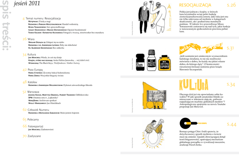 RESOCJALIZACJA Wstępniak: Z kulą u nogi Rozmowa z Pawłem Moczydłowskim: Handel wolnością Misza Tomaszewski: Sen sprawiedliwego Ignacy Dudkiewicz i Maciek Onyszkiewicz: Opuścić bezdomność Tomek Kaczor i Katarzyna Kucharska: Fotograf z twarzą, streetworker bez munduru Ilustracja. Hanka Owsińska 4 Temat numeru: Resocjalizacja s.26 Polska jest jednym z krajów, w których kara kryminalna wciąż pełni funkcję zinstytucjonalizowanej zemsty. Jako taka jest ona nie tylko oderwana od myślenia w kategoriach skuteczności, ale i pozbawiona moralnych podstaw. W tekście Sen sprawiedliwego Misza Tomaszewski zastanawia się nad tym, jakie funkcje w nowoczesnym społeczeństwie powinna pełnić kara. 26 Wiara Wacław Oszajca sj: Załapać się na niebo Rozmowa z ks. Andrzejem Lutrem: Żeby nie sklechcieć Ks. Sławomir Szczepaniak: Bez oddechu s.31 Jan Mencwel: Wiedz, że coś się dzieje Książki, które nas szukają: Anita Halina Janowska, ... mój diabeł stróż Wtomigraj: The Black Keys, Thickfreakness / Rubber Factory 42 Poza Europą Ilustracja: Anna Libera 34 Kultura „Jeśli sumienie jest ostatecznym wyznacznikiem ludzkiego działania, to nie ma możliwości mówienia o dobru, bo każdy ma jakieś własne dobro, do którego dąży”. O konieczności nieustannej formacji sumienia pisze ksiądz Sławomir Szczepaniak. Paweł Cywiński: Żywotny bakcyl kolonializmu Paweł Zerka: Wszystkie bieguny świata 48 Katolew s.34 Rozmowa z Andrzejem Wielowieyskim: Dylemat zatwardziałego liberała Joanna Kusiak, Martyna Obarska, Hubert Trammer: Odblokowisko SPW: Ostatnia seta w „Lajkoniku” Wars/Sawa: Archiwum spotkań Wielcy Warszawscy: Jan Himilsbach 62 Człowiek Numeru Rozmowa z Mateuszem Zabłockim: Może jestem frajerem Ilustracja. Urszula Woźniak 52 Warszawa Dlaczego dziś już nie opowiadamy sobie kawałów? W jaki sposób amatorskie filmiki zamieszczane w internecie stają się „paliwem napędzającym machiny globalnych mediów”? Antropologiczne spojrzenie na serwis Youtube proponuje Jan Mencwel. 65 Polecamy POZA EUROPĄ 66 Fotoreportaż Jan Mencwel: Zadomowieni 70 Zasłyszane Ilustracja: Ewa Smyk spis treści: jesień 2011 Rosnąca potęga Chin i Indii sprawia, że dotychczasowy sposób myślenia o świecie musi się zmienić. Upadek obowiązującej dotąd teorii biegunowości, upatrującej mechanizm globalnego porządku w rywalizacji mocarstw, analizuje Paweł Zerka. s.44