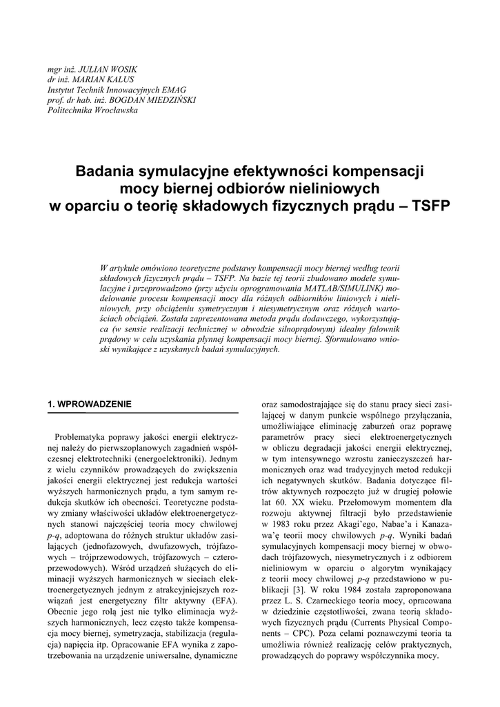 mgr inż. JULIAN WOSIK dr inż. MARIAN KALUS Instytut Technik Innowacyjnych EMAG prof. dr hab. inż. BOGDAN MIEDZIŃSKI Politechnika Wrocławska Badania symulacyjne efektywności kompensacji mocy biernej odbiorów nieliniowych w oparciu o teorię składowych fizycznych prądu – TSFP W artykule omówiono teoretyczne podstawy kompensacji mocy biernej według teorii składowych fizycznych prądu – TSFP. Na bazie tej teorii zbudowano modele symulacyjne i przeprowadzono (przy użyciu oprogramowania MATLAB/SIMULINK) modelowanie procesu kompensacji mocy dla różnych odbiorników liniowych i nieliniowych, przy obciążeniu symetrycznym i niesymetrycznym oraz różnych wartościach obciążeń. Została zaprezentowana metoda prądu dodawczego, wykorzystująca (w sensie realizacji technicznej w obwodzie silnoprądowym) idealny falownik prądowy w celu uzyskania płynnej kompensacji mocy biernej. Sformułowano wnioski wynikające z uzyskanych badań symulacyjnych. 1. WPROWADZENIE Problematyka poprawy jakości energii elektrycznej należy do pierwszoplanowych zagadnień współczesnej elektrotechniki (energoelektroniki). Jednym z wielu czynników prowadzących do zwiększenia jakości energii elektrycznej jest redukcja wartości wyższych harmonicznych prądu, a tym samym redukcja skutków ich obecności. Teoretyczne podstawy zmiany właściwości układów elektroenergetycznych stanowi najczęściej teoria mocy chwilowej p-q, adoptowana do różnych struktur układów zasilających (jednofazowych, dwufazowych, trójfazowych – trójprzewodowych, trójfazowych – czteroprzewodowych). Wśród urządzeń służących do eliminacji wyższych harmonicznych w sieciach elektroenergetycznych jednym z atrakcyjniejszych rozwiązań jest energetyczny filtr aktywny (EFA). Obecnie jego rolą jest nie tylko eliminacja wyższych harmonicznych, lecz często także kompensacja mocy biernej, symetryzacja, stabilizacja (regulacja) napięcia itp. Opracowanie EFA wynika z zapotrzebowania na urządzenie uniwersalne, dynamiczne oraz samodostrajające się do stanu pracy sieci zasilającej w danym punkcie wspólnego przyłączania, umożliwiające eliminację zaburzeń oraz poprawę parametrów pracy sieci elektroenergetycznych w obliczu degradacji jakości energii elektrycznej, w tym intensywnego wzrostu zanieczyszczeń harmonicznych oraz wad tradycyjnych metod redukcji ich negatywnych skutków. Badania dotyczące filtrów aktywnych rozpoczęto już w drugiej połowie lat 60. XX wieku. Przełomowym momentem dla rozwoju aktywnej filtracji było przedstawienie w 1983 roku przez Akagi’ego, Nabae’a i Kanazawa’ę teorii mocy chwilowych p-q. Wyniki badań symulacyjnych kompensacji mocy biernej w obwodach trójfazowych, niesymetrycznych i z odbiorem nieliniowym w oparciu o algorytm wynikający z teorii mocy chwilowej p-q przedstawiono w publikacji [3]. W roku 1984 została zaproponowana przez L. S. Czarneckiego teoria mocy, opracowana w dziedzinie częstotliwości, zwana teorią składowych fizycznych prądu (Currents Physical Components – CPC). Poza celami poznawczymi teoria ta umożliwia również realizację celów praktycznych, prowadzących do poprawy współczynnika mocy. 6 MECHANIZACJA I AUTOMATYZACJA GÓRNICTWA 2. TEORIA MOCY BAZUJĄCA NA TEORII SKŁADOWYCH FIZYCZNYCH PRĄDU – TSFP Zespolona moc pozorna harmonicznej n-tego rzędu S n jest równa: S n U n I n Pn jQn T Autor tej teorii, Leszek S. Czarnecki, biorąc z teorii mocy Fryzego koncepcję prądu czynnego, z teorii Shepherda i Zikikhani’ego koncepcję prądu biernego oraz wprowadzając nową składową nazwaną prądem rozrzutu, zaproponował ortogonalny rozkład prądu źródła zasilającego jednofazowy odbiornik liniowy. Początkowo teoria ta dotyczyła jedynie systemów jednofazowych, jednak rozwijana stopniowo, rozszerzona została na systemy trójfazowe. Jej pełna postać przedstawiona została w 1994 roku w publikacji [1]. Teoria ta znana jest pod nazwą „teoria mocy Czarneckiego” lub „teoria mocy bazująca na teorii składowych fizycznych prądu – TSFP”. Umożliwia ona fizyczną interpretację zjawisk energetycznych, zachodzących w obwodach elektrycznych z niesinusoidalnymi przebiegami napięć i prądów oraz w warunkach asymetrii prądów odbiornika i asymetrii napięć zasilających. jeżeli Pn 0 to n N A , jeżeli Pn 0 to n N B (4) Stąd napięcie u, prąd i oraz moc czynną P rozłożono na następujące składowe: i in U na u a u na u ub u n u nb 2 Re U nb e jn t nN nN nN U nc uc u nc 1 2 Re U n e jn t (1) 1 nN Prądy fazowe przedstawiono, analogicznie jak napięcia, za pomocą wektora kolumnowego i: ia ina I na i ib in inb 2 Re I nb e jn t nN nN ic nN inc I nc 1 2 Re I n e jn t 1 nN (2) (3) gdzie Pn i Qn oznaczają moc czynną i bierną odbiornika dla harmonicznej n-tego rzędu. Jeżeli odbiornik jest pasywny i liniowy, to wówczas moc czynna Pn, przekazywana ze źródła zasilania do odbiornika, nie może być ujemna, tzn. dla każdej harmonicznej n-tego rzędu Pn 0 . Jeżeli którykolwiek z powyższych warunków nie jest spełniony, to prądy wyższych harmonicznych mogą być „generowane” w odbiorniku. Energia związana z tymi harmonicznymi może być przekazywana z odbiornika do źródła zasilania, tzn. Pn 0 . Wobec tego, na podstawie znaku Pn, zbiór wszystkich rzędów harmonicznych N może zostać podzielony na dwa rozłączne podzbiory NA i NB: 2.1. Składowe prądu odbiornika Ogólny schemat rozważanego trójfazowego, trójprzewodowego systemu elektroenergetycznego przedstawiono na rysunku 1. Źródło zasilania ma niezerową impedancję wewnętrzną ZS, zatem te same harmoniczne występują zarówno w napięciach, jak i w prądach. N oznacza zbiór harmonicznych, które występują w napięciu u i prądzie i. Napięcia fazowe wyrażono za pomocą szeregów Fouriera i przedstawiono w formie wektora kolumnowego u: * nN u un nN P i i n n nN A u n nN A n u n nN A (5) n u A uB (6) PA PB (7) nN B P P P nN i A