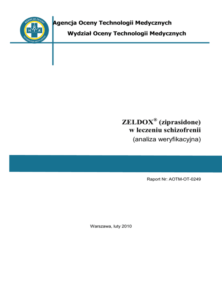 Agencja Oceny Technologii Medycznych Wydział Oceny Technologii Medycznych ZELDOX® (ziprasidone) w leczeniu schizofrenii (analiza weryfikacyjna) Raport Nr: AOTM-OT-0249 Warszawa, luty 2010 ZELDOX® (ziprasidone) w leczeniu schizofrenii AOTM-OT0249 W przygotowaniu analizy weryfikacyjnej wzięli udział ze strony Agencji Oceny Technologii Medycznych: Agata Miszczak, Lidia Becla. W analizie wykorzystano stanowisko uzyskane od: • prof. dr hab. Marka Jaremy, Konsultanta Krajowego w dziedzinie psychiatrii, otrzymane dnia 13.01.2010r. • prof. dr hab. Janusza Rybakowskiego, Przewodniczącego Sekcji Psychofarmakologii PTP, Kierownika Kliniki Psychiatrii Dorosłych UM w Poznaniu, otrzymane dnia 25.01.2010r. • prof. dr hab. Iwony Kłoszewskiej, Kierownika Kliniki Psychiatrii Wieku Podeszłego i Zaburzeń Psychotycznych UM w Łodzi, otrzymane dnia 13.01.2010r. Osoby uczestniczące w pracach nad analizą weryfikacyjną nie zadeklarowały Ŝadnych konfliktów interesów <poza poniŜszymi>: prof. dr hab. Marek Jarema prof. dr hab. Janusz Rybakowski Analiza weryfikacyjna dla Rady Konsultacyjnej AOTM 2/63 ZELDOX® (ziprasidone) w leczeniu schizofrenii AOTM-OT0249 Spis treści 1. Podstawowe informacje o wniosku ............................................................................................................................ 5 2. Problem decyzyjny ..................................................................................................................................................... 8 2.1. Problem zdrowotny ......................................................................................................................................... 8 2.1.1. Zagadnienia rejestracyjne .................................................................................................................... 9 2.1.2. Wskazania zarejestrowane ................................................................................................................. 10 2.1.3. Wskazania, których dotyczy wniosek ................................................................................................ 10 2.1.4. Wskazania, w których stosowanie technologii jest akceptowalne klinicznie [na podstawie stanowiska ekspertów] ....................................................................................................................... 10 2.2. Interwencja wnioskowana ............................................................................................................................. 10 2.3. Komparatory [na podstawie stanowiska ekspertów] ..................................................................................... 11 2.3.1. Interwencje stosowane obecnie w Polsce w zarejestrowanych wskazaniach .................................... 11 2.3.2. Interwencja, która w rzeczywistej praktyce medycznej najprawdopodobniej moŜe zostać zastąpiona przez wnioskowaną interwencję ........................................................................................................ 11 2.3.3. Najtańsza interwencja stosowana w danym wskazaniu w Polsce ...................................................... 11 2.3.4. Najskuteczniejsza interwencja stosowana w danym wskazaniu w Polsce ......................................... 11 2.3.5. Interwencja rekomendowana w wytycznych postępowania klinicznego w danym wskazaniu w Polsce ............................................................................................................................................. 12 2.4. 3. 4. Dotychczasowe postępowanie administracyjne w Polsce z technologią wnioskowaną ................................ 12 Rekomendacje technologii wnioskowanej ................................................................................................................ 16 3.1. Rekomendacje kliniczne ............................................................................................................................... 16 3.2. Rekomendacje dotyczące finansowania ze środków publicznych ................................................................ 21 Finansowanie ze środków publicznych..................................................................................................................... 23 4.1. Aktualny stan finansowania ze środków publicznych w Polsce ................................................................... 23 4.1.1. Technologia wnioskowana ................................................................................................................ 23 4.1.2. Komparatory ...................................................................................................................................... 23 4.2. 5. Stan finansowania technologii wnioskowanej ze środków publicznych w innych krajach .......................... 25 Wnioski z dowodów naukowych .............................................................................................................................. 26 5.1. Analiza efektywności klinicznej ................................................................................................................... 26 5.1.1. Poziom wiarygodności oraz zgodność z wytycznymi AOTM ........................................................... 26 5.2. 5.1.1.1. Efektywność kliniczna .................................................................................................................. 27 5.1.1.2. Bezpieczeństwo ............................................................................................................................ 35 5.1.1.2.1. Informacje z wniosku ................................................................................................................ 35 5.1.1.2.2. Informacje z ChPL ..................................................................................................................... 35 5.1.1.2.3. Informacje z innych źródeł ............................................................................................