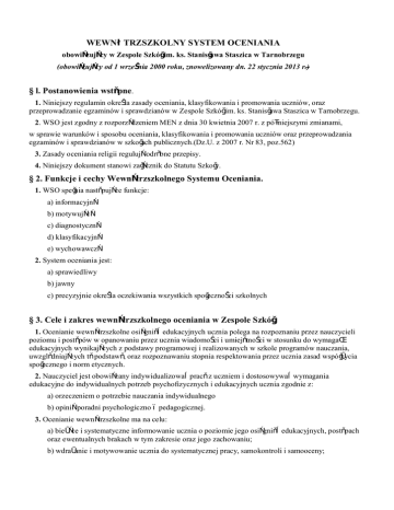 WEWNĄTRZSZKOLNY SYSTEM OCENIANIA obowiązujący w Zespole Szkół im. ks. Stanisława Staszica w Tarnobrzegu (obowiązujący od 1 września 2000 roku, znowelizowany dn. 22 stycznia 2013 r.) § l. Postanowienia wstępne. 1. Niniejszy regulamin określa zasady oceniania, klasyfikowania i promowania uczniów, oraz przeprowadzanie egzaminów i sprawdzianów w Zespole Szkół im. ks. Stanisława Staszica w Tarnobrzegu. 2. WSO jest zgodny z rozporządzeniem MEN z dnia 30 kwietnia 2007 r. z późniejszymi zmianami, w sprawie warunków i sposobu oceniania, klasyfikowania i promowania uczniów oraz przeprowadzania egzaminów i sprawdzianów w szkołach publicznych.(Dz.U. z 2007 r. Nr 83, poz.562) 3. Zasady oceniania religii regulują odrębne przepisy. 4. Niniejszy dokument stanowi załącznik do Statutu Szkoły. § 2. Funkcje i cechy Wewnątrzszkolnego Systemu Oceniania. 1. WSO spełnia następujące funkcje: a) informacyjną b) motywującą c) diagnostyczną d) klasyfikacyjną e) wychowawczą 2. System oceniania jest: a) sprawiedliwy b) jawny c) precyzyjnie określa oczekiwania wszystkich społeczności szkolnych § 3. Cele i zakres wewnątrzszkolnego oceniania w Zespole Szkół. 1. Ocenianie wewnątrzszkolne osiągnięć edukacyjnych ucznia polega na rozpoznaniu przez nauczycieli poziomu i postępów w opanowaniu przez ucznia wiadomości i umiejętności w stosunku do wymagań edukacyjnych wynikających z podstawy programowej i realizowanych w szkole programów nauczania, uwzględniających tę podstawę, oraz rozpoznawaniu stopnia respektowania przez ucznia zasad współżycia społecznego i norm etycznych. 2. Nauczyciel jest obowiązany indywidualizować pracę z uczniem i dostosowywać wymagania edukacyjne do indywidualnych potrzeb psychofizycznych i edukacyjnych ucznia zgodnie z: a) orzeczeniem o potrzebie nauczania indywidualnego b) opinią poradni psychologiczno – pedagogicznej. 3. Ocenianie wewnątrzszkolne ma na celu: a) bieżące i systematyczne informowanie ucznia o poziomie jego osiągnięć edukacyjnych, postępach oraz ewentualnych brakach w tym zakresie oraz jego zachowaniu; b) wdrażanie i motywowanie ucznia do systematycznej pracy, samokontroli i samooceny; c) pomoc uczniowi w samodzielnym planowaniu własnego rozwoju umysłowego, uzdolnień i zainteresowań; d) dostarczanie rodzicom (prawnym opiekunom) i nauczycielom informacji o postępach, trudnościach i specjalnych uzdolnieniach ucznia; e) doskonalenie oraz korygowanie organizacji i metod pracy dydaktyczno-wychowawczej nauczycieli. 4. Ocenianie wewnątrzszkolne obejmuje: formułowanie przez nauczycieli wymagań edukacyjnych oraz informowanie o nich uczniów i rodziców (prawnych opiekunów); ustalenie kryteriów oceniania zachowania; c) ustalenie skali i sposobów formułowania ocen bieżących, śródrocznych i końcoworocznych i końcowych w cyklu kształcenia z obowiązkowych i dodatkowych zajęć edukacyjnych oraz ocen z zachowania; d) zasady przeprowadzania egzaminów klasyfikacyjnych, sprawdzających, poprawkowych oraz egzaminów zaliczających praktyki zawodowe. 5. Sposób informowania ucznia i rodziców o WSO i wymaganiach edukacyjnych szkoły: a) szczegółowe zasady oceniania określone zostały przez nauczycieli w PSO stanowiących załączniki do niniejszego regulaminu, b) nauczyciele na początku roku szkolnego formułują wymagania edukacyjne oraz stosowane przez siebie w roku szkolnym zasady oceniania i przedstawiają je młodzieży (nie później niż na 3 jednostce lekcyjnej) oraz rodzicom (opiekunom prawnym, c) fakt zapoznania uczniów z wymaganiami edukacyjnymi oraz stosowanymi zasadami oceniania, nauczyciel odnotowuje w dzienniku lekcyjnym na dole strony z ocenami swojego przedmiotu, d) wszyscy rodzice oraz uczniowie mogą zapoznać się ze szkolnym systemem oceniania oraz stosowanymi wymaganiami edukacyjnymi i regulaminem oceniania i zachowaniu, bibliotece szkolnej, w pokoju nauczycielskim i na stronie internetowej szkoły. § 4. Organizacja roku szkolnego. 1. Rok szkolny dzieli się na 2 semestry i przebiega zgodnie z rozporządzeniem MEN dotyczącym organizacji roku szkolnego – decyzje o zakończeniu pierwszego semestru podejmuje Rada Pedagogiczna na sierpniowej konferencji w zależności od terminu ferii zimowych. Każdy semestr kończy się klasyfikacją. Ocenę końcoworoczną ustala się na podstawie ocen z obydwu semestrów. 2. Rodzice uczniów (prawni opiekunowie) mają prawo do uzyskiwania informacji o bieżących i okresowych wynikach w nauce swoich dzieci podczas: a) spotkań klasowych z rodzicami organizowanych przez wychowawcę z częstotliwością indywidualnie określaną; c) indywidualnych konsultacji z wychowawcą i nauczycielami. § 5. Ogólne zasady oceniania i klasyfikowania. l. Obszary oceniania ucznia: a) wiedza b) umiejętności c) ogólna postawa na zajęciach 2.Oceny klasyfikacyjne semestralne i roczne ustala się w stopniach według następującej skali: a) stopień celujący -6 b) stopień bardzo dobry -5 c) stopień dobry -4 d) stopień dostateczny -3 e) stopień dopuszczający -2 f) stopień niedostateczny -l 3. Ustala się następujące ogólne wymagania i kryteria stopni: 3.1. stopień celujący otrzymuje uczeń, który: a) posiadł wiedzę znacznie wykraczającą poza program i umiejętności, będące efektem samodzielnej pracy, wynikające z indywidualnych zainteresowań; b) biegle posługuje się zdobytymi wiadomościami w rozwiązywaniu problemów teoretycznych lub praktycznych z zakresu programu nauczania, proponuje rozwiązanie nietypowe, rozwiązuje zadania wykraczające poza program nauczania; c) osiąga sukcesy w konkursach i olimpiadach przedmiotowych, zawodach sportowych i innych, kwalifikuje się do finałów na szczeblach wojewódzkich lub krajowych lub posiada inne porównywalne osiągnięcia; 3.2. stopień bardzo dobry otrzymuje uczeń, który: a) opanował pełny zakres wiedzy i umiejętności określony programem nauczania; b) sprawnie posługuje si