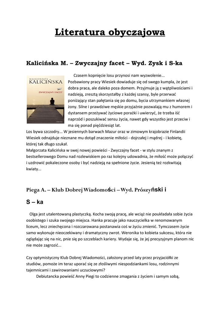 Literatura obyczajowa Kalicińska M. – Zwyczajny facet – Wyd. Zysk i S-ka Czasem kopnięcie losu przynosi nam wyzwolenie... Pozbawiony pracy Wiesiek dowiaduje się od swego kumpla, że jest dobra praca, ale daleko poza domem. Przyjmuje ją z wątpliwościami i nadzieją, zresztą skorzystałby z każdej szansy, byle przerwać poniżający stan pałętania się po domu, bycia utrzymankiem własnej żony. Silne i prawdziwe męskie przyjaźnie pozwalają mu z humorem i dystansem przeżywać życiowe porażki i uwierzyć, że trzeba iść naprzód i poszukiwać sensu życia, nawet gdy wszystko jest przeciw i ma się ponad pięćdziesiąt lat. Los bywa szczodry... W jesiennych barwach Mazur oraz w zimowym krajobrazie Finlandii Wiesiek odnajduje nieznane mu dotąd znaczenie miłości - dojrzałej i mądrej - i kobietę, której tak długo szukał. Małgorzata Kalicińska w swej nowej powieści - Zwyczajny facet - w stylu znanym z bestsellerowego Domu nad rozlewiskiem po raz kolejny udowadnia, że miłość może połączyć i uzdrowić pokaleczone osoby i być nadzieją na spełnione życie. Jesienią też rozkwitają kwiaty... Piega A. – Klub Dobrej Wiadomości – Wyd. Prószyński i S – ka Olga jest utalentowaną plastyczką. Kocha swoją pracę, ale wciąż nie poukładała sobie życia osobistego i szuka swojego miejsca. Hanka pracuje jako nauczycielka w renomowanym liceum, lecz zniechęcona i rozczarowana postanawia coś w życiu zmienić. Tymczasem życie samo wykonuje nieoczekiwany i dramatyczny zwrot. Weronika to kobieta sukcesu, która nie oglądając się na nic, pnie się po szczeblach kariery. Wydaje się, że jej precyzyjnym planom nic nie może zagrozić... Czy optymistyczny Klub Dobrej Wiadomości, założony przed laty przez przyjaciółki ze studiów, pomoże im teraz uporać się ze złośliwymi niespodziankami losu, rodzinnymi tajemnicami i zawirowaniami uczuciowymi? Debiutancka powieść Anny Piegi to codzienne zmagania z życiem i samym sobą, barwne postacie, magiczny Kraków i Tatry, a przede wszystkim głęboka wiara w przyjaźń i dobro, które jest w każdym z nas. Fante J. – Pył – Wyd. G+J Gruner + Jahr Polska Los Angeles lat trzydziestych XX wieku. Młody Włoch Arturo Bandini marzy o karierze pisarskiej. Mieszka w hotelu. Kiedy kończą mu si ę pieniądze, z ostatnią pięciocentówką w kieszeni udaje się do pobliskiego baru, gdzie jako kelnerka pracuje piękna Meksykanka Camilla. Ich spotkanie jest początkiem burzliwego związku, pełnego intensywnej zmysłowości i pożądania. Oboje będą desperacko szukać szczęścia i swojego miejsca w życiu, walcząc z załamaniem i poczuciem klęski. Pearse L. – Gypsy – Firma Księgarska Jacek Olesiejuk Nastoletni Beth i Sam Bolton zostają sierotami, ich maleńka siostrzyczka trafia do nowego domu, oni zaś również postanawiają poszukać nowego życia… w Ameryce. Na pokładzie płynącego do Nowego Jorku parowca Beth i Sam spotykają charyzmatycznego hazardzistę Theo oraz bystrego londyńczyka Jacka i we czwórkę postanawiają połączyć siły, żeby odnaleźć swoje szczęście. Beth zawsze marzyła o koncertach skrzypcowych przed liczną publicznością… i niedługo w istocie odnosi wielki sukces w salonach. Jej wielbiciele nadają jej uroczy pseudonim Gypsy. Czworo przyjaciół zadziera jednak z lokalnymi gangsterami i kiedy rozchodzi się wieść o znalezieniu złota w Klondike, uciekają do Kanady. Przedzierając się przez ośnieżone szczyty i zdradzieckie wodospady, wyruszają w niebezpieczną i epicką podróż do doliny Yukonu. Kto załamie się pierwszy? Przystojny, lecz zachłanny łobuz Theo? Łatwo poddający się wpływowi pieniędzy, marzyciel Sam? Oddany przyjaciołom, praktyczny Jack? Czy też może Beth, kobieta o duszy Cyganki, której bardziej zależy na muzyce niż złocie? Literatura sensacyjna Caine R. – Wampiry z Morganville ks.4 – Wyd. Amber Na Morganville spłynęła cisza... …przed krwawą burzą, której zapobiec może tylko śmiertelna siedemnastolatka… W Morganville zapanował spokój. Claire może wrócić na uniwersytet i spędzać czas ze swoim chłopakiem, a Eve dostaje rolę w sztuce teatralnej. Lecz porządek zaprowadzony przez nieśmiertelną władczynię miasta nie trwa długo. Mnożą się tajemnicze ataki na jej poddanych. Wkrótce pojawia się nowa groza – bunt i szaleństwo. Czy żeby przeżyć kolejną noc, Claire i jej przyjaciele będą musieli porzucić miasto wampirów? Cussler C. – Statek śmierci – Wyd. Amber Biblijna plaga, straceńcza misja i akcja non stop w najnowszej odsłonie przygód „Oregona" Rok 1943. Niemiecki samolot zwiadowczy zostaje zestrzelony u wybrzeży Norwegii. Podczas morderczej wędrówki przez lodowiec jedyny ocalały członek załogi odkrywa uwięziony w lodzie dziwny statek... Czasy współczesne. „Oregon" prowadzi tajną operację w Zatoce Perskiej i napotyka dryfujący statek pasażerski. Jego pokład jest usłany setkami trupów. Zanim ktokolwiek zdąży ustalić przyczynę tragedii, na statku eksplodują ładunki wybuchowe. Od podziemnej bazy na Filipinach, gdzie ukryto zagadkowe starożytne tablice, po ponury bunkier na greckiej wyspie - kapitan Cabrillo idzie tropem przerażającej tajemnicy. I staje do walki z przeciwnikiem, który w imię szalonej idei zamierza zgładzić połowę ludzkości... Preston D., Child L. – Taniec śmierci – Wyd. G+J Gruner +Jahr Dwaj bracia: jeden to najlepszy agent FBI, drugi - geniusz zbrodni. Przed laty rozdzieliła ich niepohamowana nienawiść. Teraz przyszła pora na morderstwo doskonałe i wyjątkowe wyzwanie: powstrzymaj mnie, jeśli zdołasz. Nieznany sprawca w okrutny sposób morduje przyjaciół agenta specjalnego FBI Pendergasta. Podejrzanym jest jego brat Diogenes. Przez wiele lat pracował nad planem zbrodni doskonałej. Prowadzący śledztwo porucznik Vincent D' Agosta ma zaledwie siedem dni na odnalezienie Diogenesa, który nie zawaha się prze